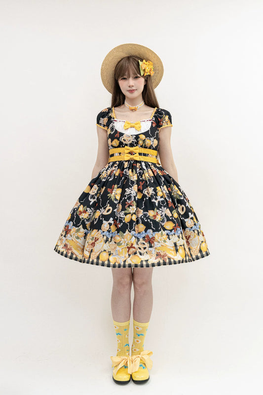 真夏のイエローギンガムチェック チェリー柄ジャンパースカート