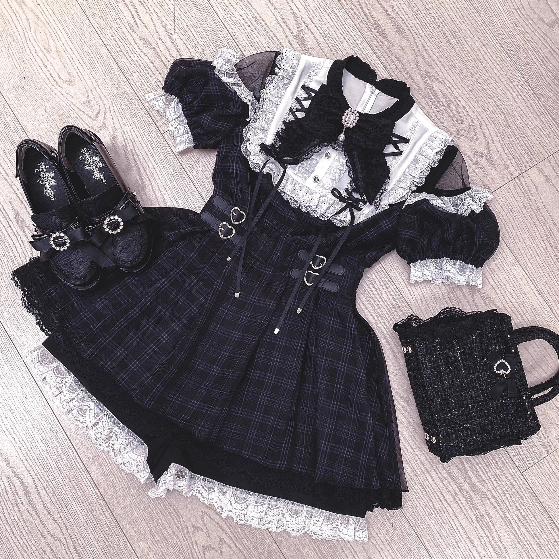 ブラックのにチェック柄に白のレースが映える半袖ワンピース。