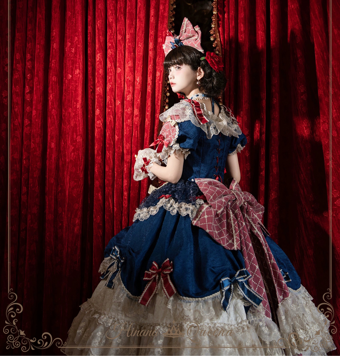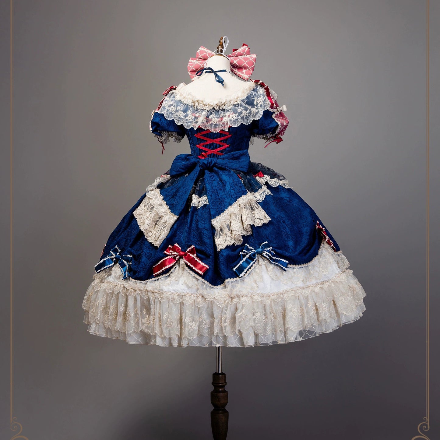 レースとフリルたっぷり、ひざ下丈が可愛らしい印象のプリンセスドレス。ネイビーは白雪姫風のコーデが楽しめます。
