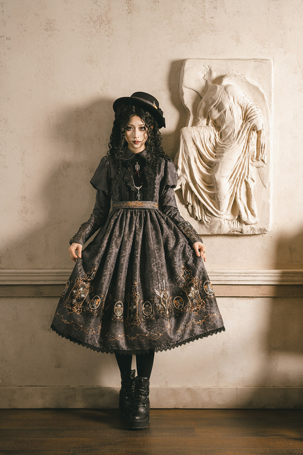 ゴシックな雰囲気のプリントで仕立てられたワンピース。ジャボタイと布ベルト付。