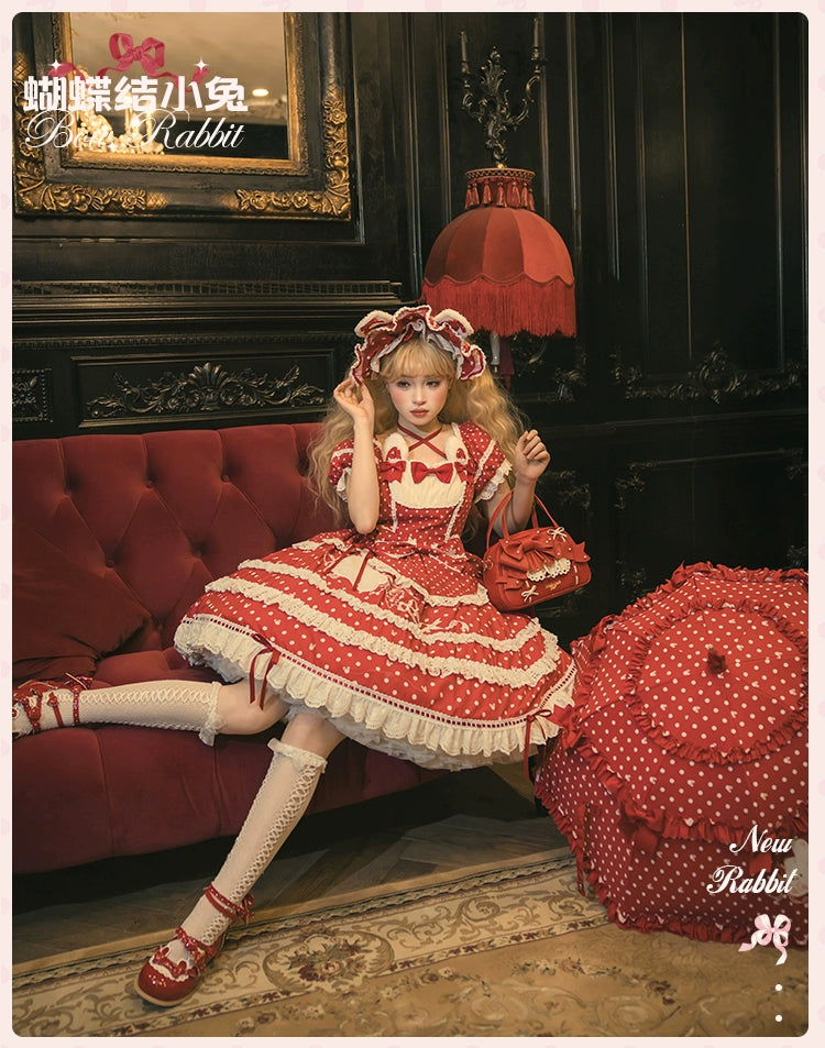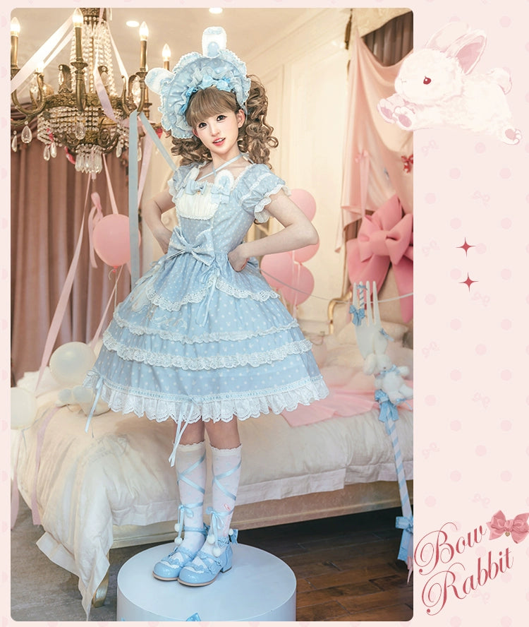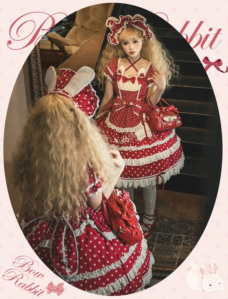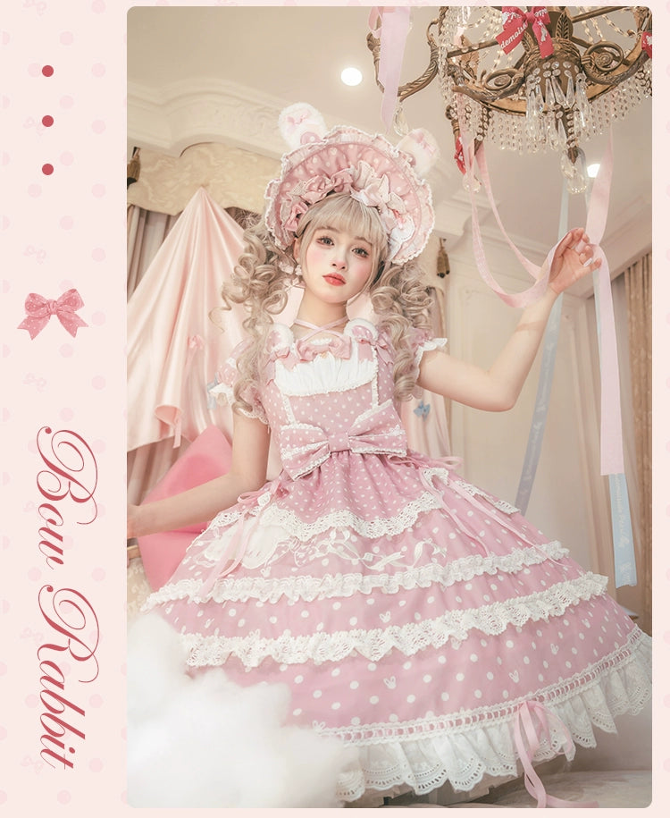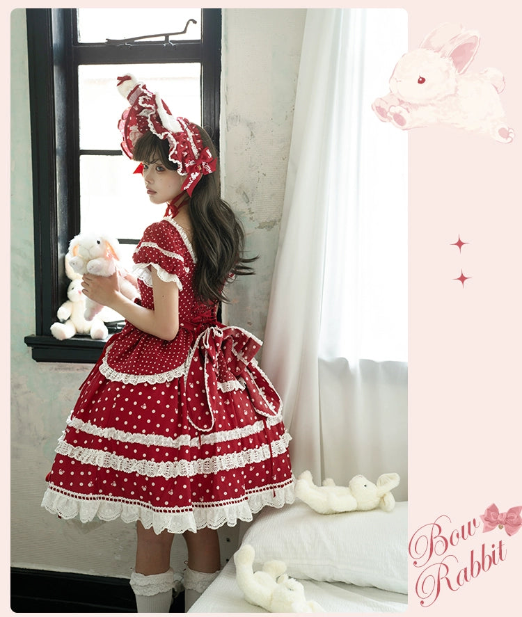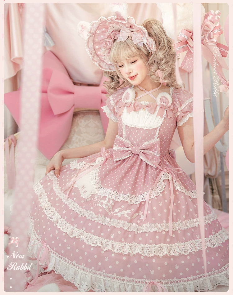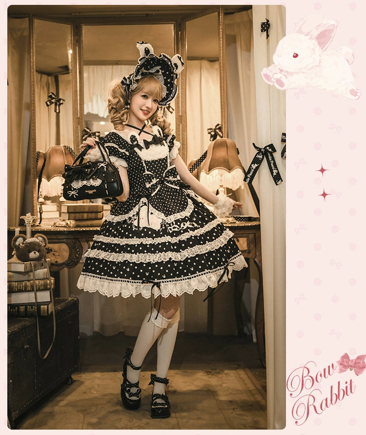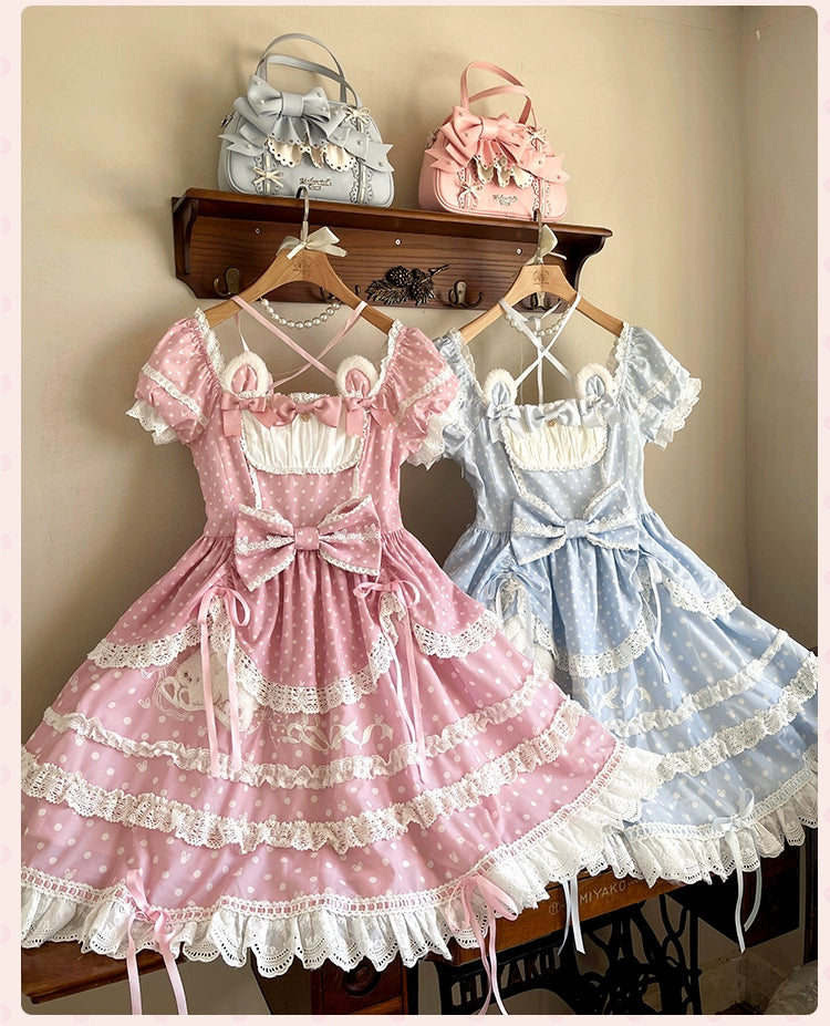 水玉模様にリボン、レースがあしらわれた半袖ワンピース。襟ぐりのうさ耳でさらにかわいく♡ブラック、レッド、パステルブルー、ペールピンク、ダークピンクの5色展開。