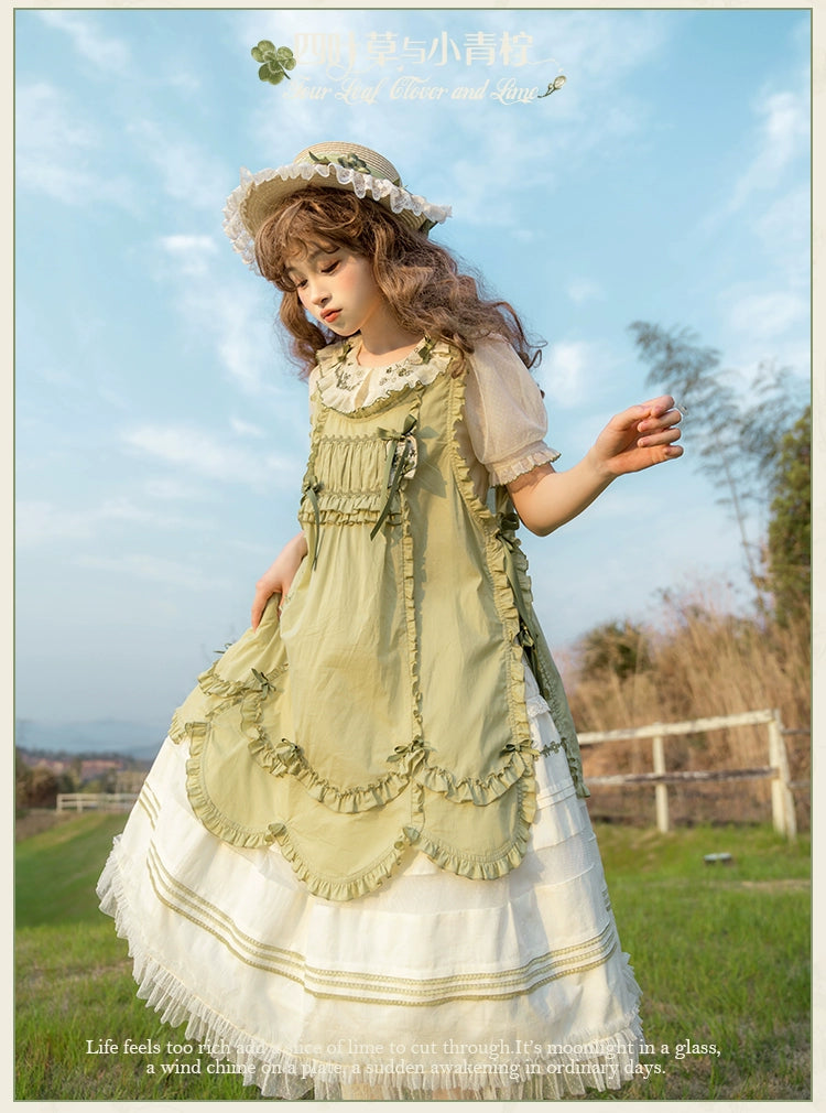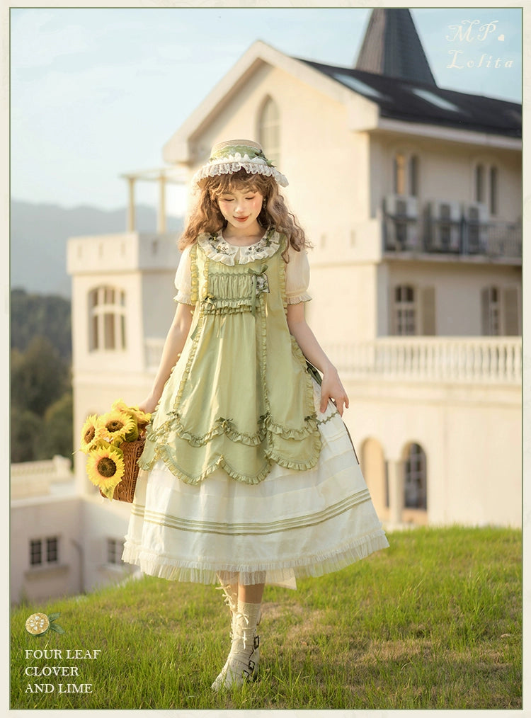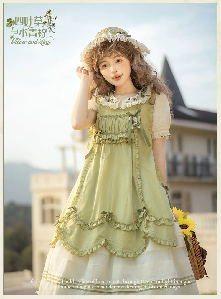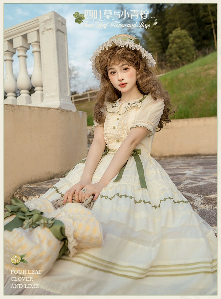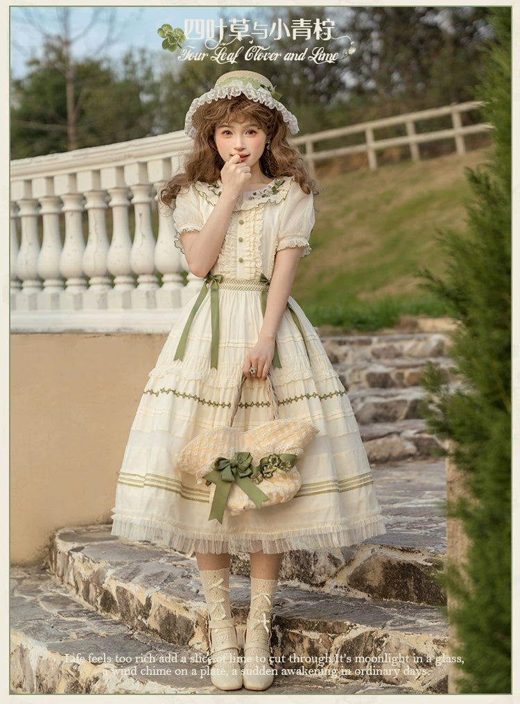 【受注予約5/18まで】Four Leaf Clover and Lime 刺繍襟のワンピース