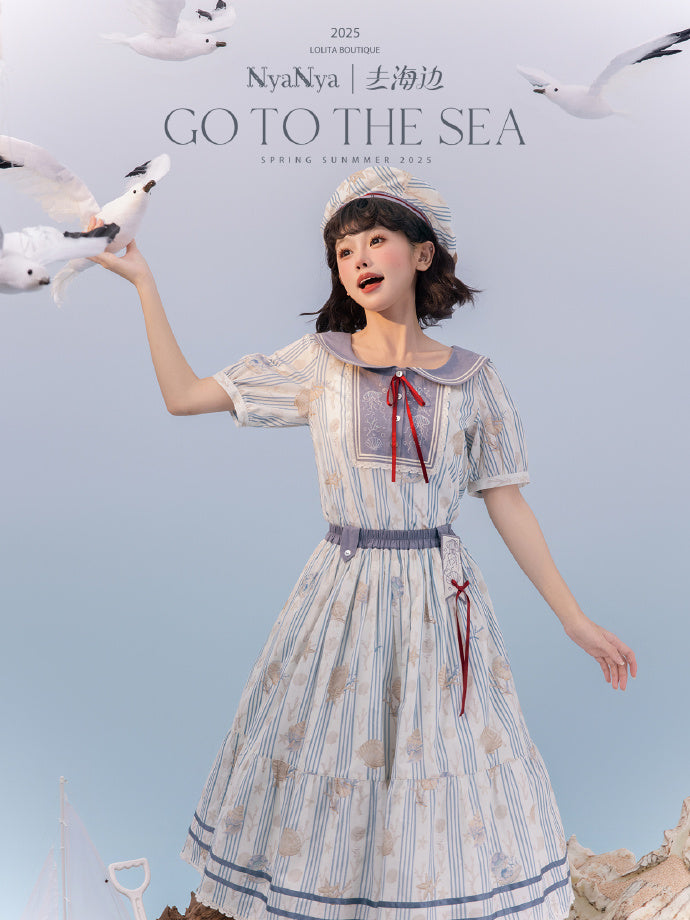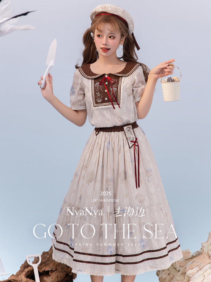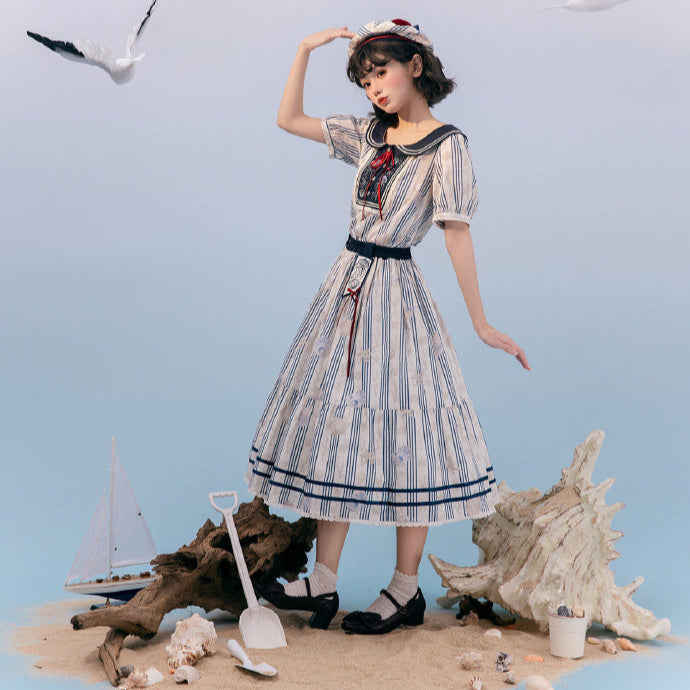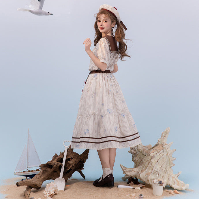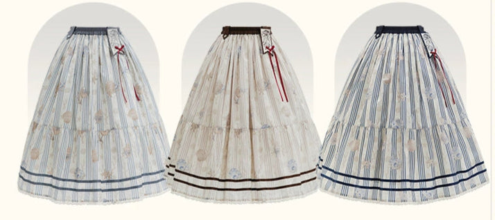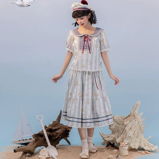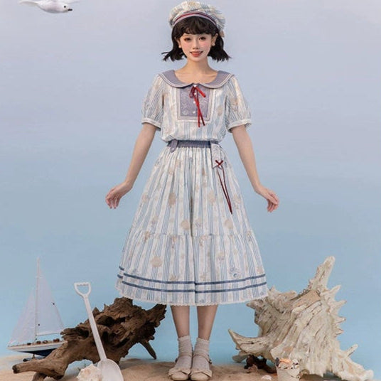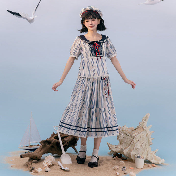 ストライプにビーチの貝殻プリントがさわやかなスカート。