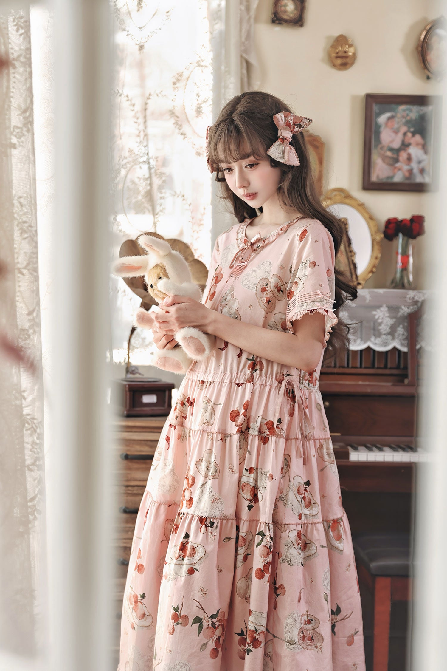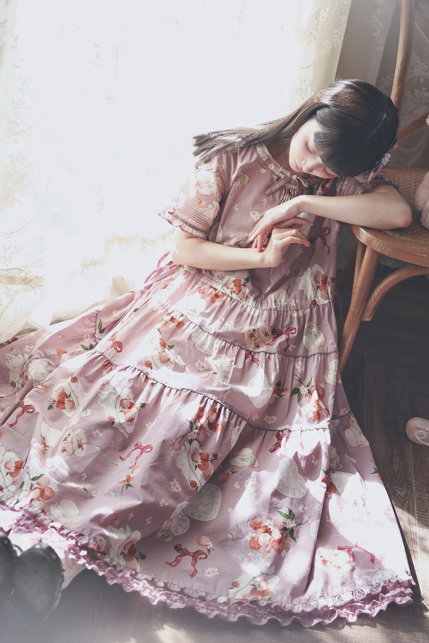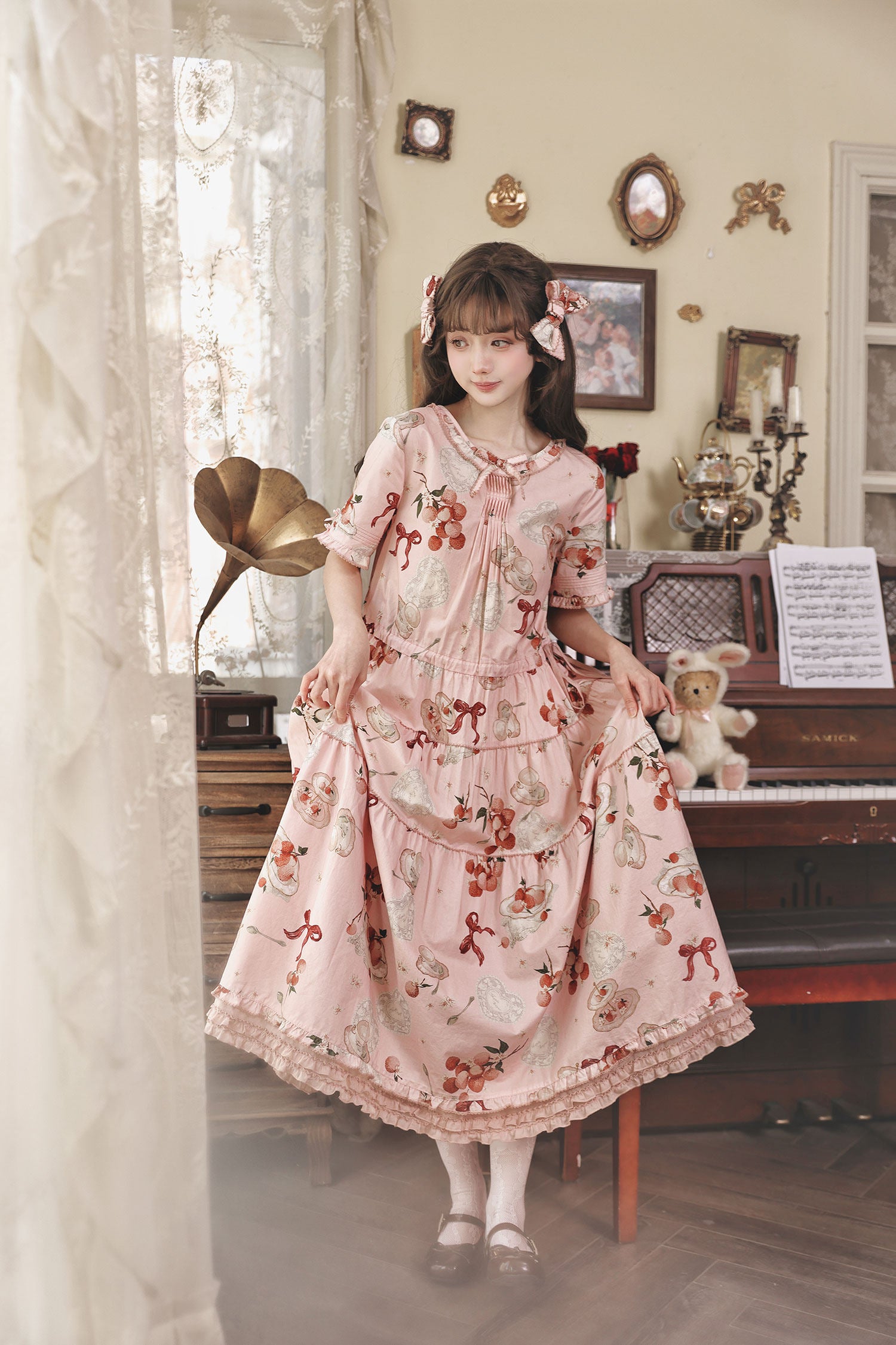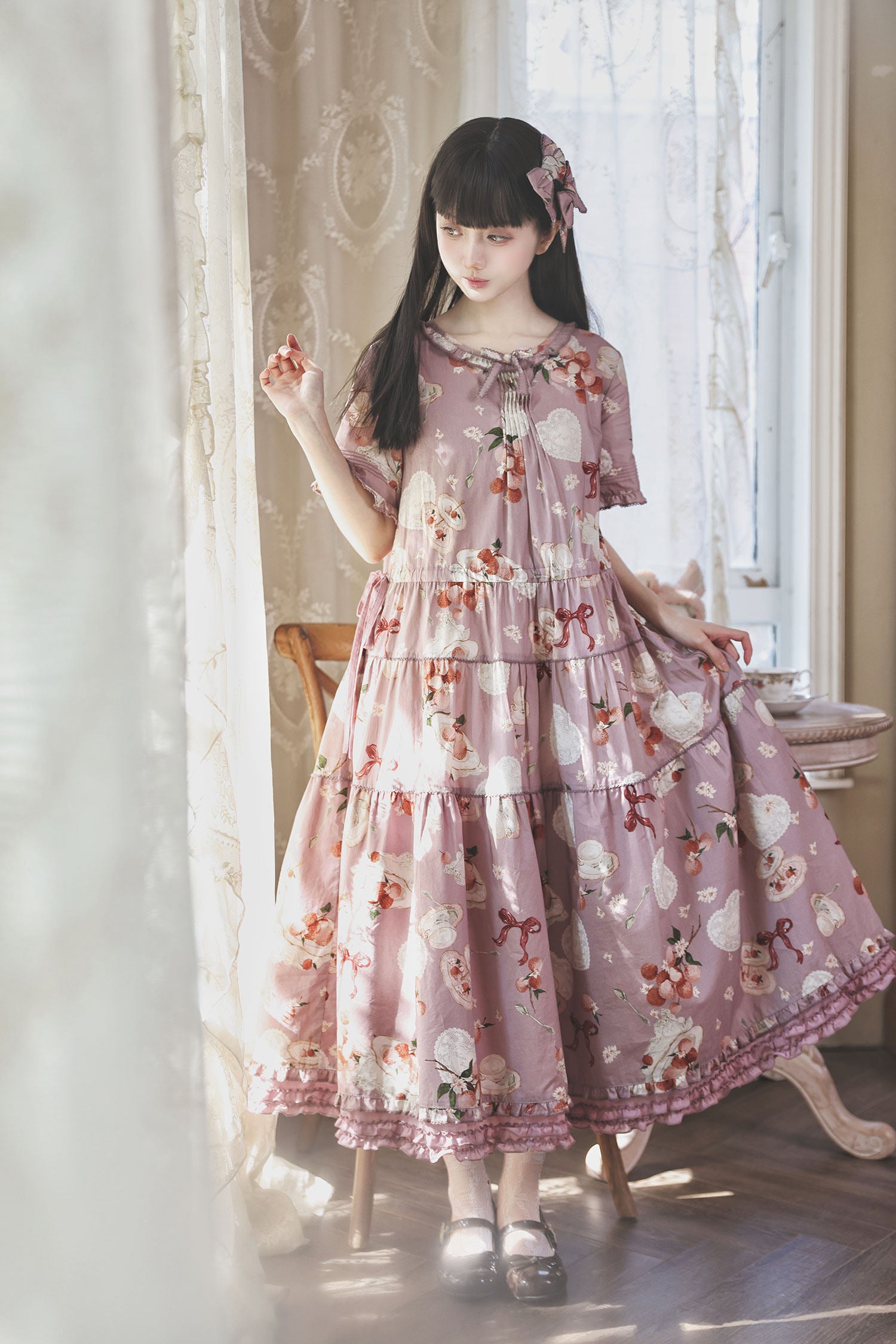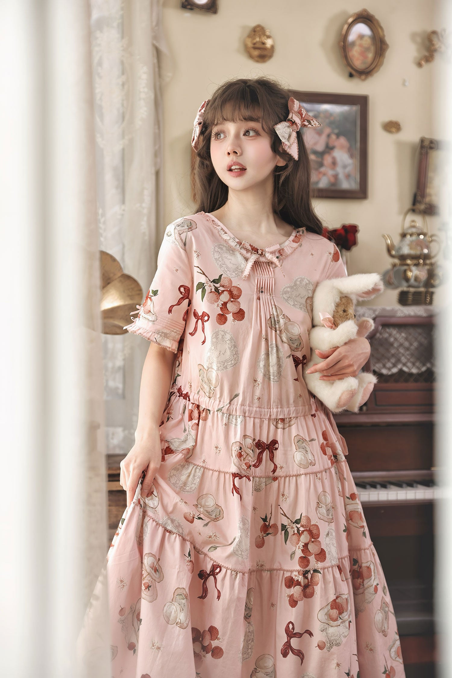 ライチとリボン、ティーセットがプリントされたワンピース。