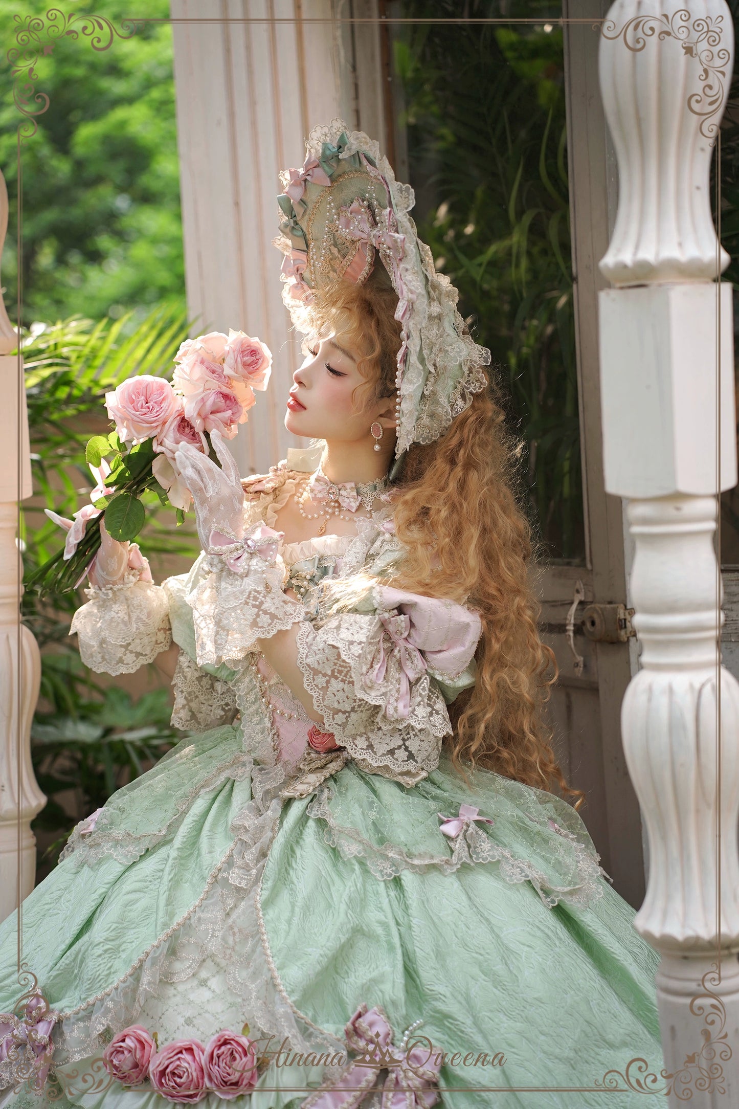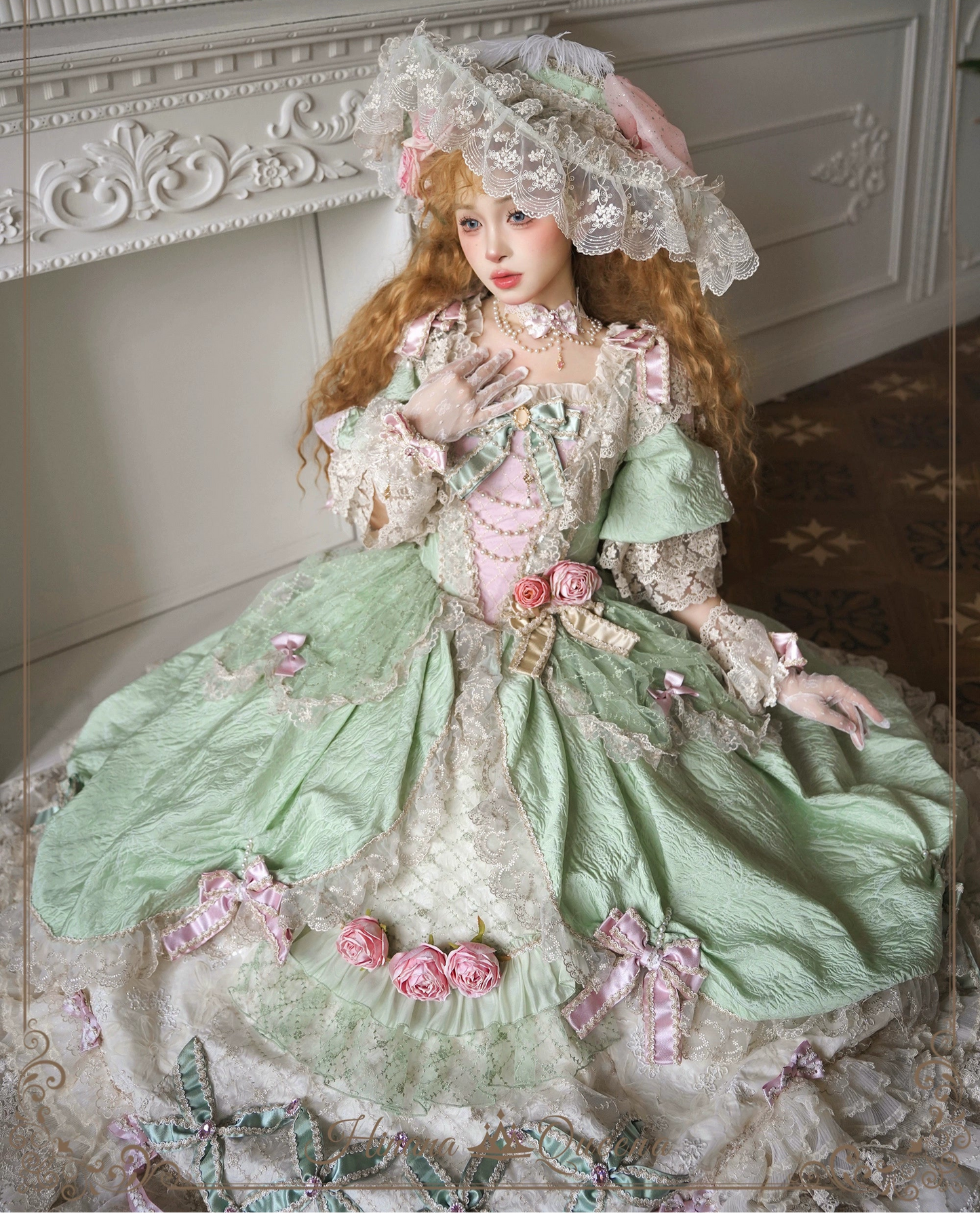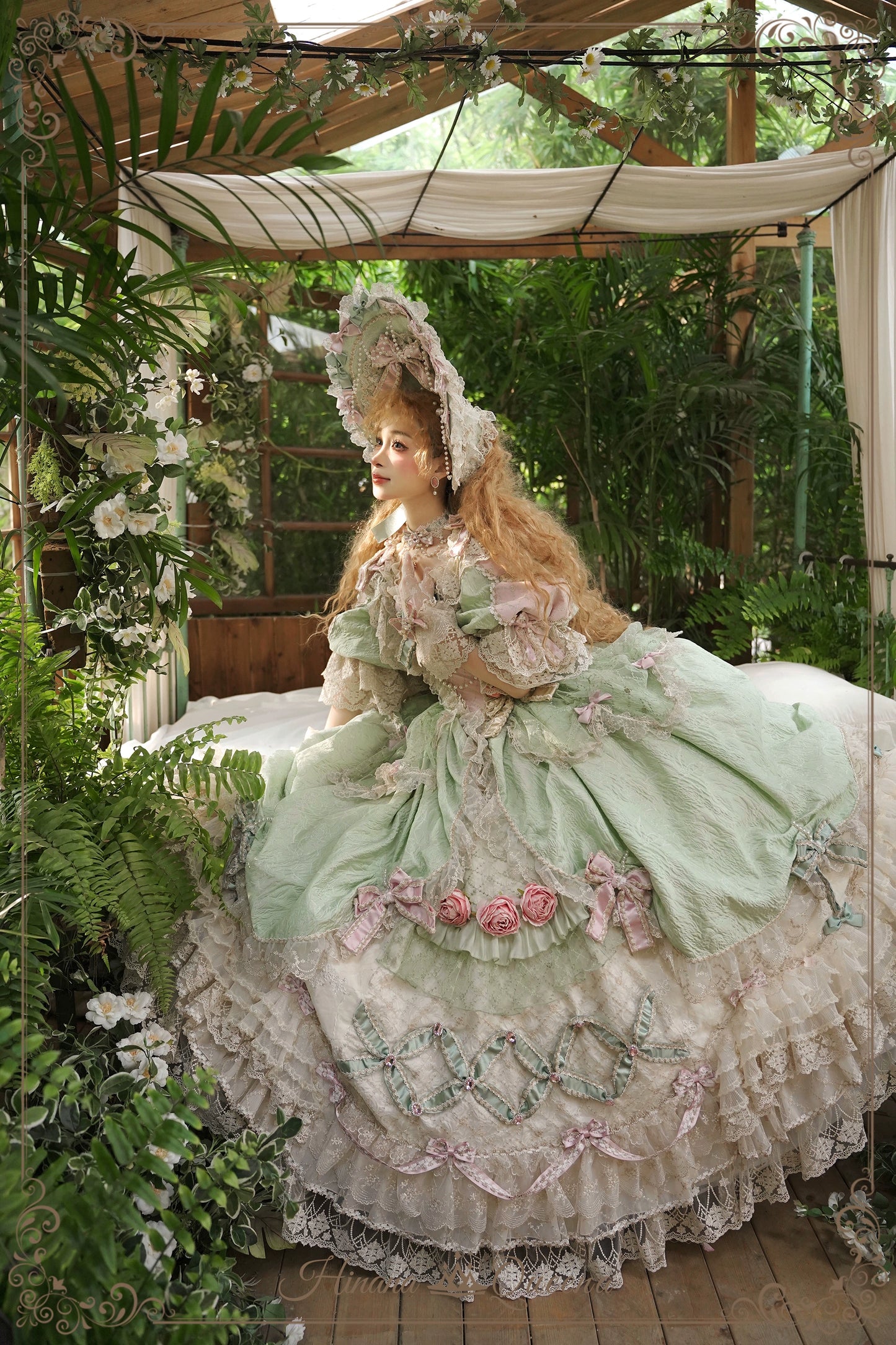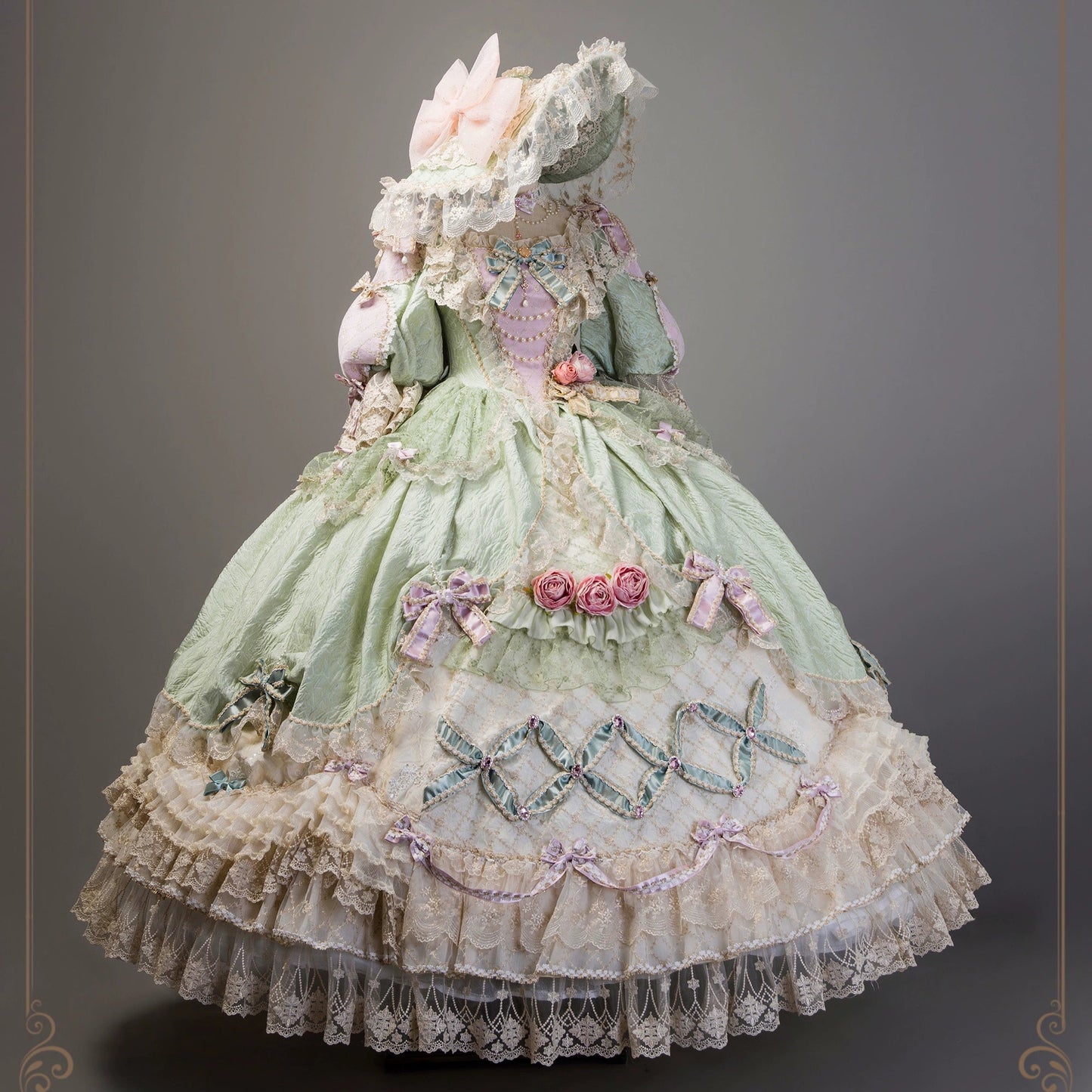 レースとフリルたっぷりのラグジュアリーなプリンセスドレス。パステルグリーンはピンクの差し色が妖精のような愛らしさに。
