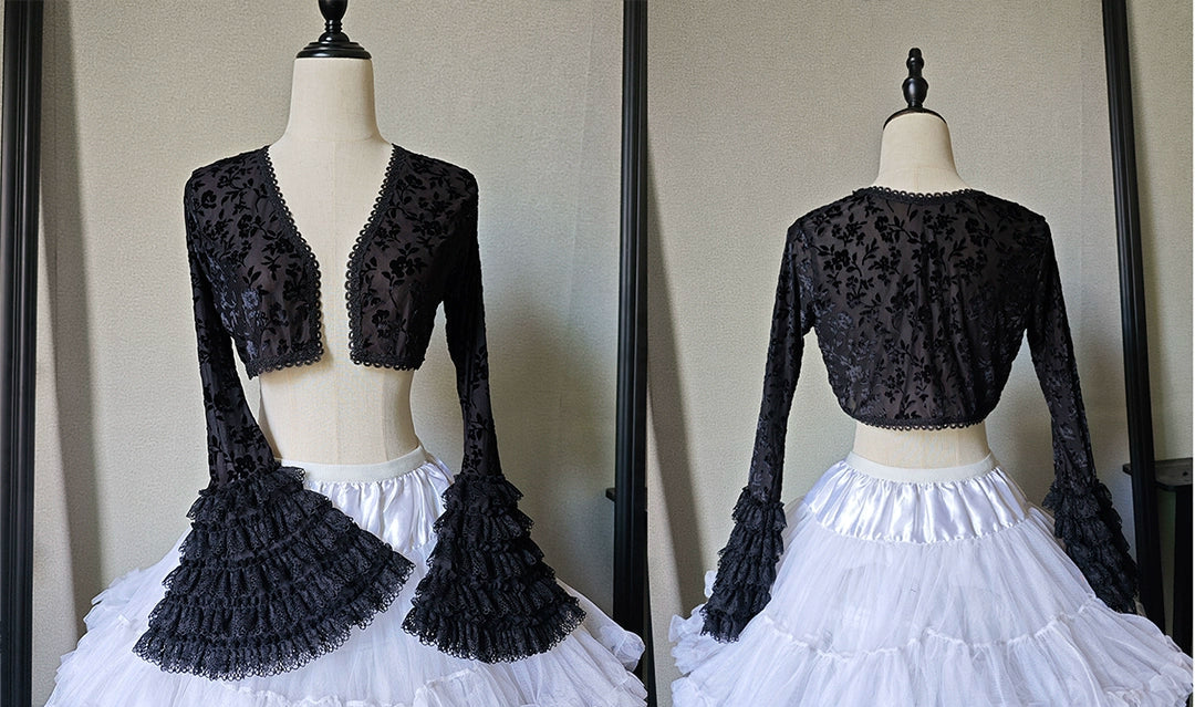 繊細なレースがあしらわれた姫袖ボレロ。ジャンパースカートとのコーディネートで、よりエレガントゴシックなコーデが楽しめます。