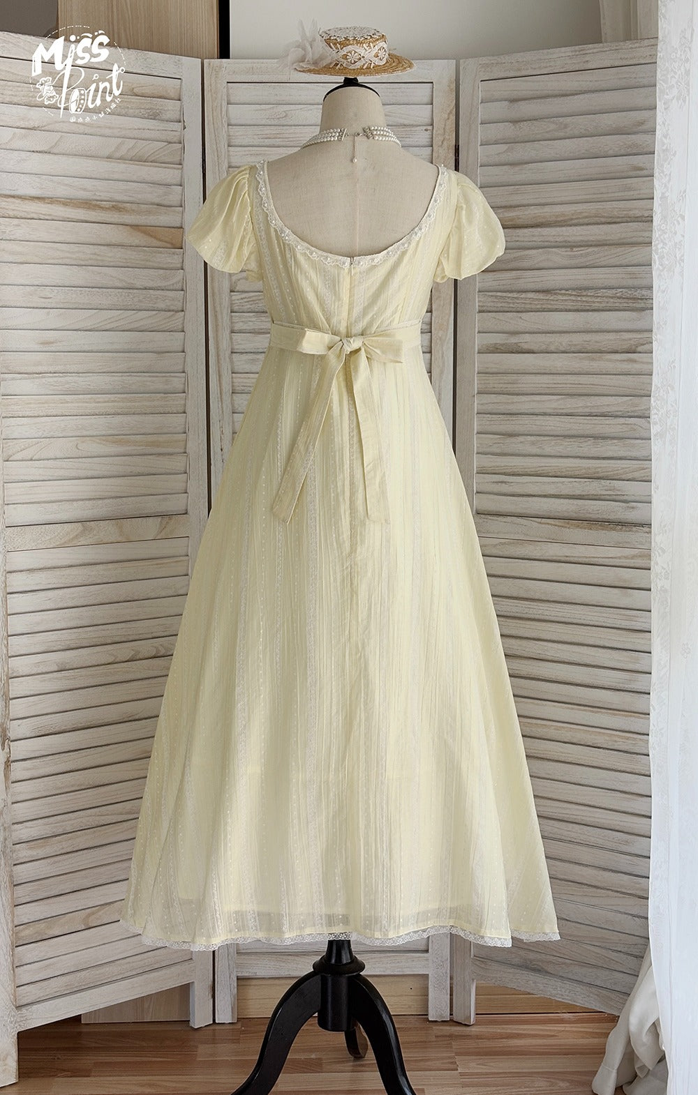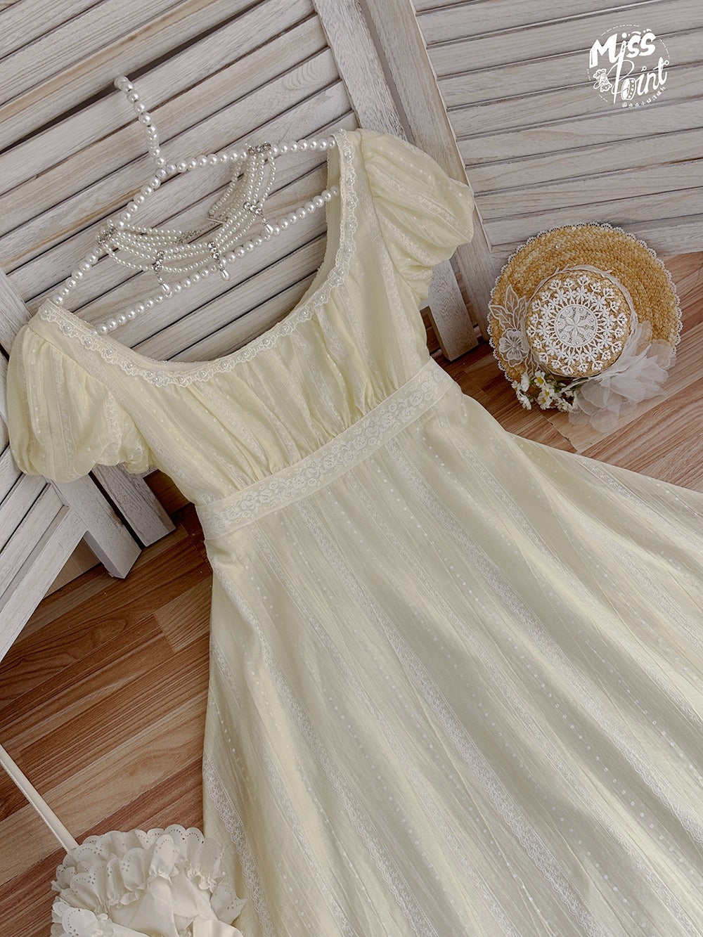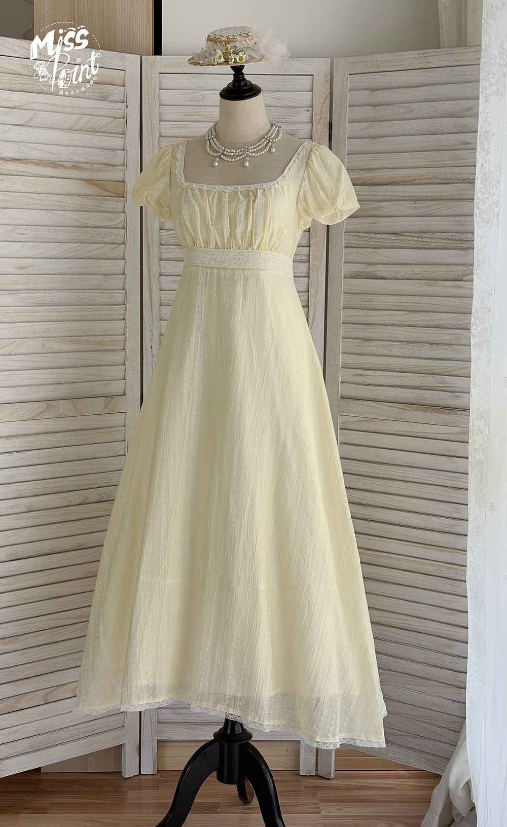 シアー素材にレース遣いがエレガントなエンパイアドレス。ホワイト、イエロー、パステルブルーの3色展開。