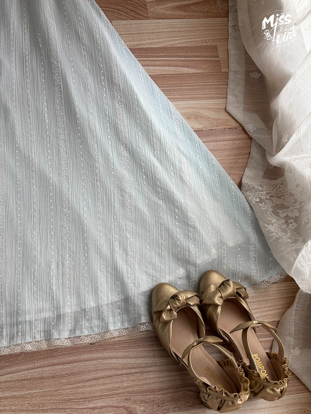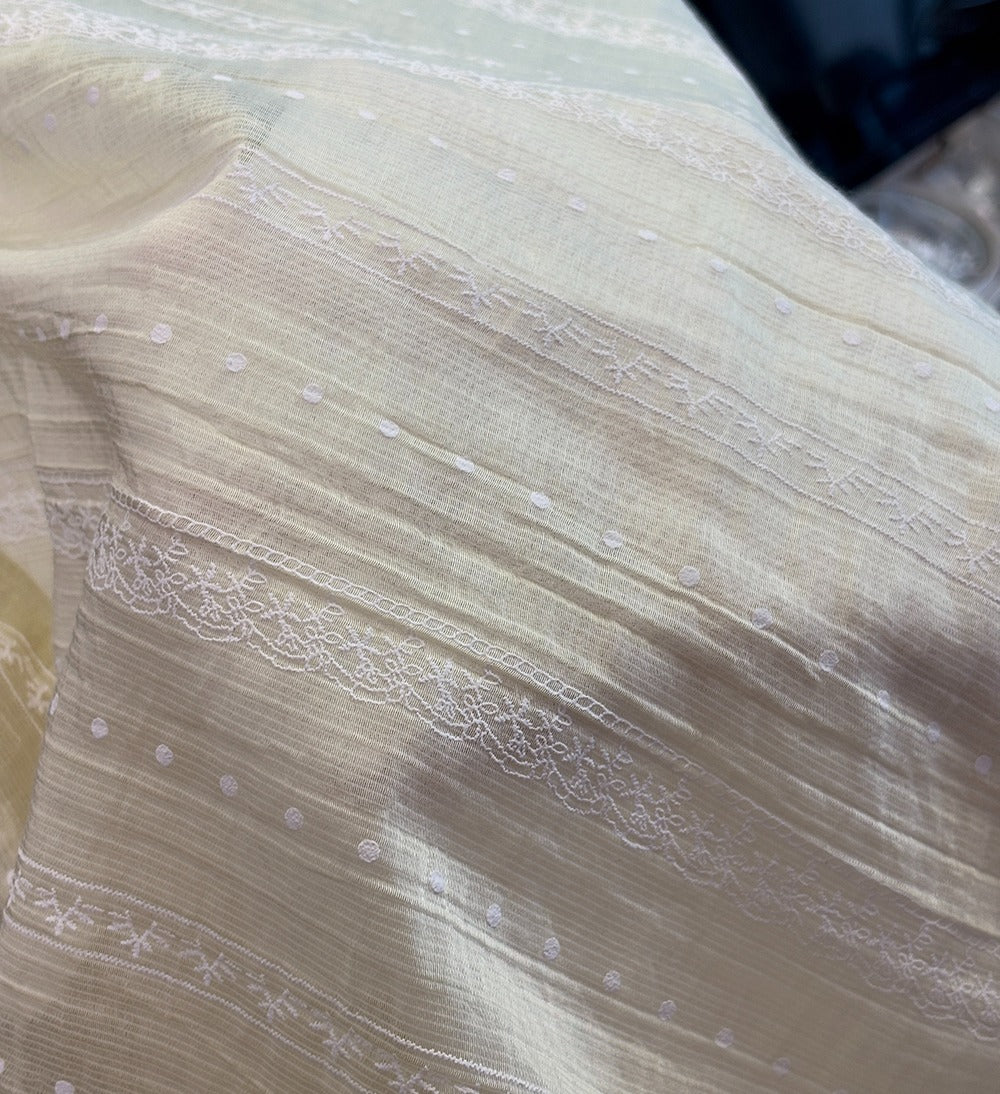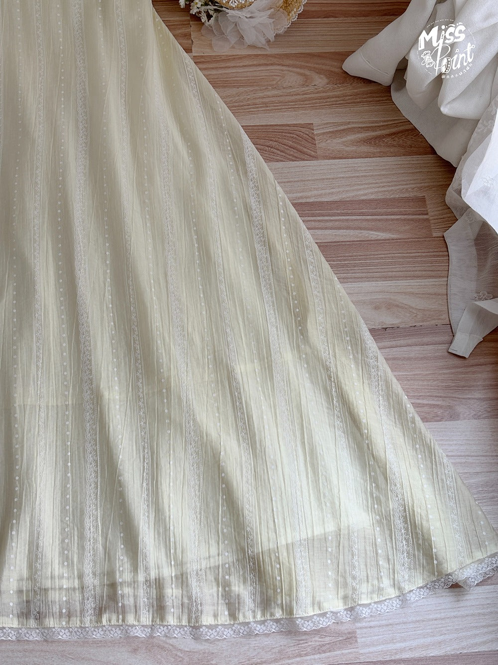 シアー素材にレース遣いがエレガントなエンパイアドレス。ホワイト、イエロー、パステルブルーの3色展開。