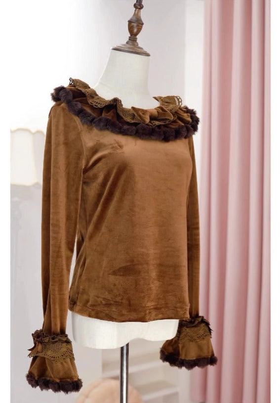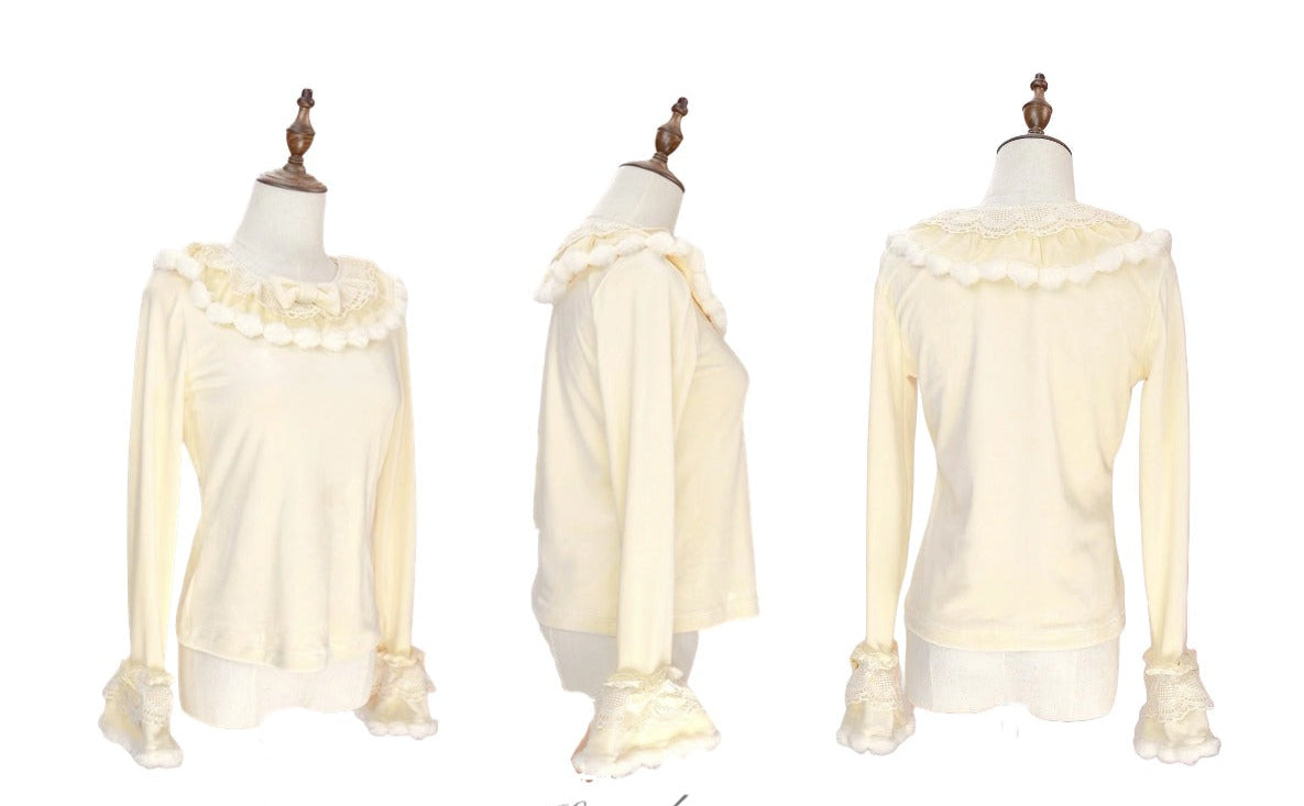 ベルベット素材にレースが可愛い長袖トップス。同シリーズのジャンパースカートやワンピースとのコーデがおすすめです。