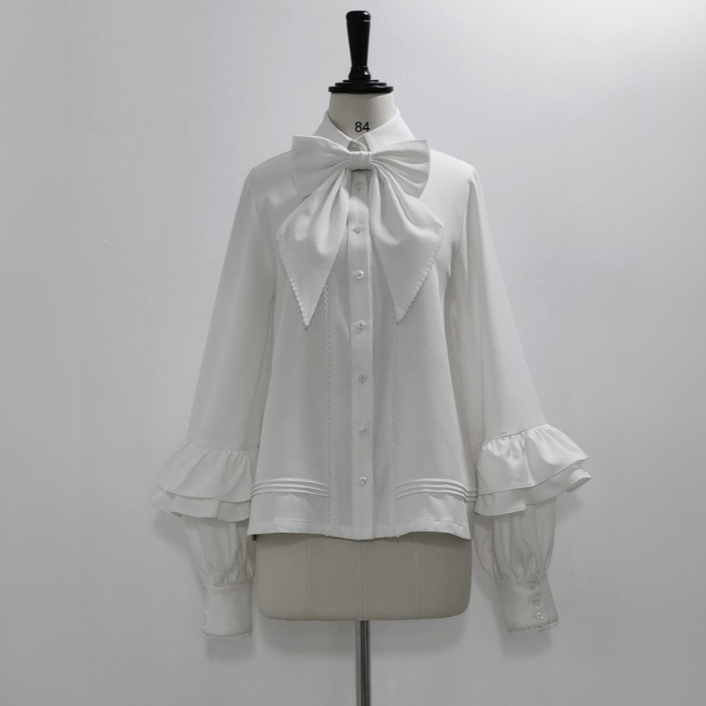 胸元の大きなリボンと袖部分の2段フリルが特徴的なブラウス。