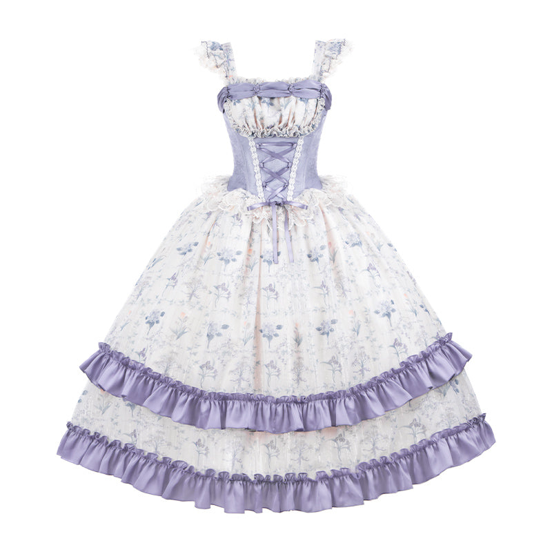 パープルのフリルがアクセントになっており、上半身はコルセットのようなデザインですっきりと着痩せして見えるデザインです♫