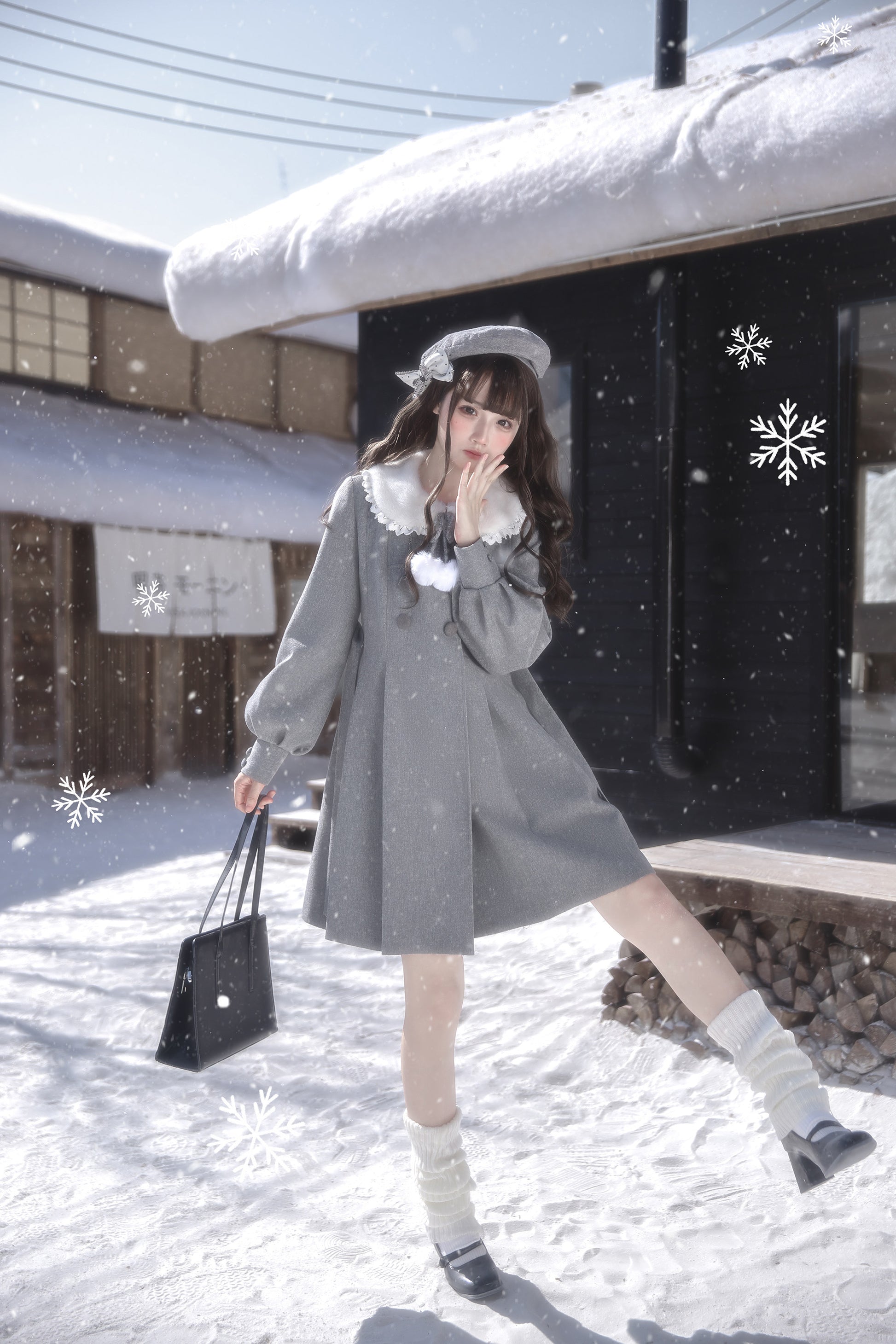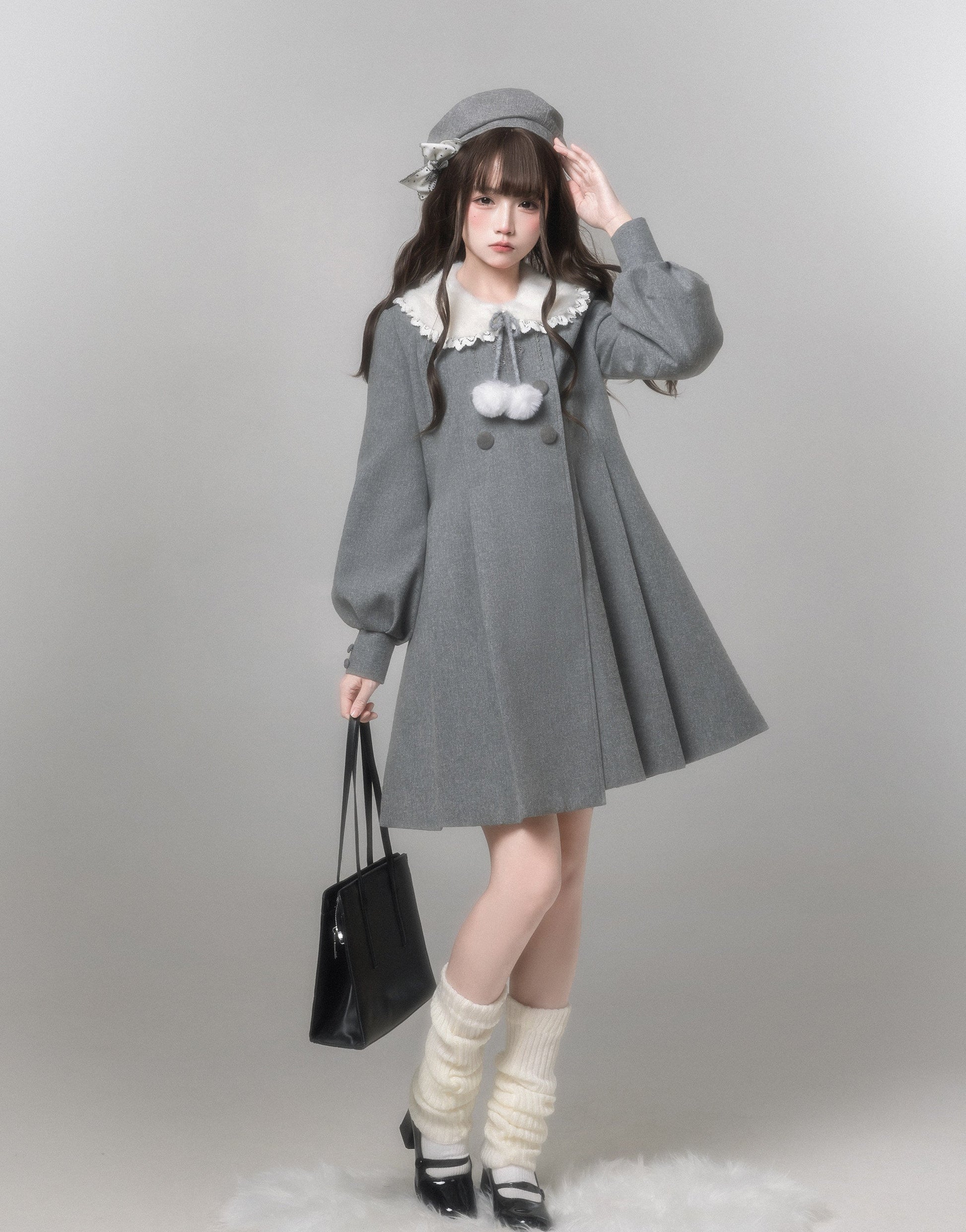 上品なグレーにレース、ポンポン付きの襟で甘さをプラスしたスイートなコート。