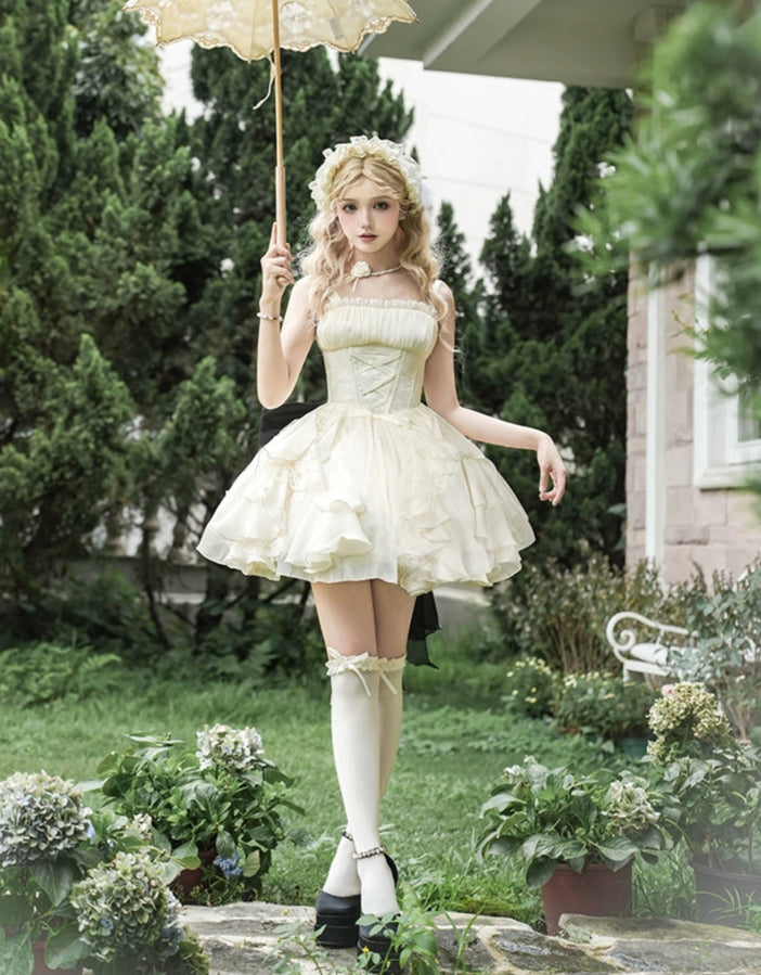 オフホワイトに胸元のレースアップとフリルがエレガントなジャンパースカート。