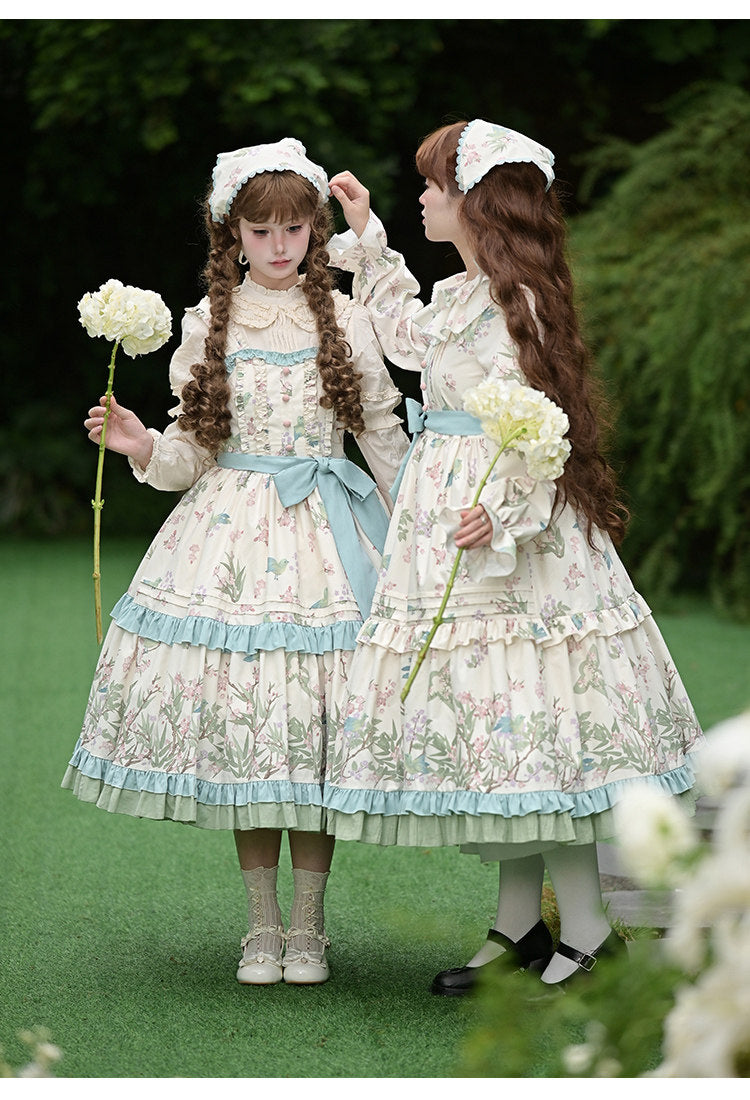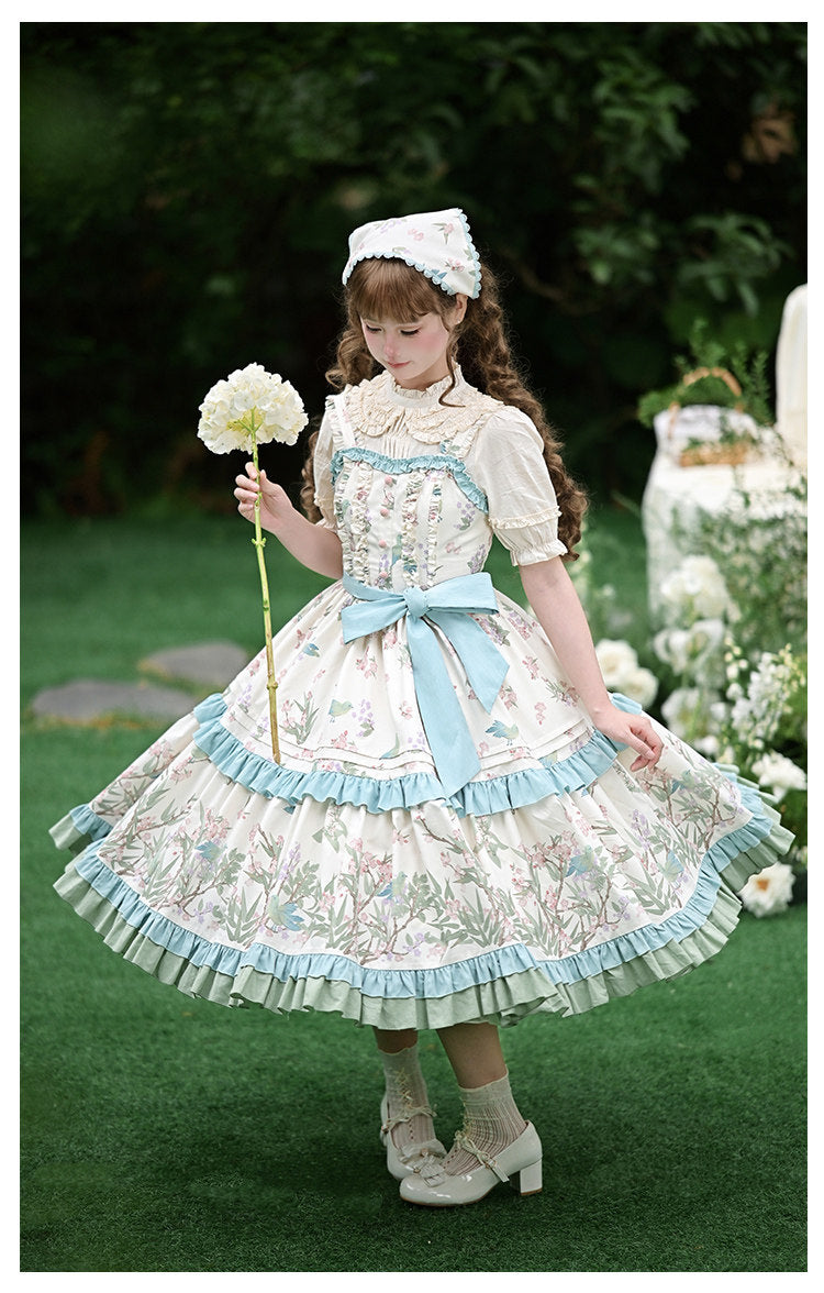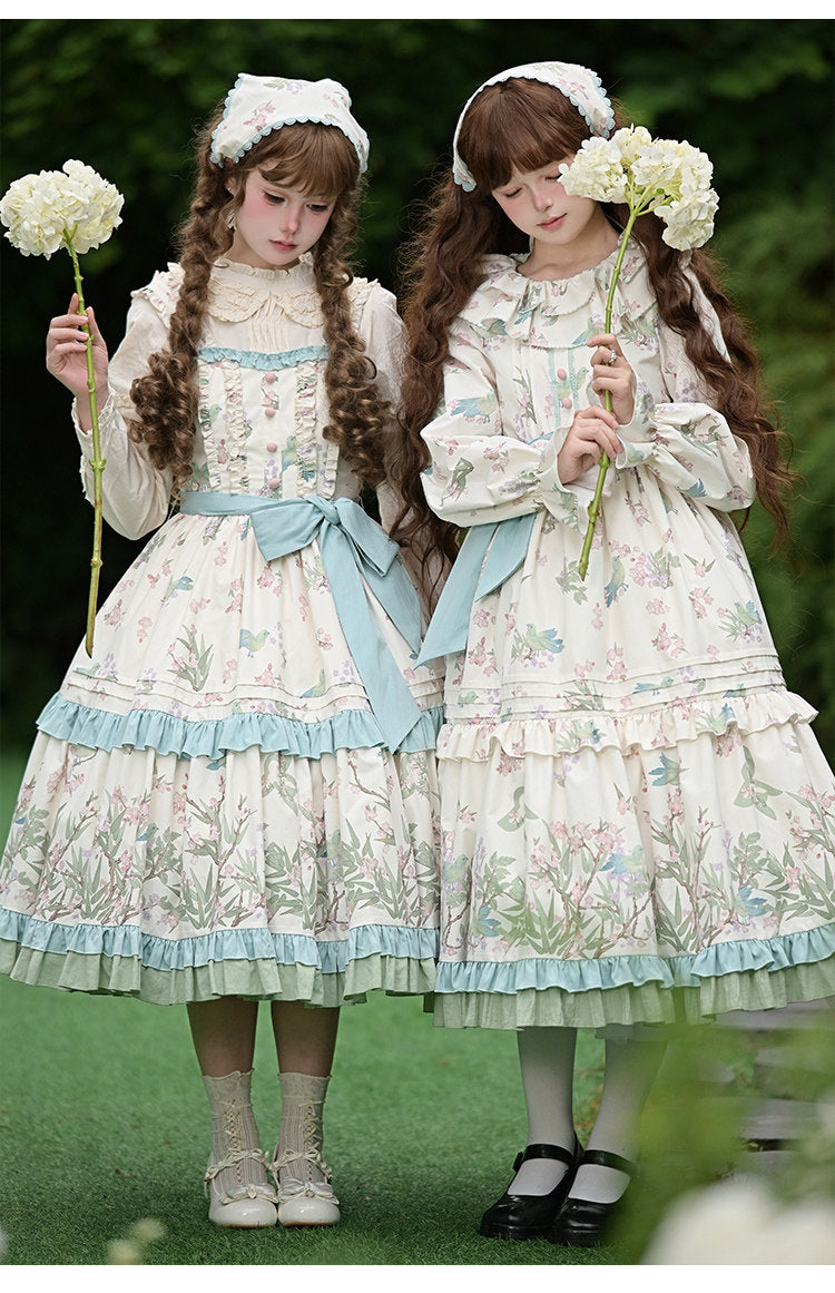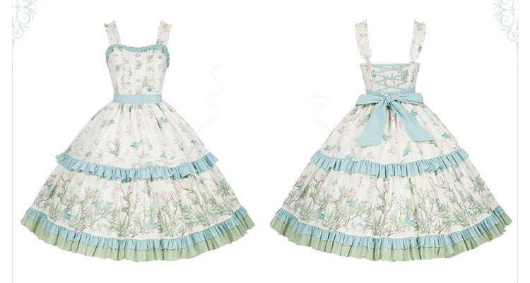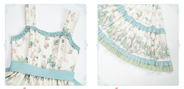 鶯がプリントされた可憐なジャンパースカート。布ベルト付。
