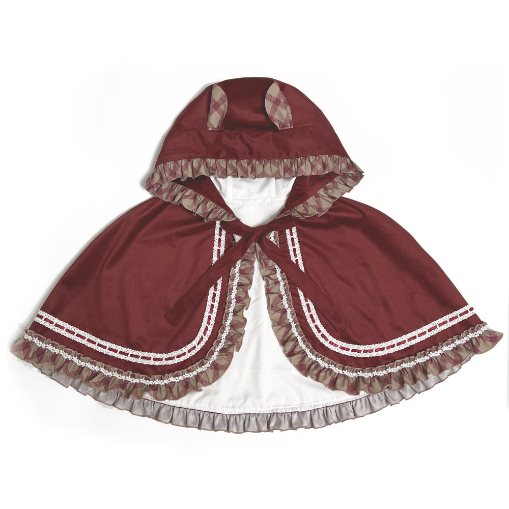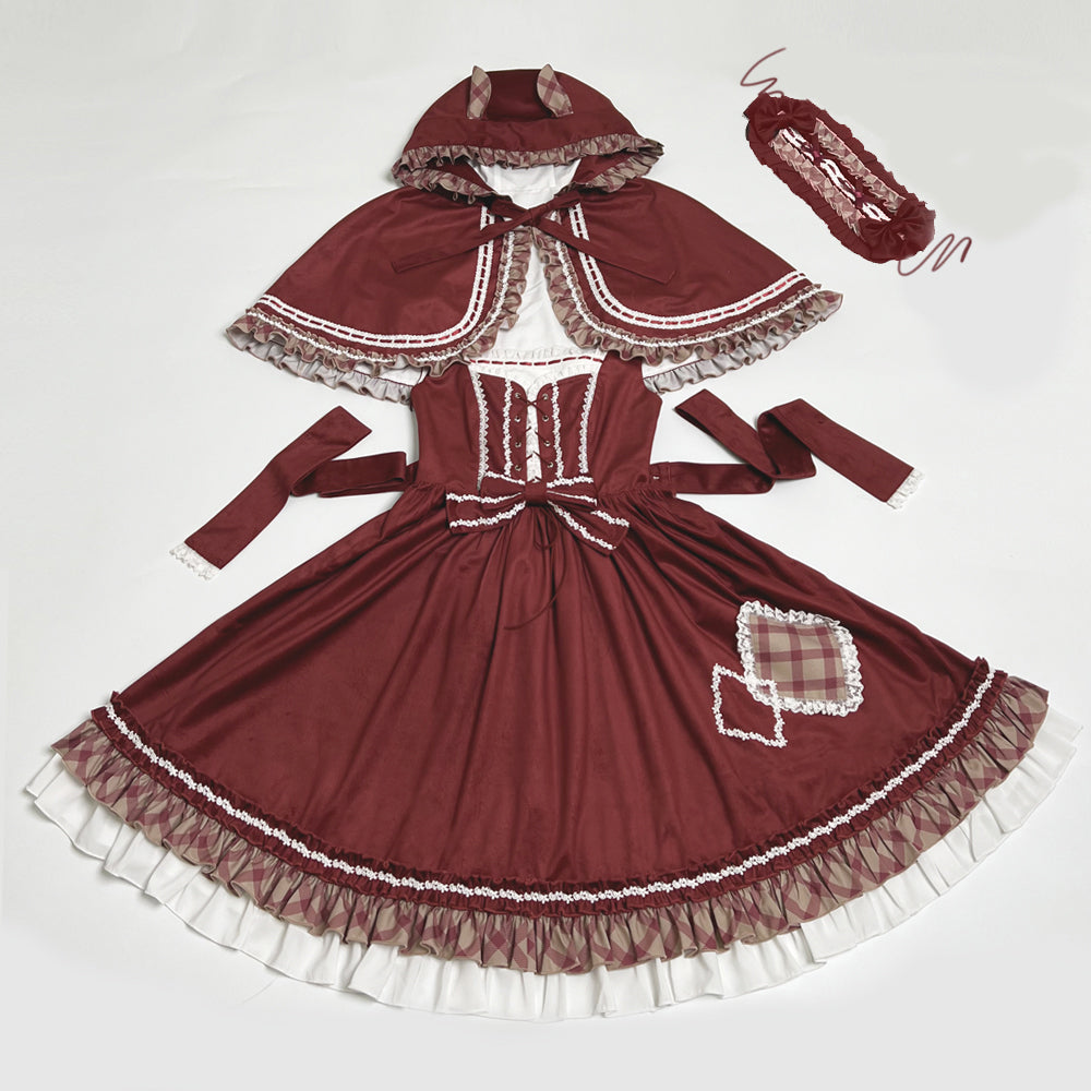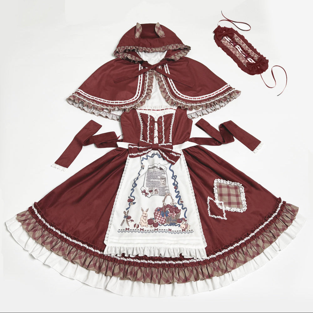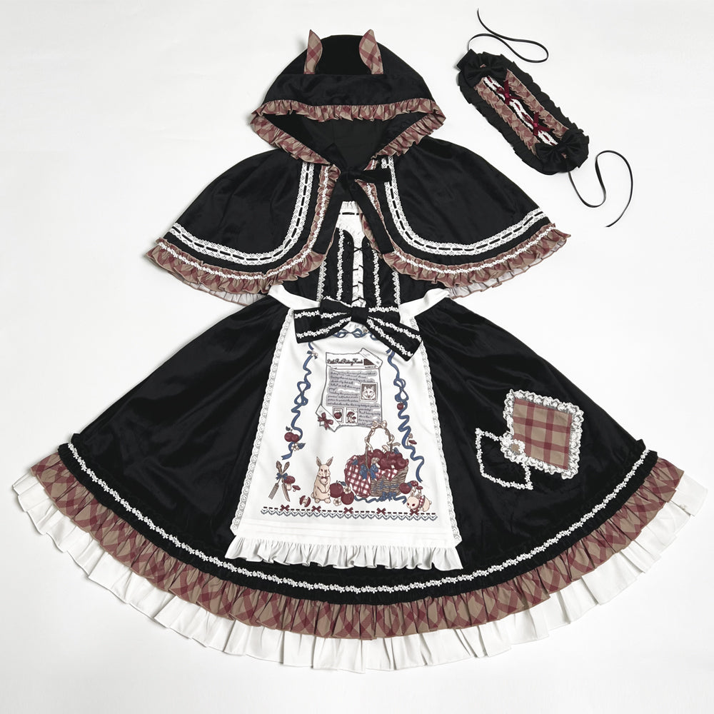 ケープとエプロンもセットになっていて、一緒に合わせれば、赤ずきんちゃん風の着こなしも楽しめます♡何通りもの着こなしができて、ヘッドドレスもついているので、ロリィタ初心者さんにもオススメです♡