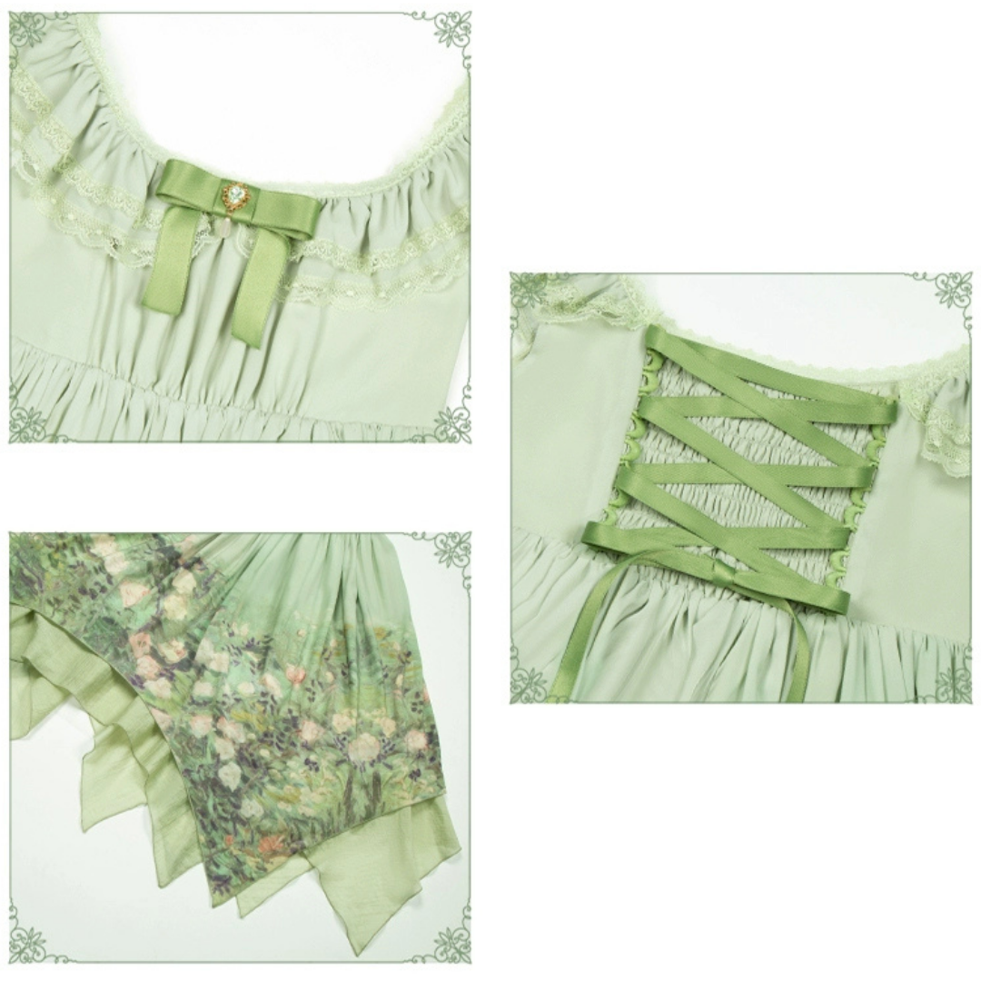 ゴッホの『ばら』からインスピレーションを得た油絵プリントのジャンパースカート。