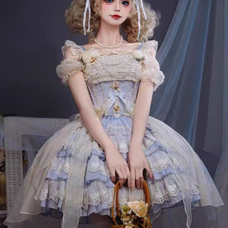 バラの涙 刺繍レースのミニ丈ジャンパースカート・サックス