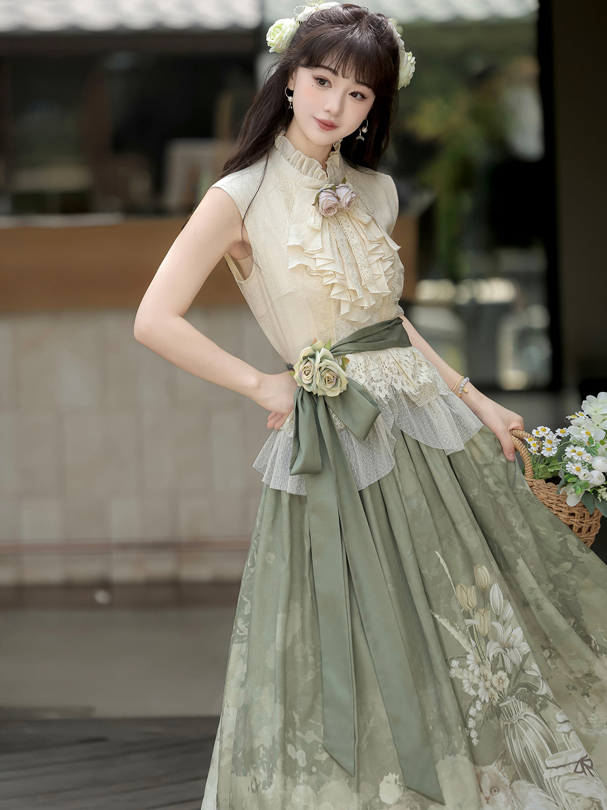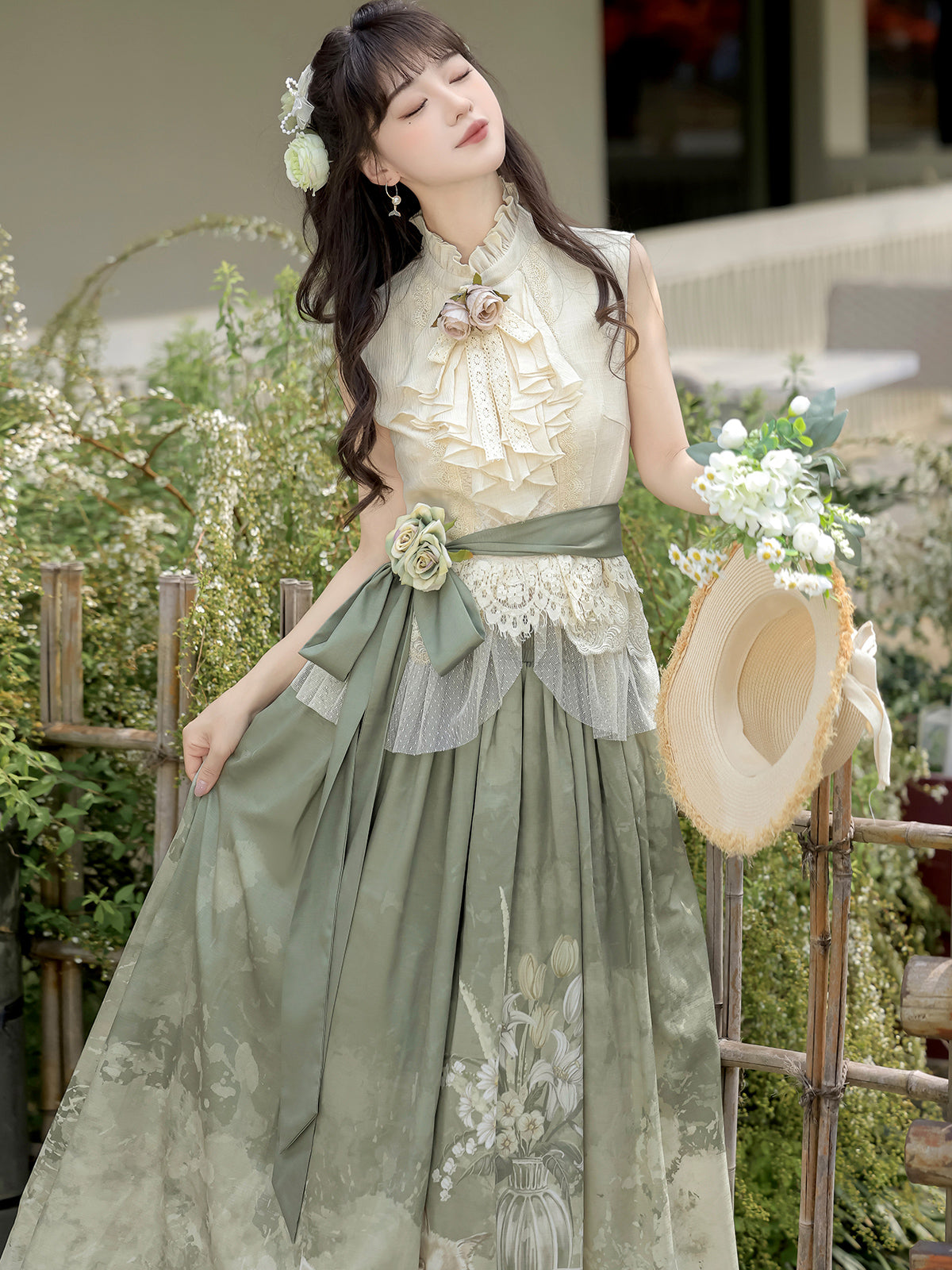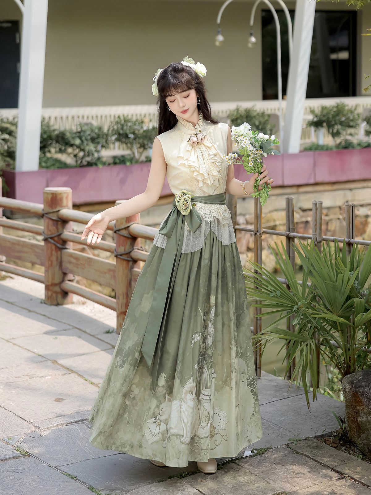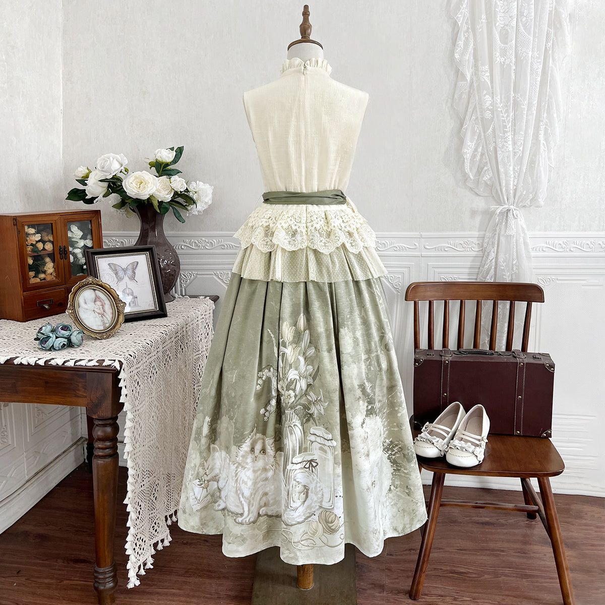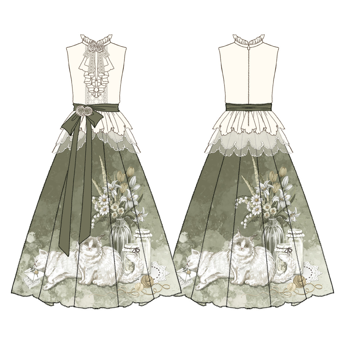 猫と百合の花などが描かれたお淑やかな印象のスカートセットアップ。