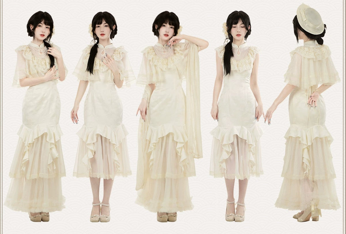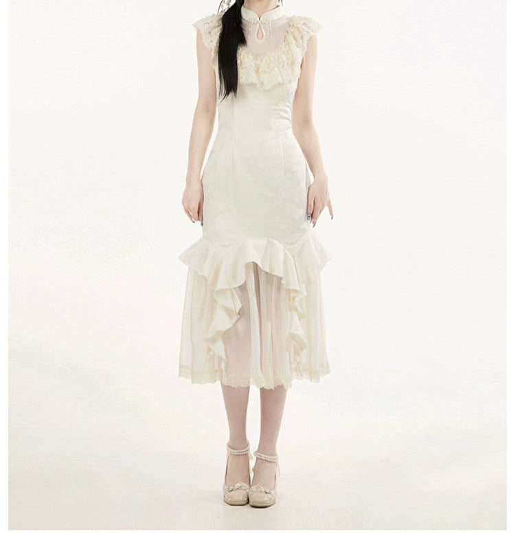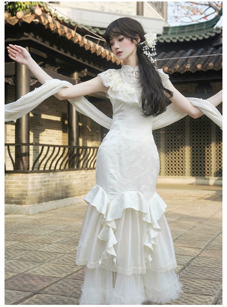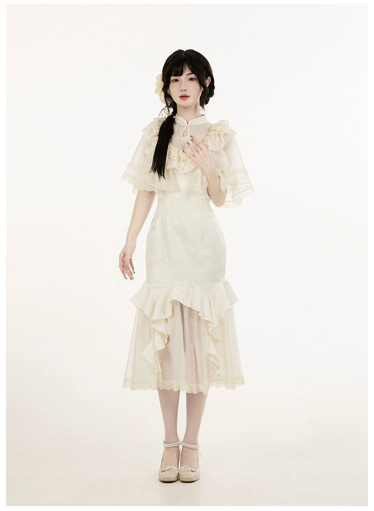 スカートのフリルとマーメイドラインが大人っぽいオフホワイトのチャイナ風ドレス。