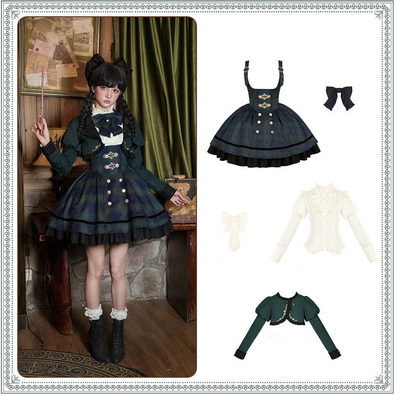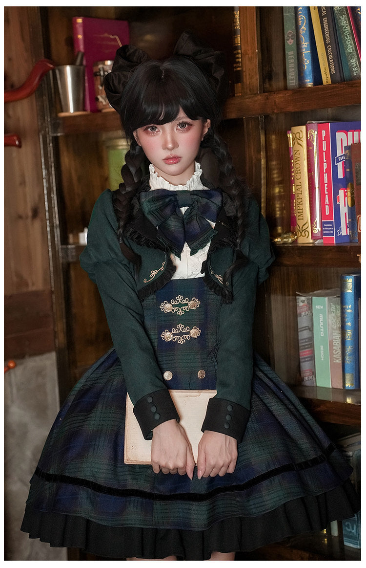 グリーンのチェック柄がクラシカルな制服風ジャンパースカート。
