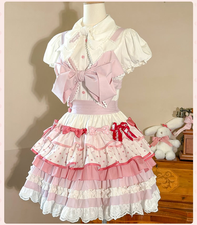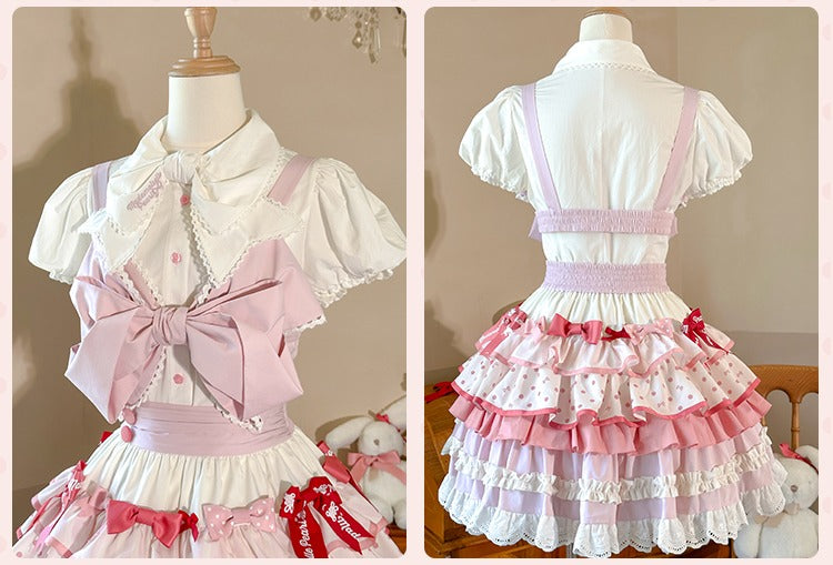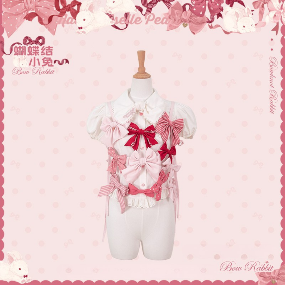 ブラウスの重ね着用ノースリーブトップスは、大きなリボンとショート丈が可愛いAタイプと、たくさんリボンがついたBタイプの2種類から選べます。