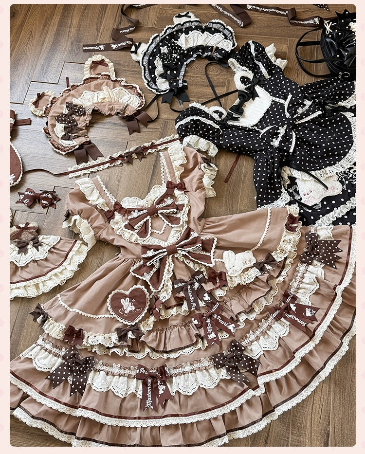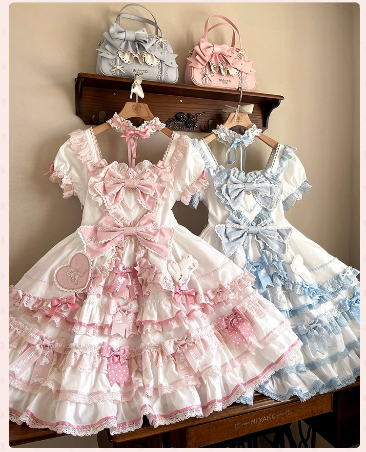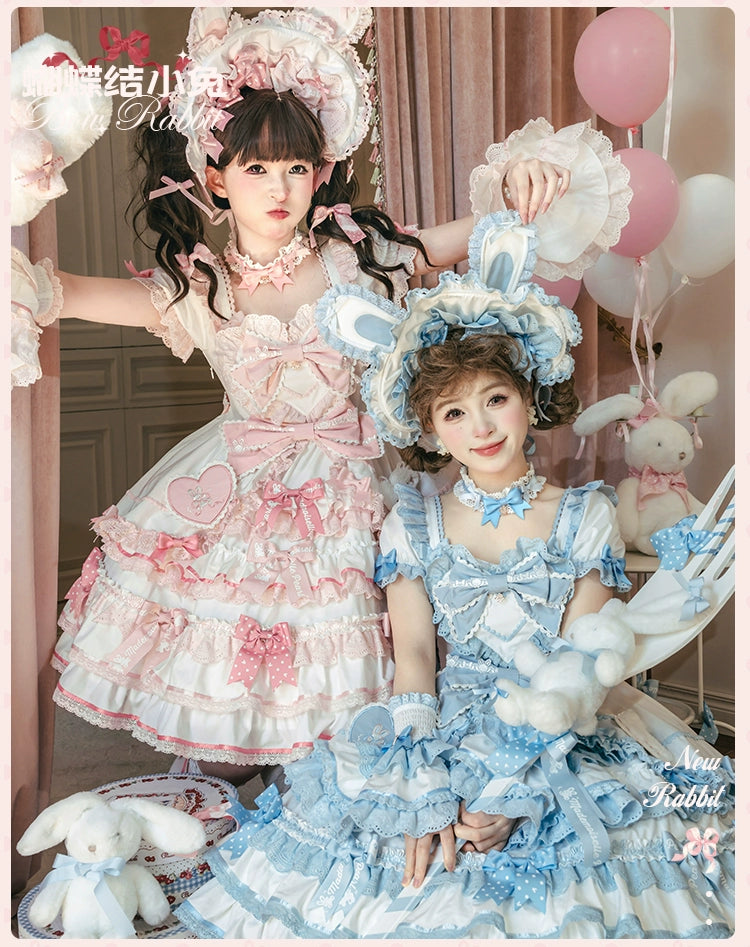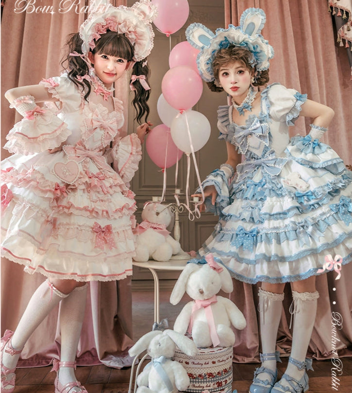 ハートにリボン、フリルたっぷりのスペシャルなワンピース。別売りのうさ耳付きボンネットを合わせればさらにスイートに♡