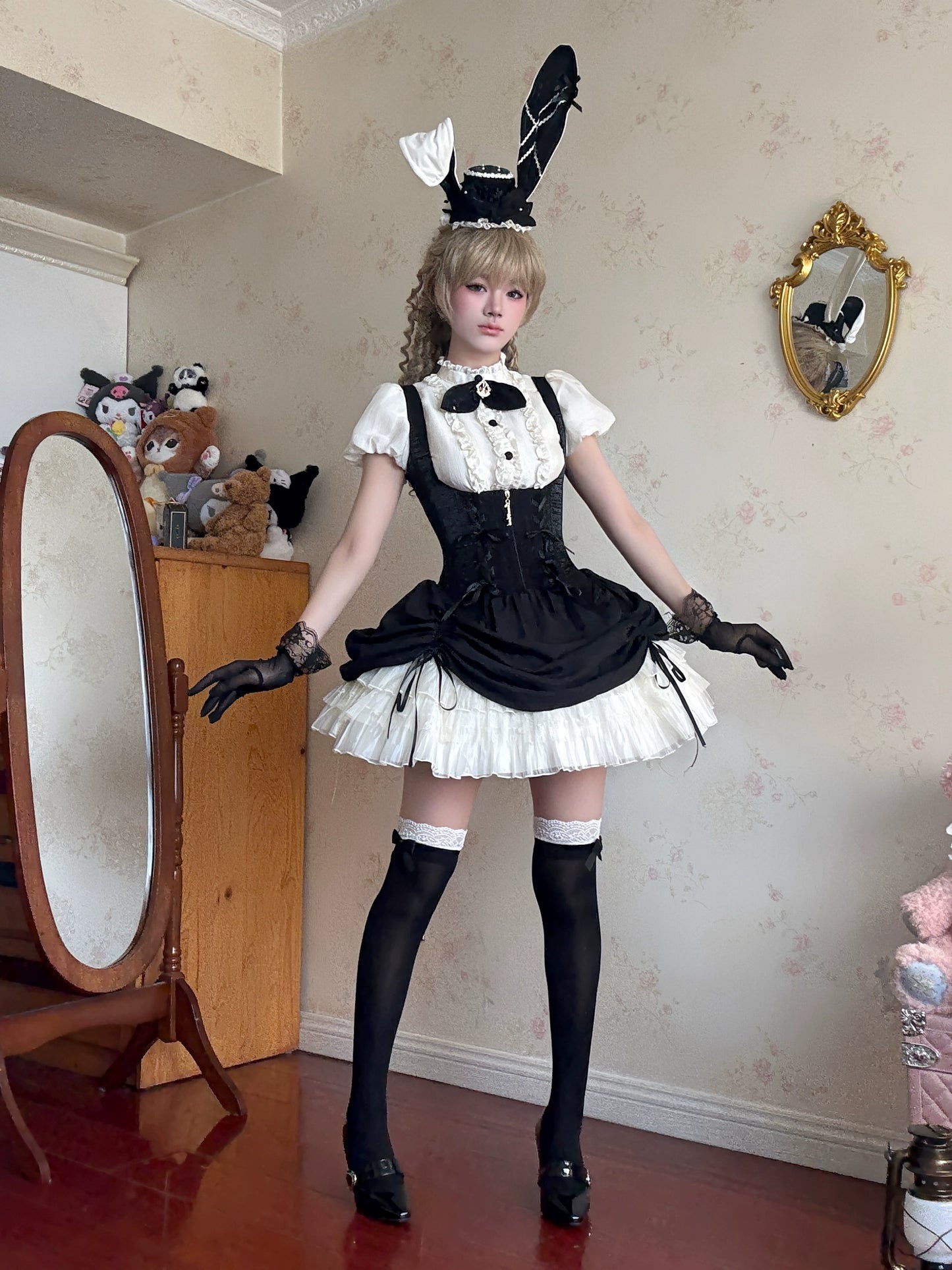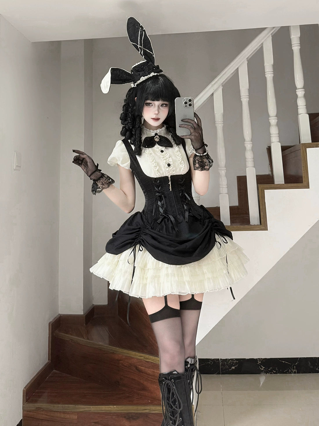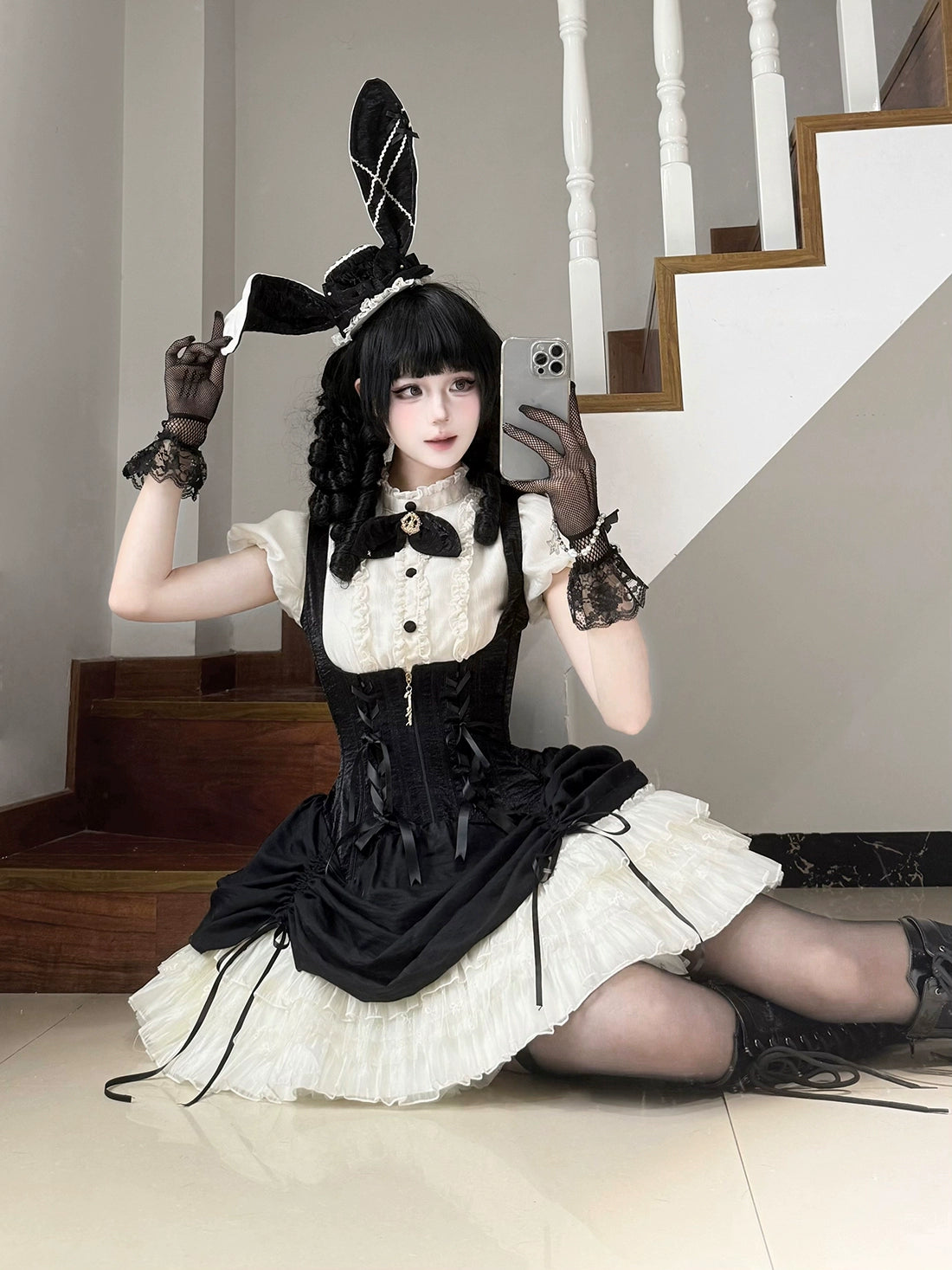 コルセット風デザインにフリルが重なった短めスカートが可愛いジャンパースカート。ブラックはうさ耳メイド風に♡