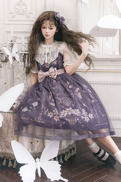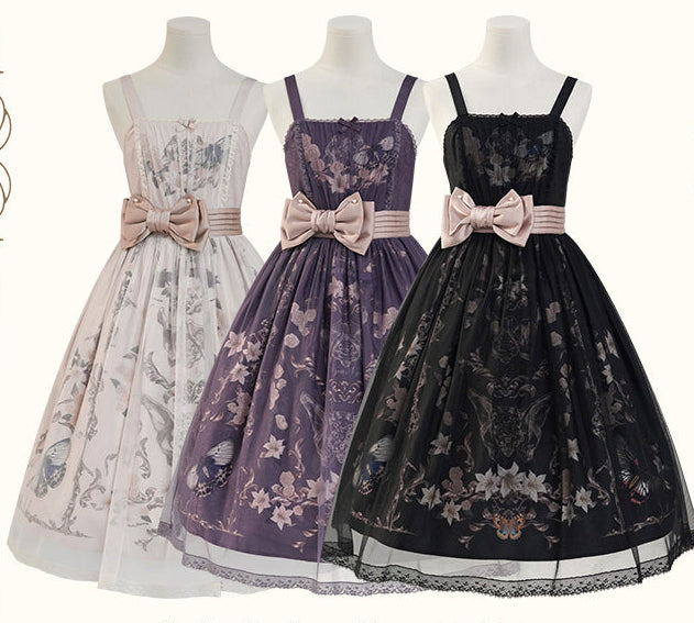 蝶の幻想的なプリントにチュールを重ねたゴシックエレガントな雰囲気のジャンパースカート。
