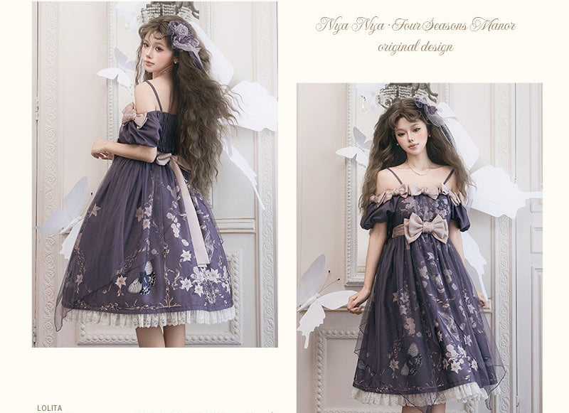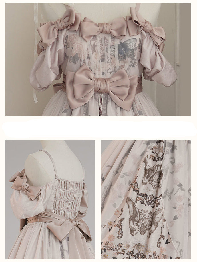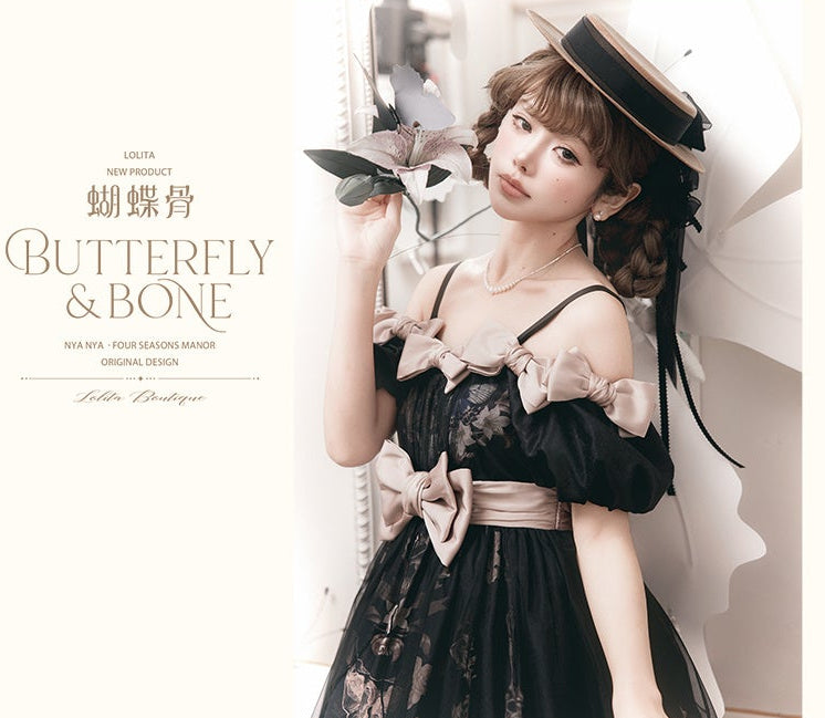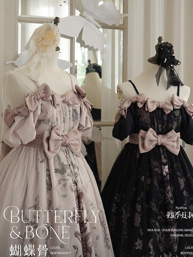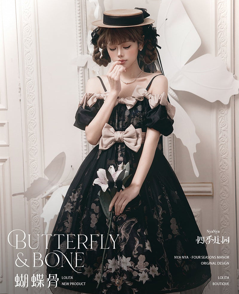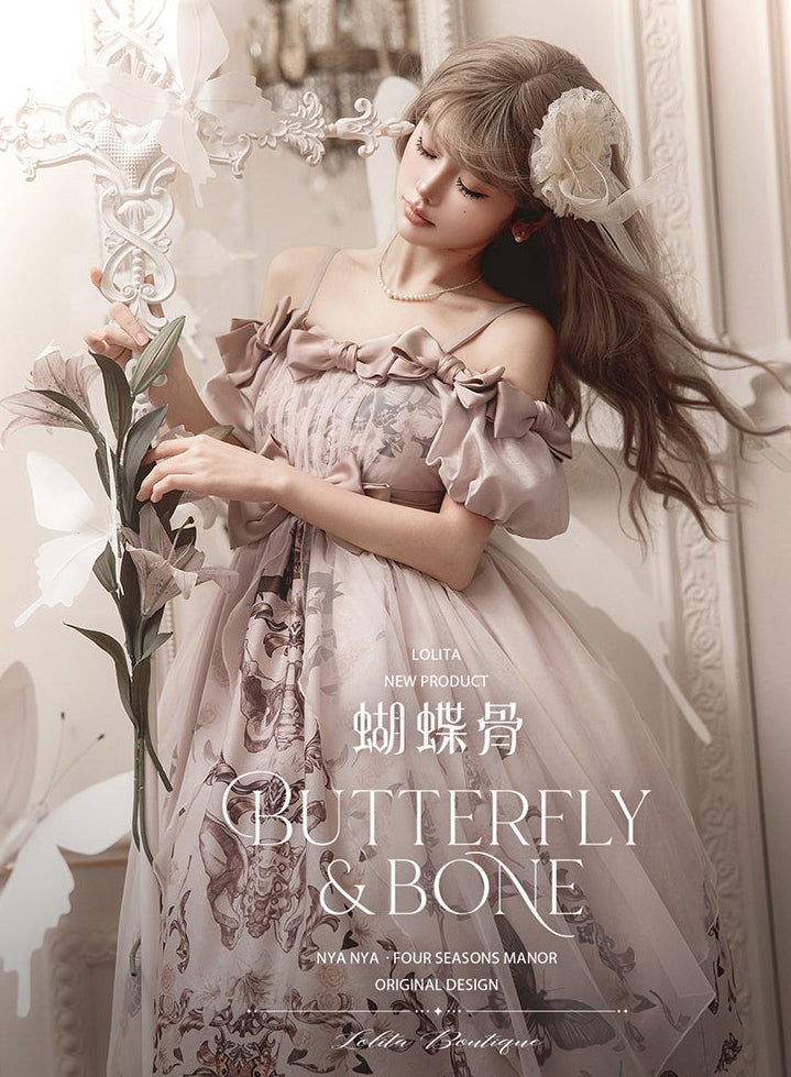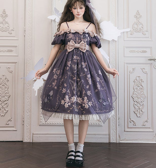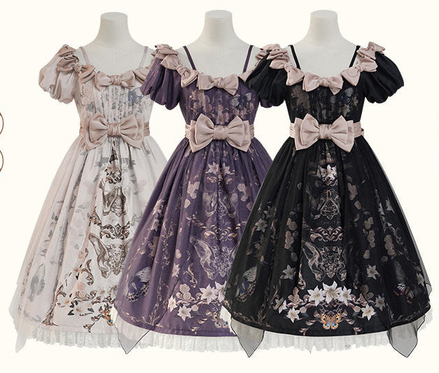 蝶の幻想的なプリントにチュールを重ねたゴシックエレガントな雰囲気のワンピース。