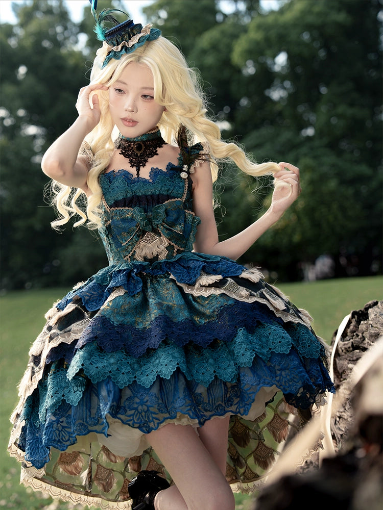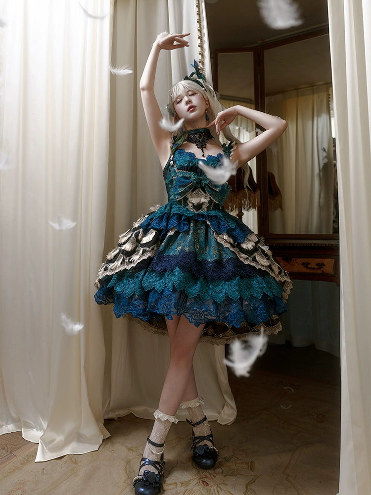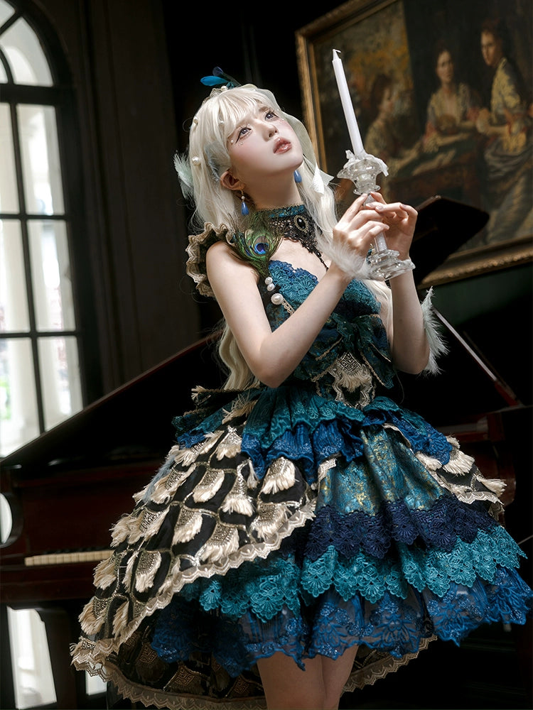 孔雀をイメージしてデザインされたミニドレス。ピーコックグリーンは深い青緑色で孔雀のような華やかな印象に。