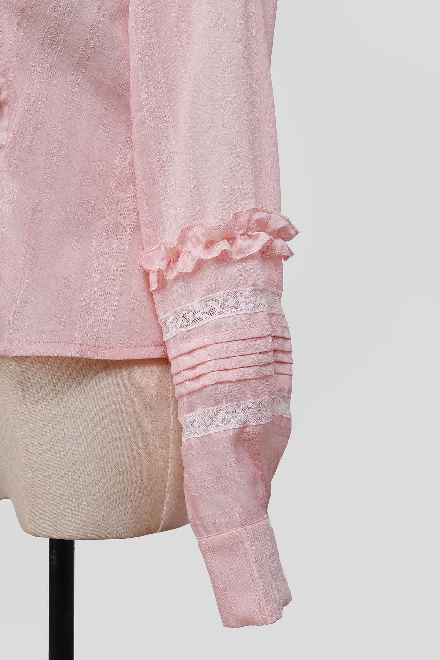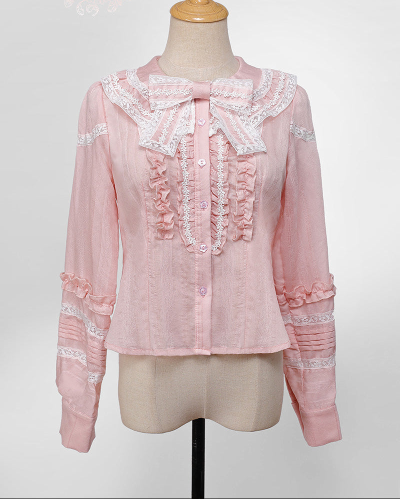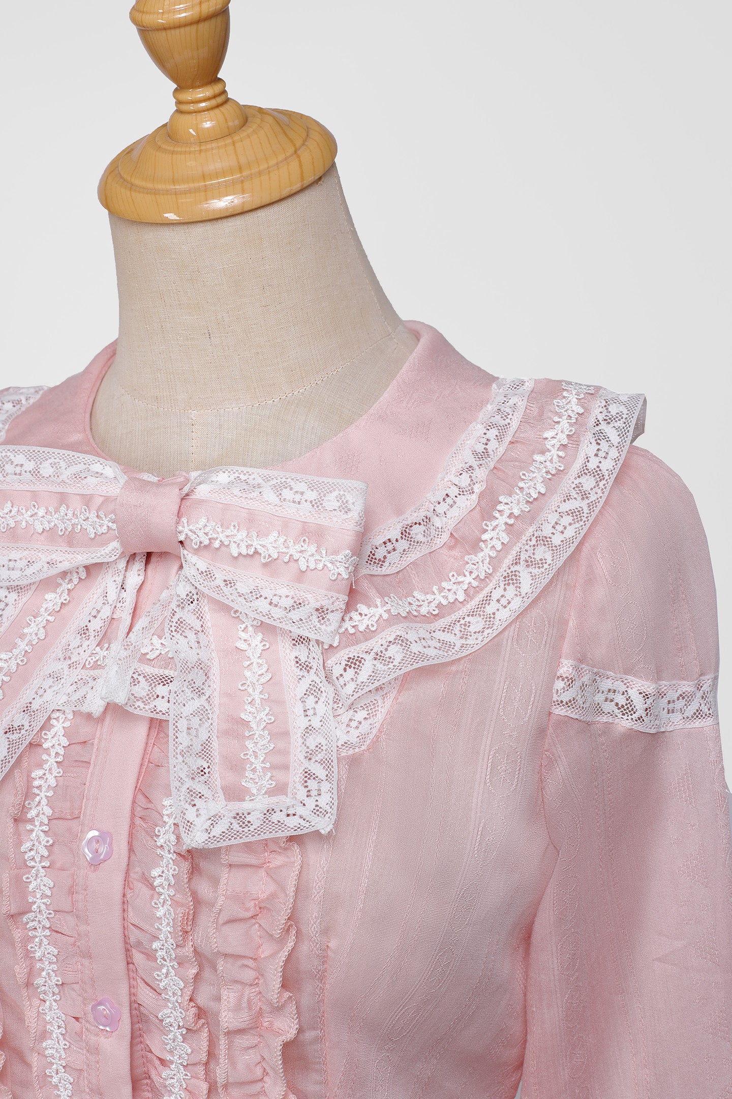 優しいピンクにリボンとフリル・レースがあしらわれたブラウス。同シリーズのスカートやジャンパースカートとのコーデがおすすめです。