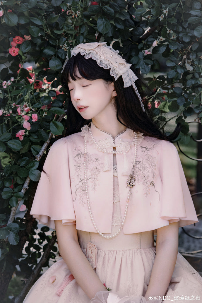 タッセルと藤の刺繍が可愛いショートケープ。同シリーズのジャンパースカートとのコーデがおすすめです。
