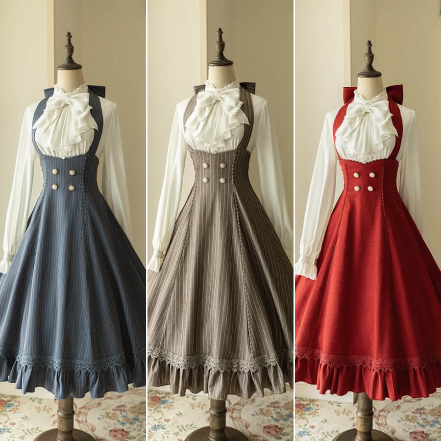 from 199 reviewsJSKというよりはハイウエストのサス付きスカートという感じ。シンプルなデザインだけど、ロリィタの求める要素が詰まっていてこだわりを感じました!サスペンダーのボタンホールは複数ついていて長さを調節できるし、取り外せる共布リボンとリボンブローチはその日によって印象を変えられます。後ろリボンは前でも結べるので、少し工夫すれば何通りにでも着方を楽しめるところが、まさにロリィタの求めるお洋服です。思わず「わかってるー!」ってなりました。ポケット付きなのもありがたい!ちゃんとパニエに負けないくらいの蹴回しあります。