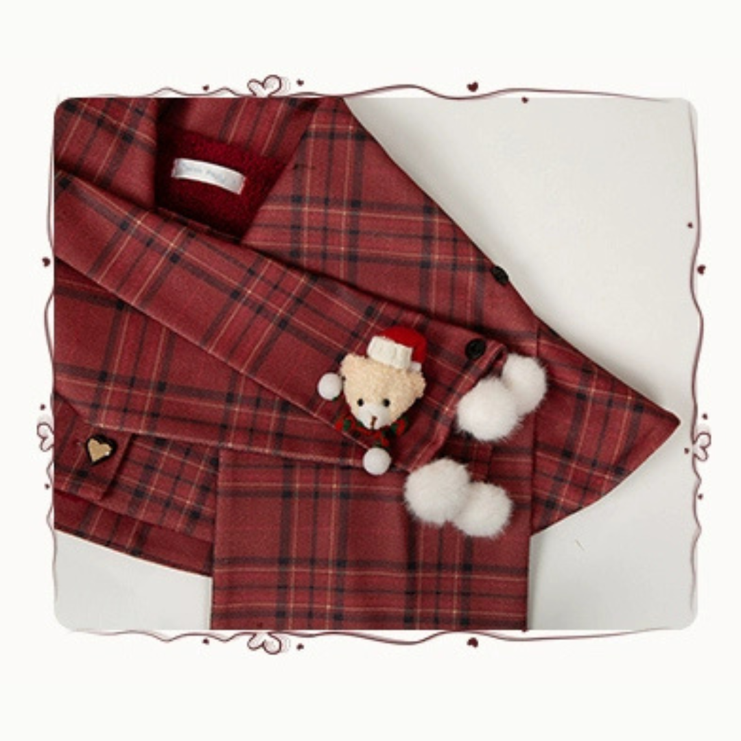 赤のチェック柄に雪のような白いファーが組み合わされたマントはマフラーを重ねたような遊び心のあるデザイン。可愛いくまちゃんのブローチをつけて、冬のロリィタコーデを楽しもう♪