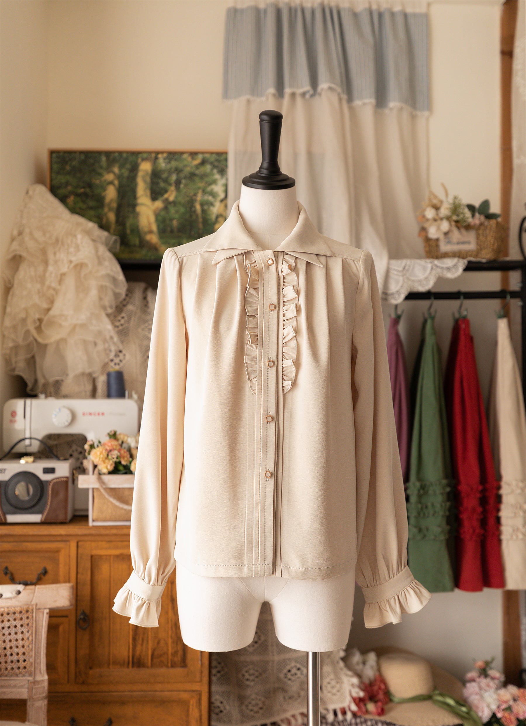 二重になった襟と前立てのフリルがかわいいブラウス。