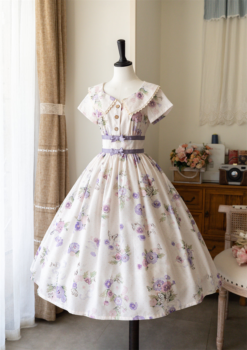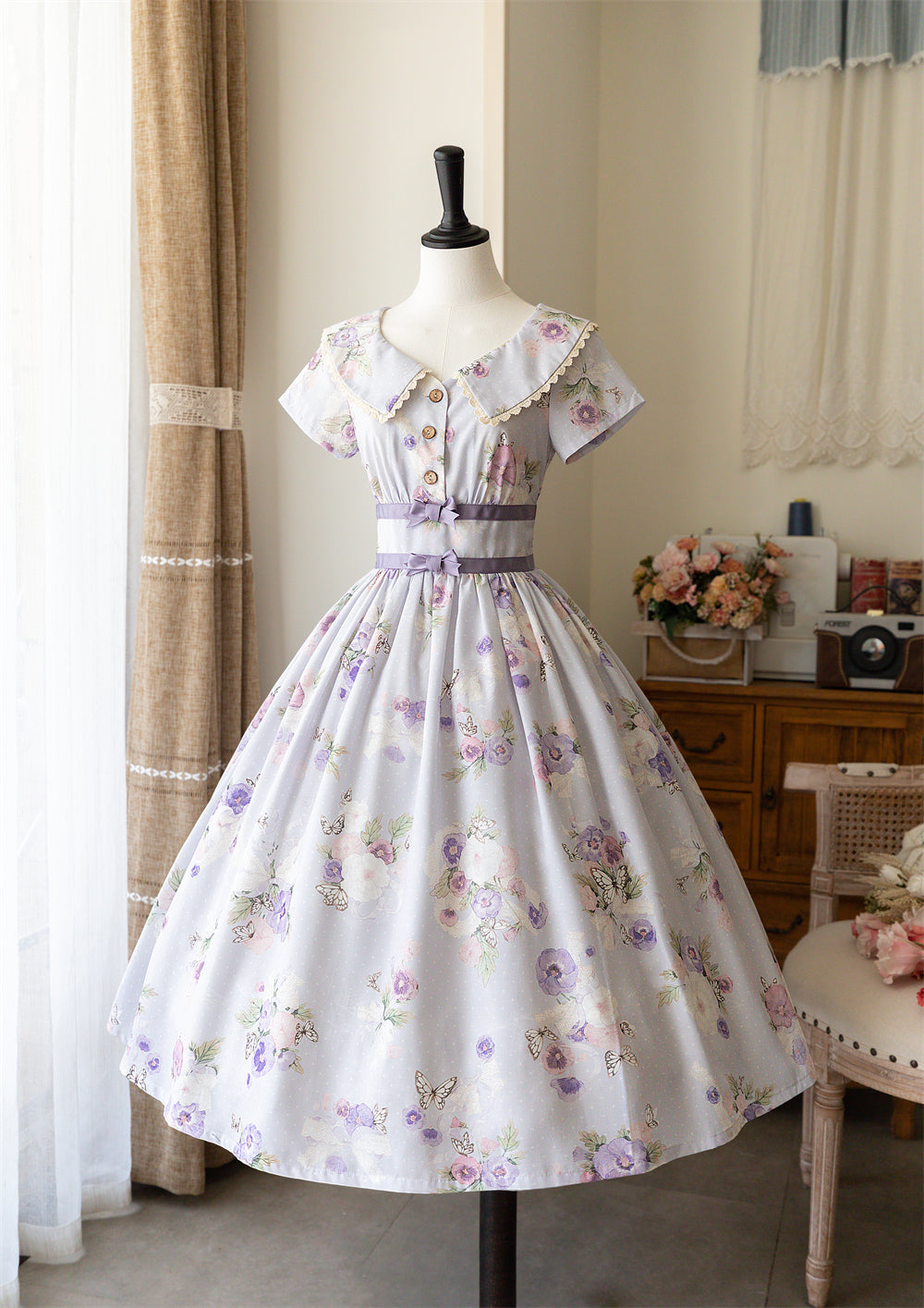 クラシカルな花柄がプリントされたワンピース。お揃いのリボンのカチューシャ付き。