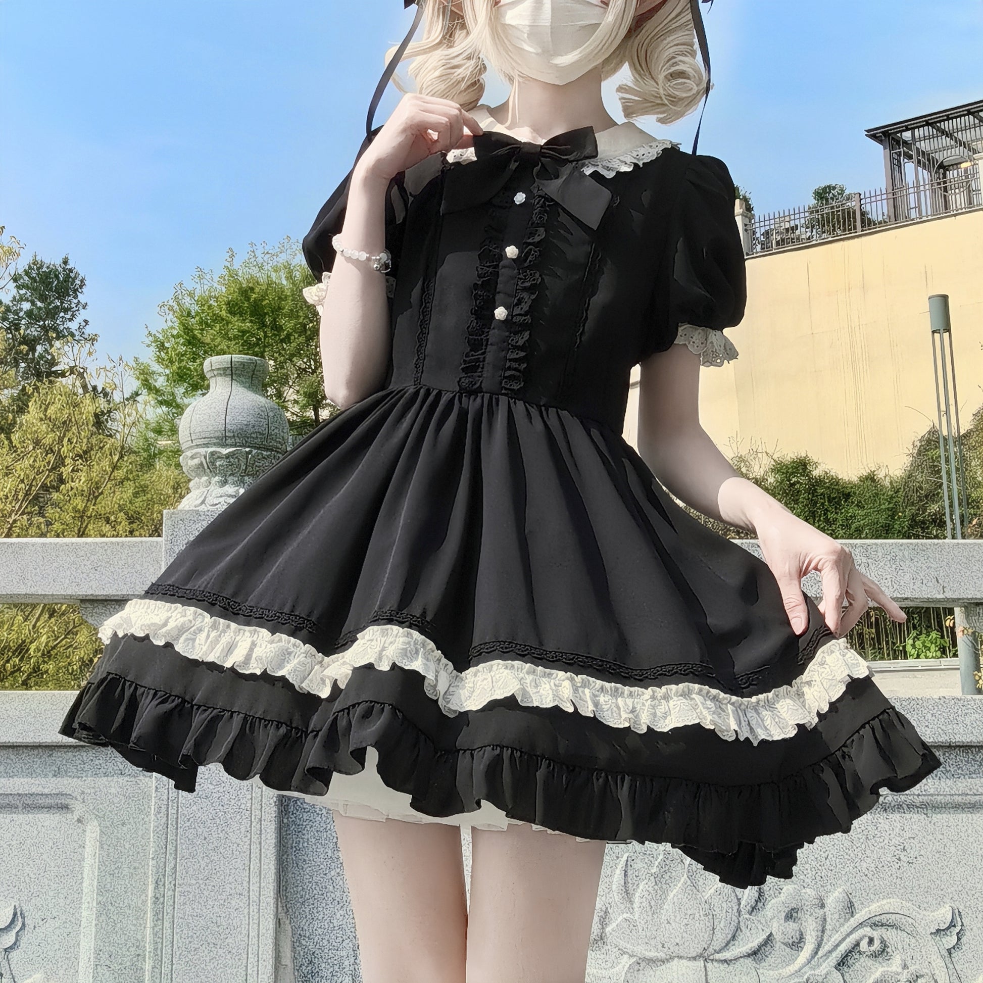 フリル襟の半袖メイドワンピース エプロン付き ショート丈