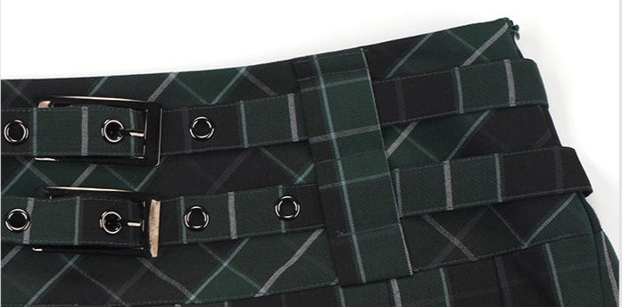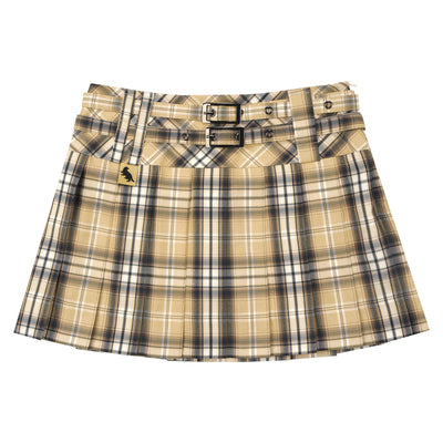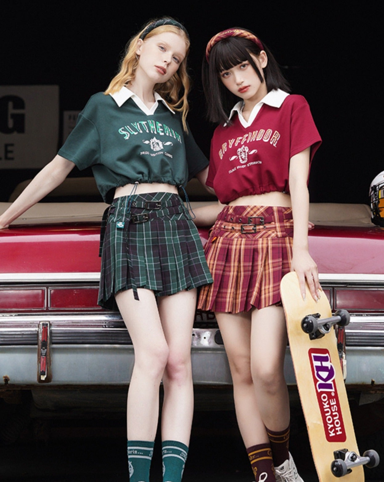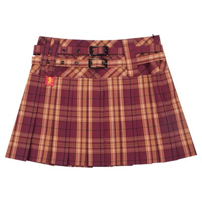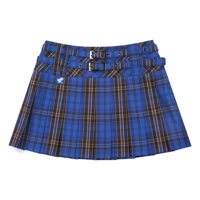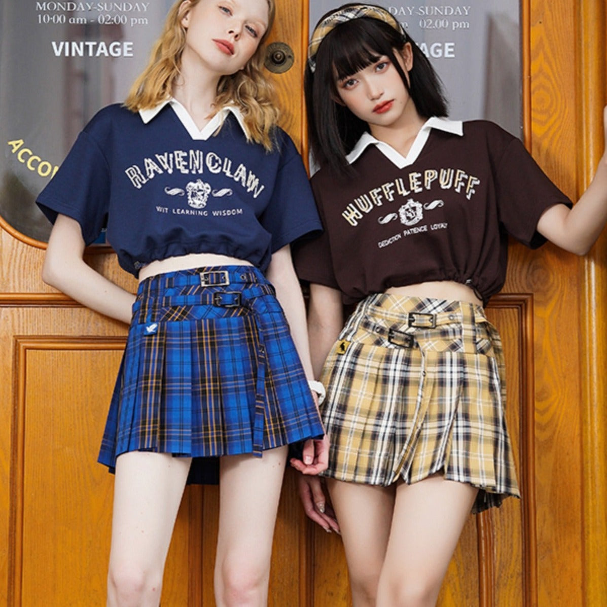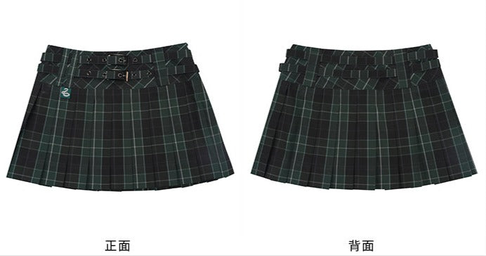 各寮のモチーフがあしらわれたチェックのローライズミニスカート。