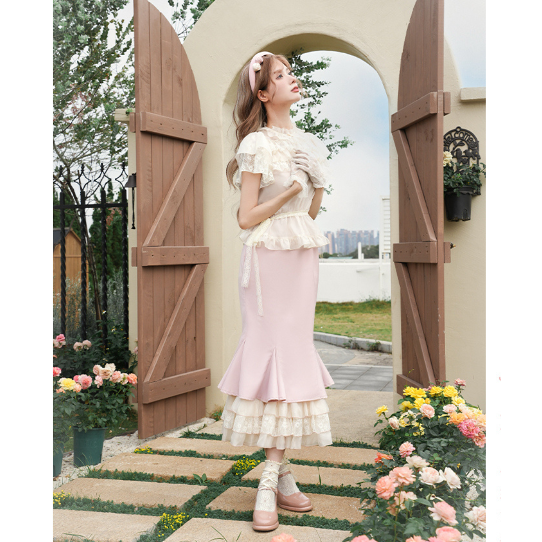 スカートの裾から見える、3層に重なったレースがかわいいセットアップ。