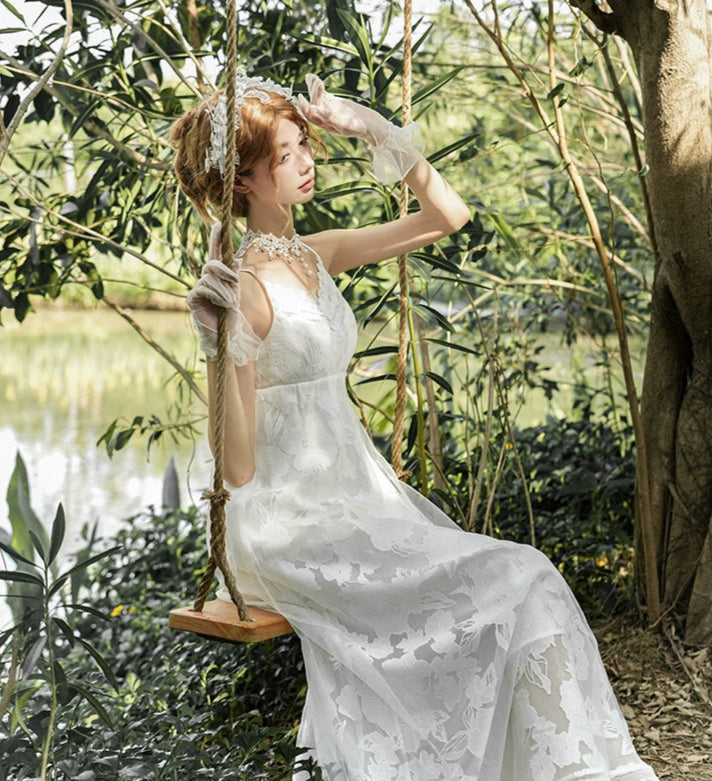 ロング丈のエレガントなキャミソールジャンパースカートにレースの半袖トップス、ヴェールとアクセサリーが付属したセット。