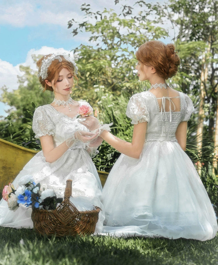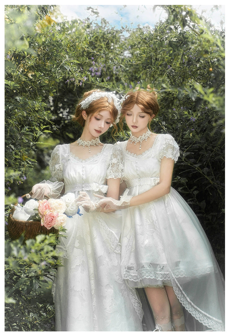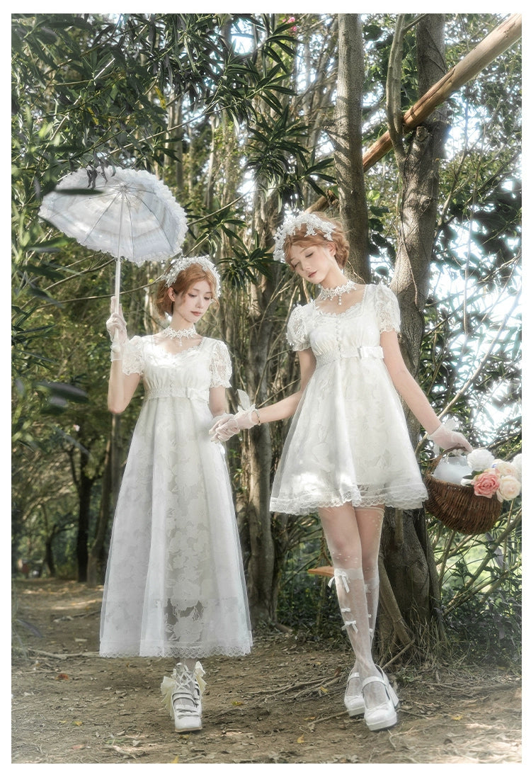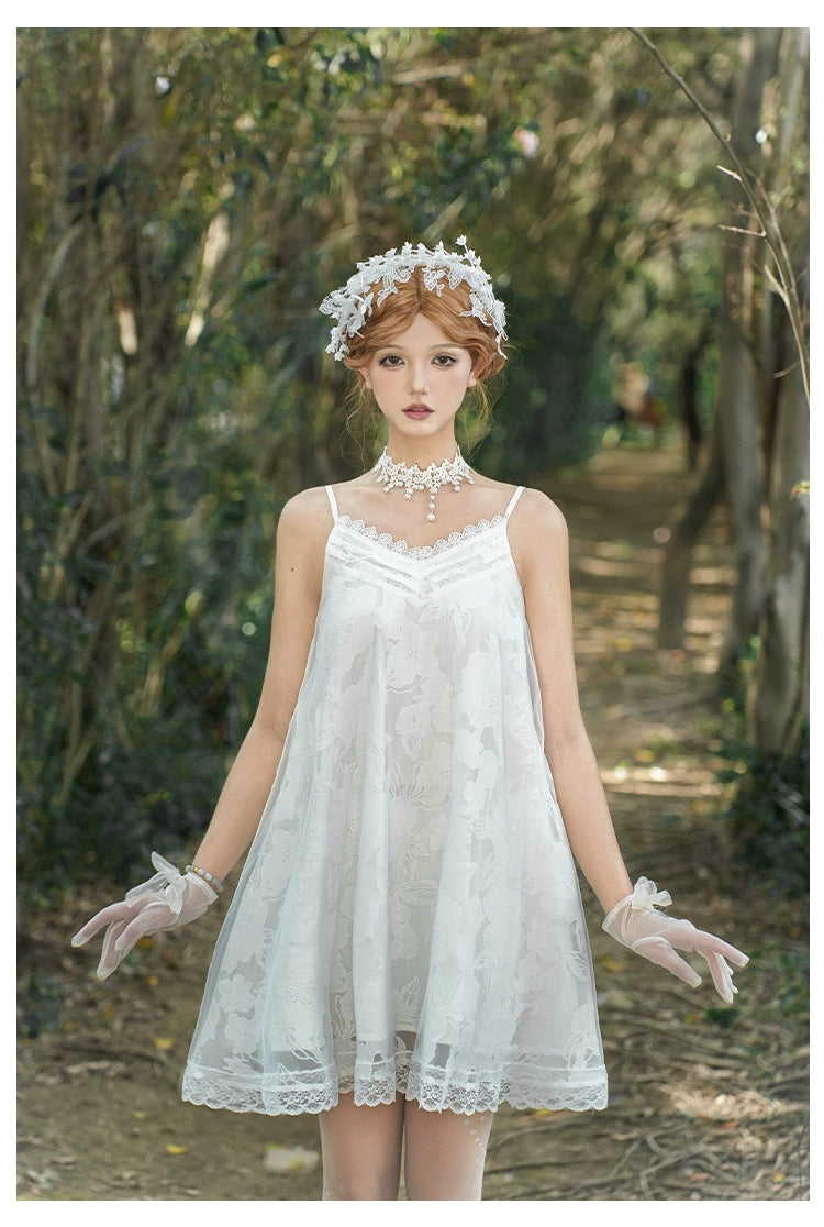 ショート丈の可憐なキャミソールジャンパースカートにレースの半袖トップス、ヴェールとアクセサリーが付属したセット。