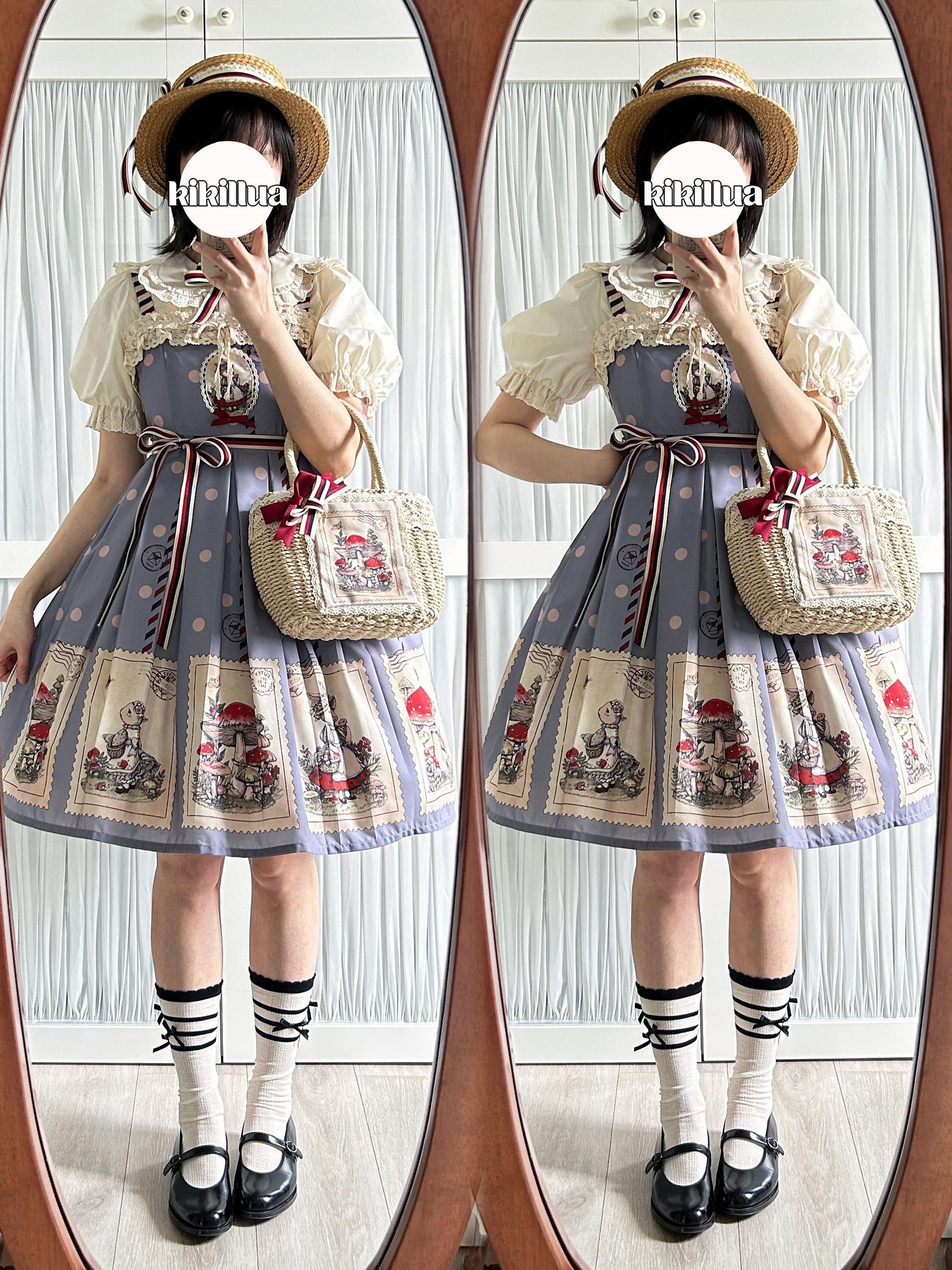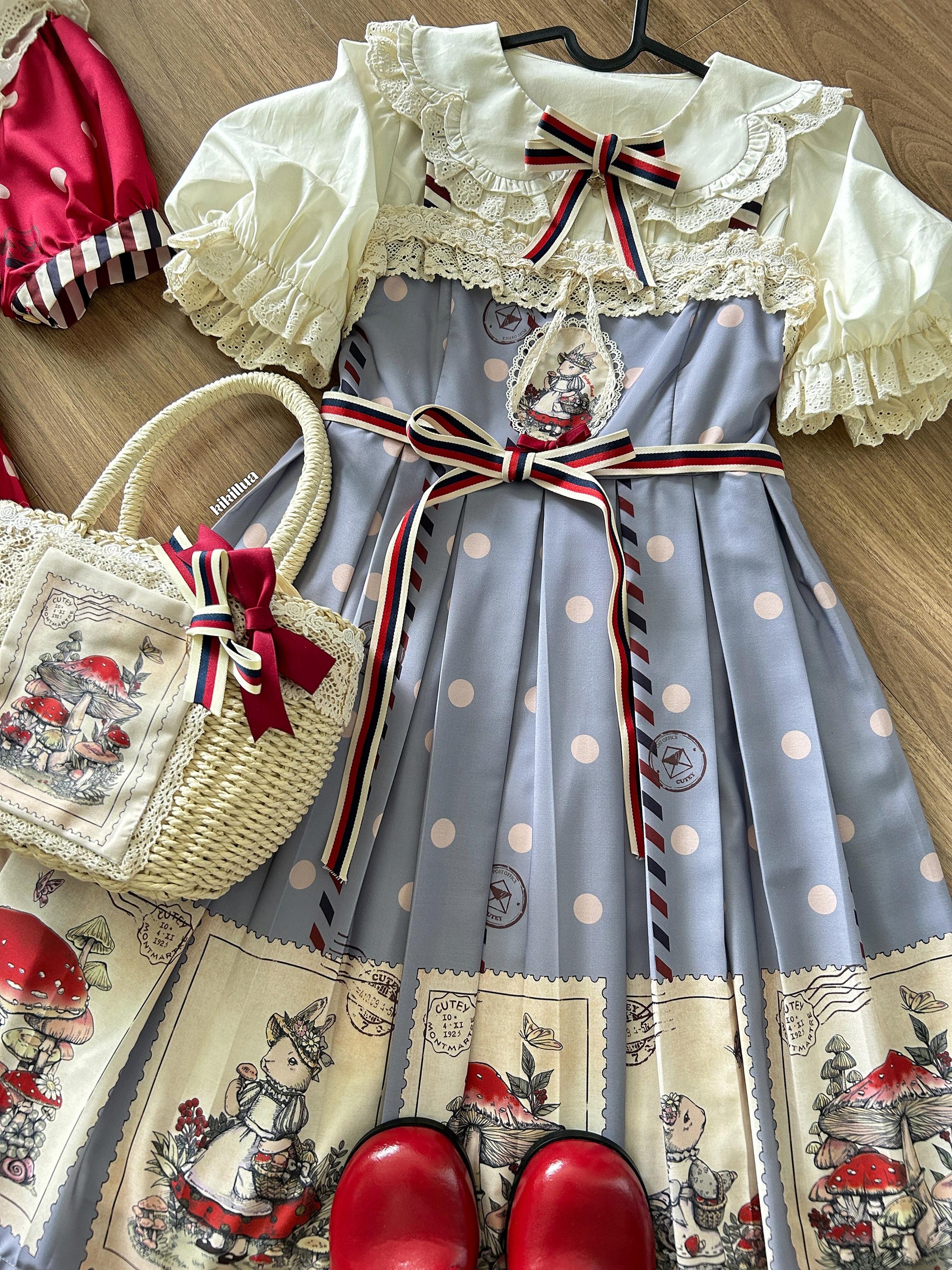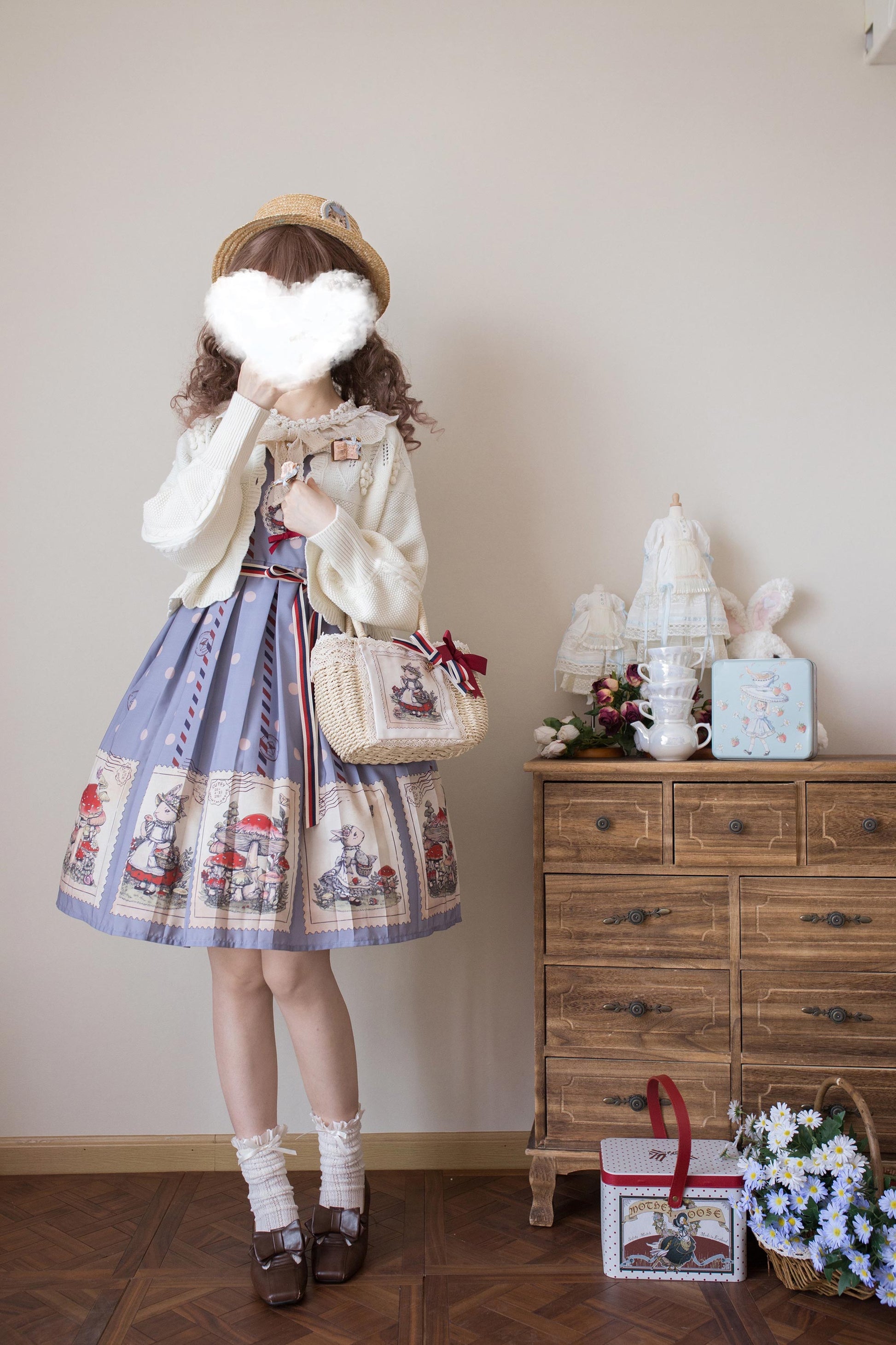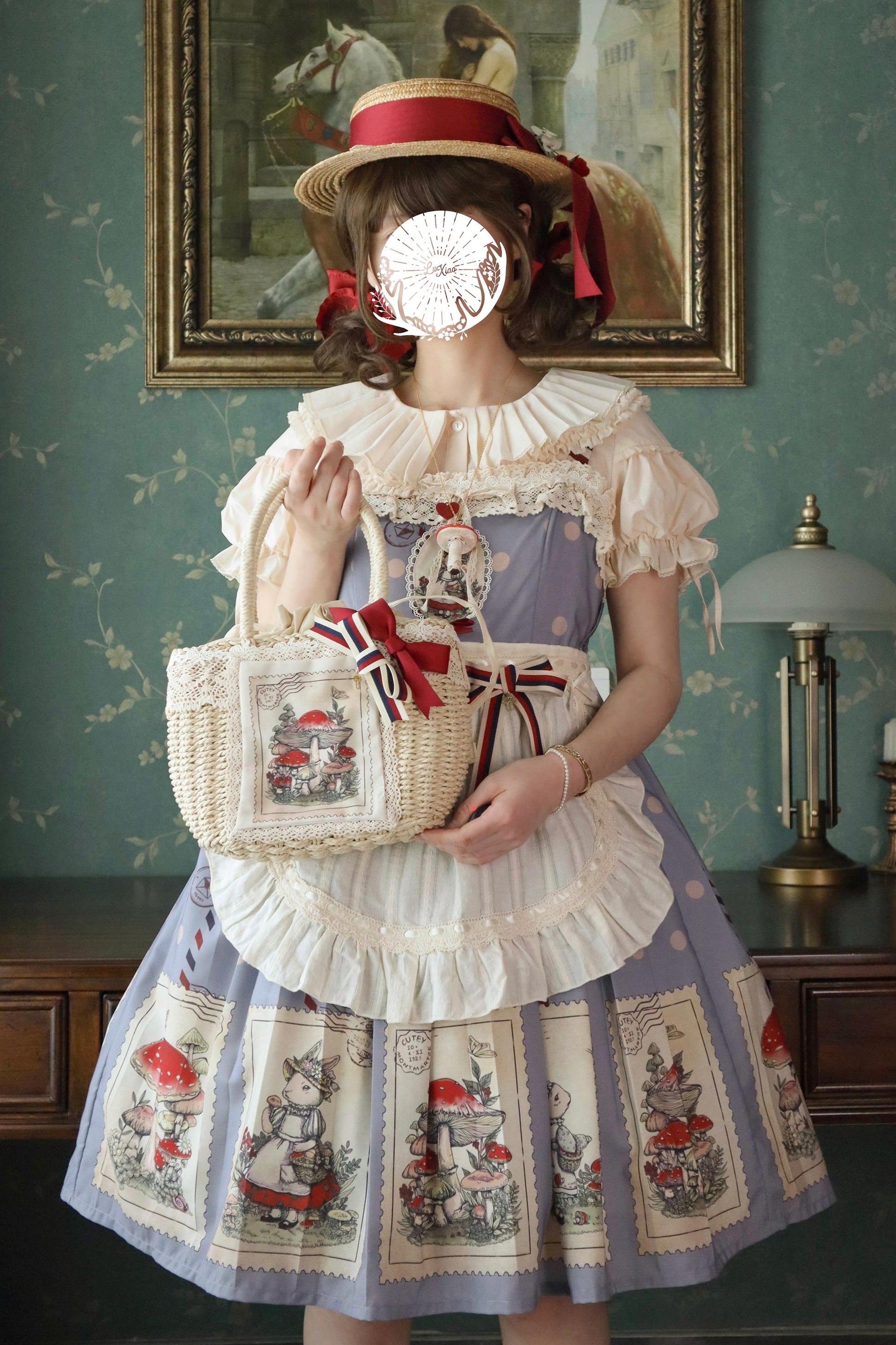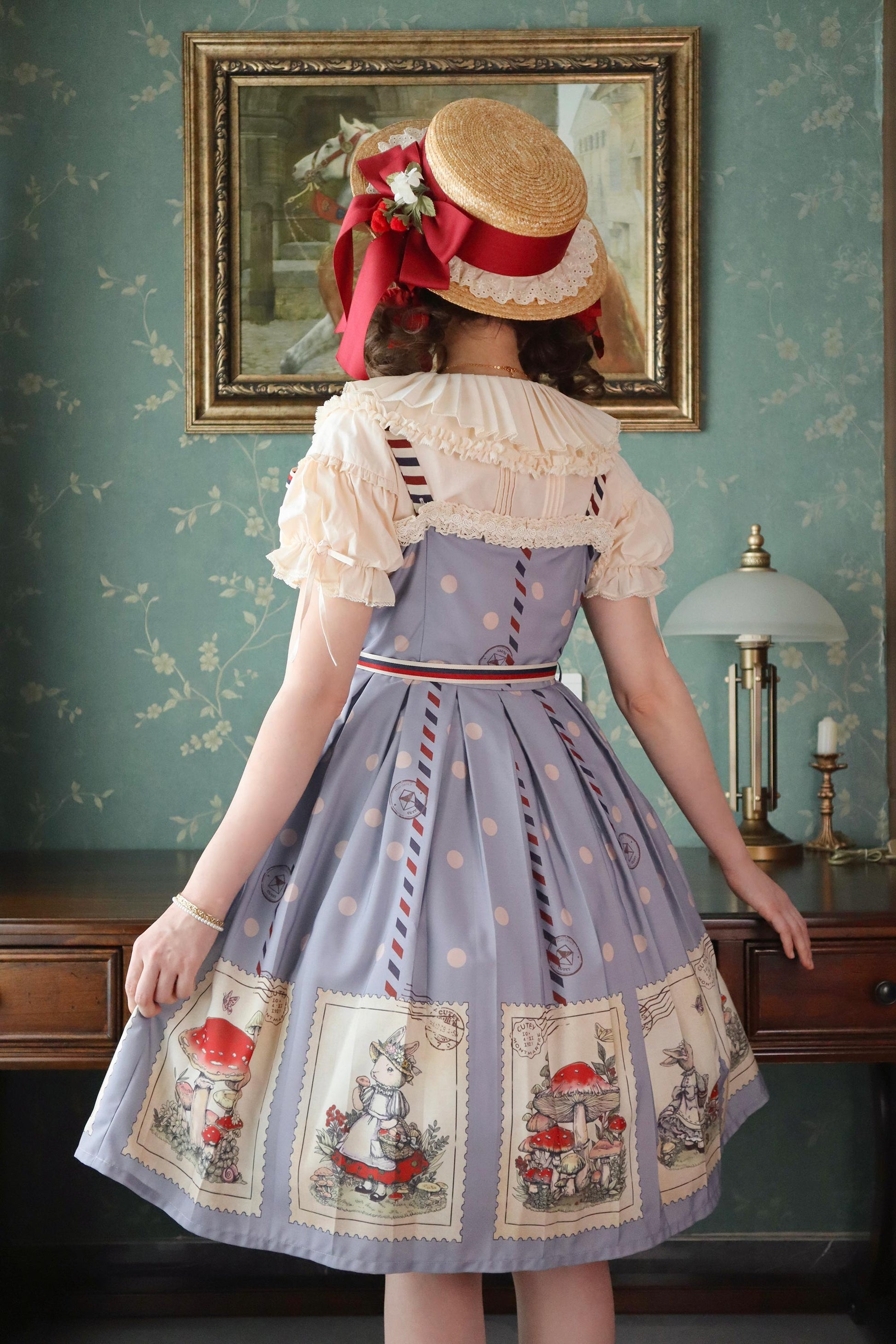 手紙をイメージした、キノコとウサギのアンティークな切手デザインが可愛いジャンパースカート。