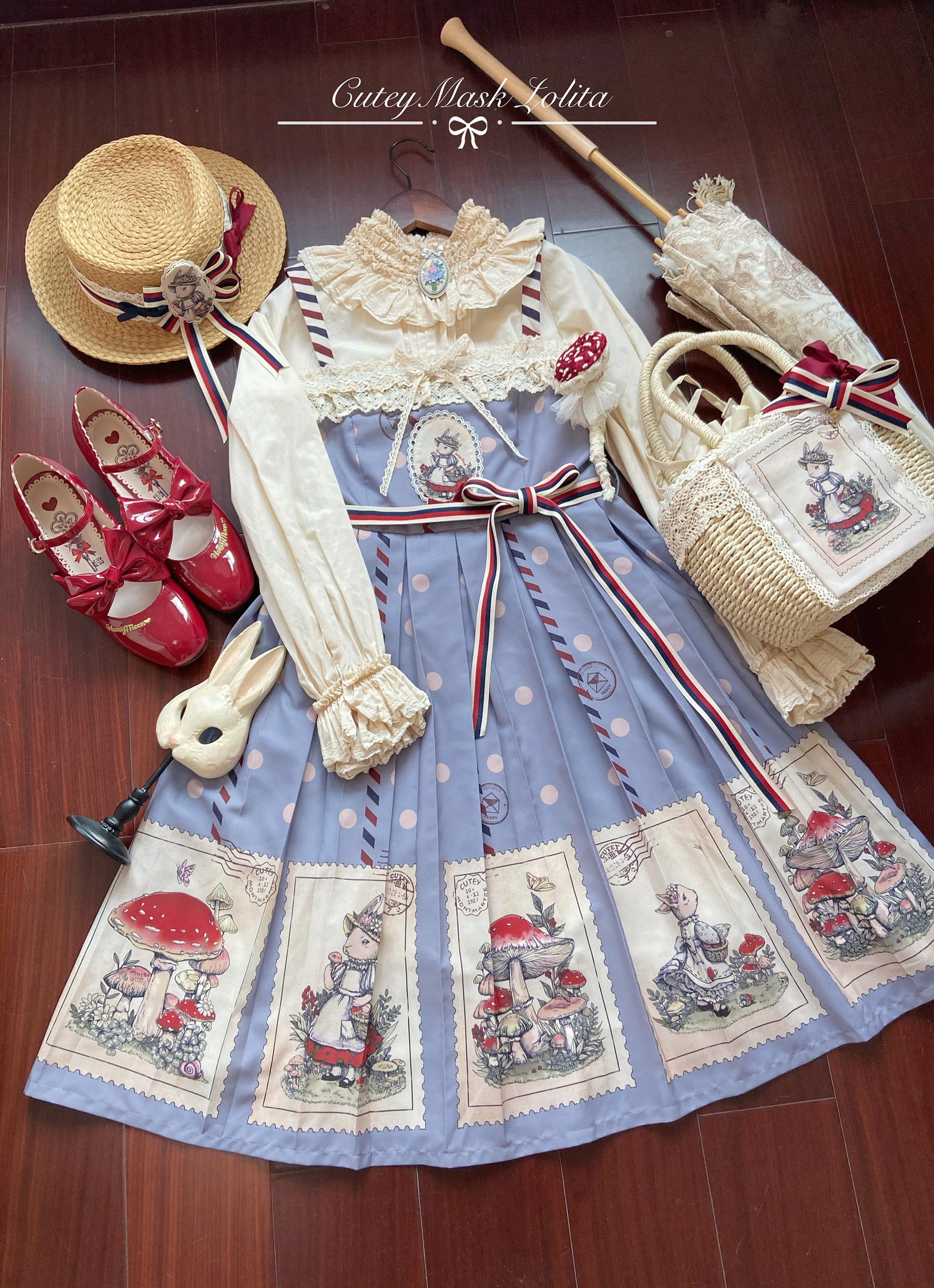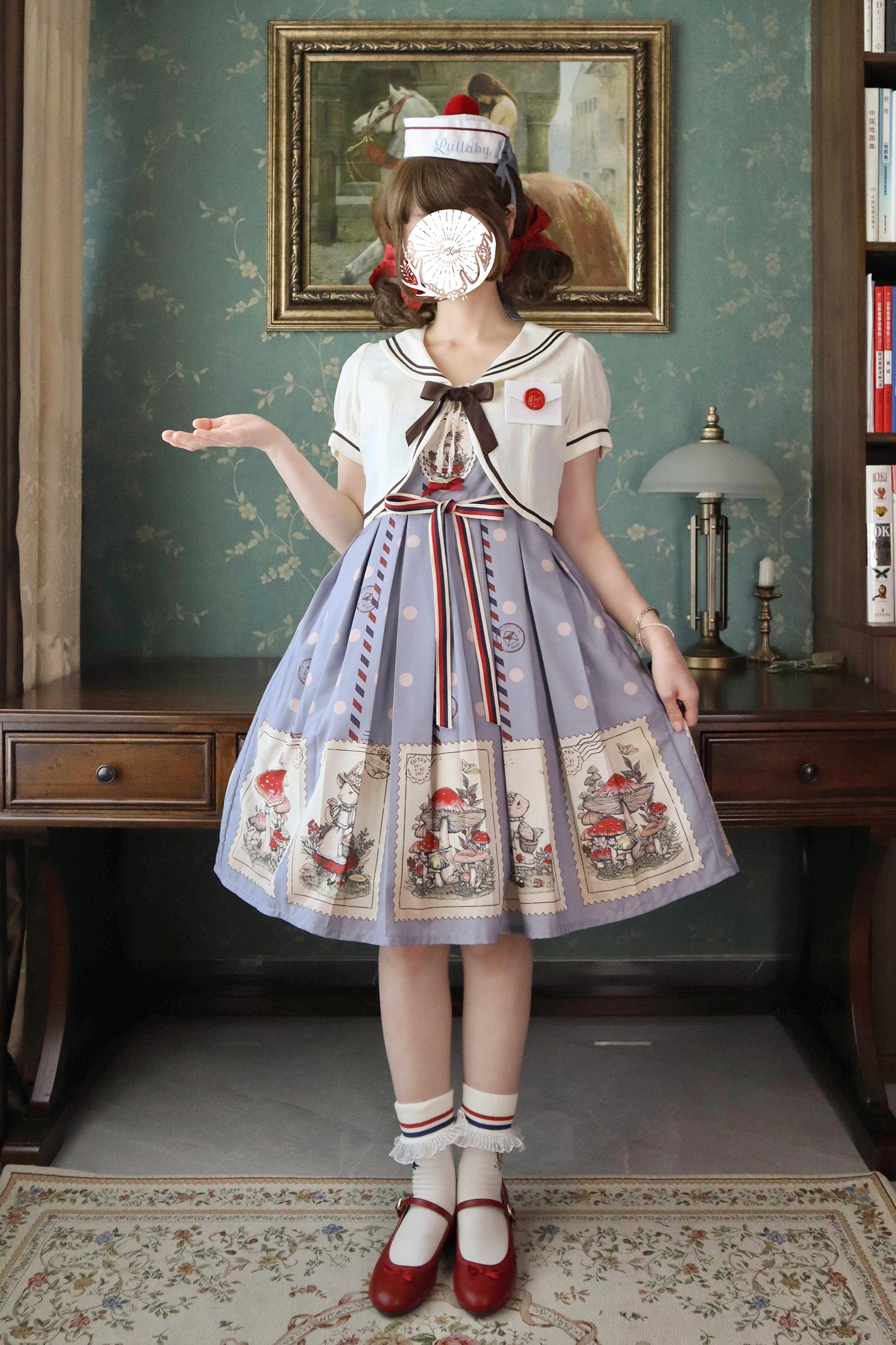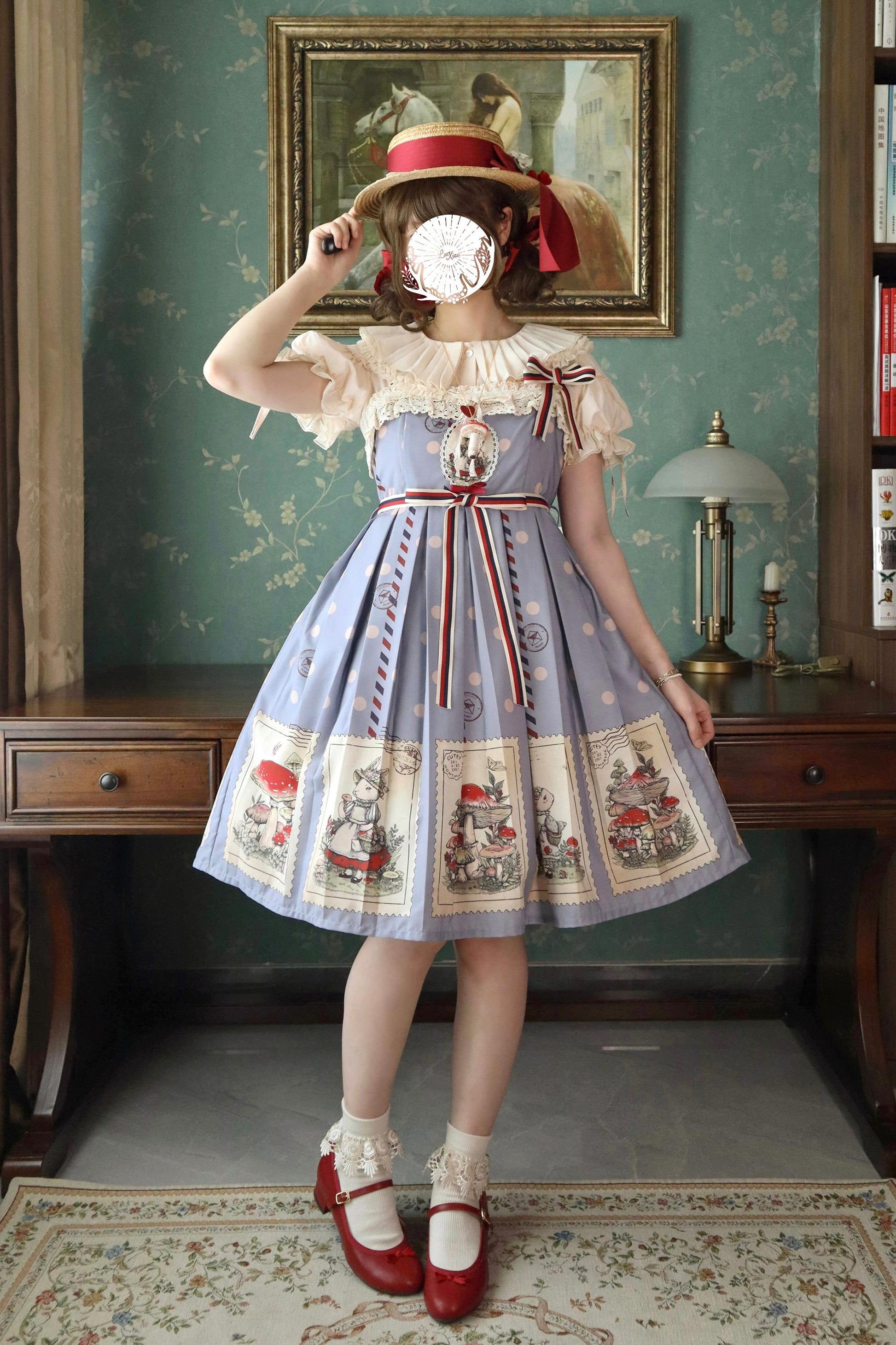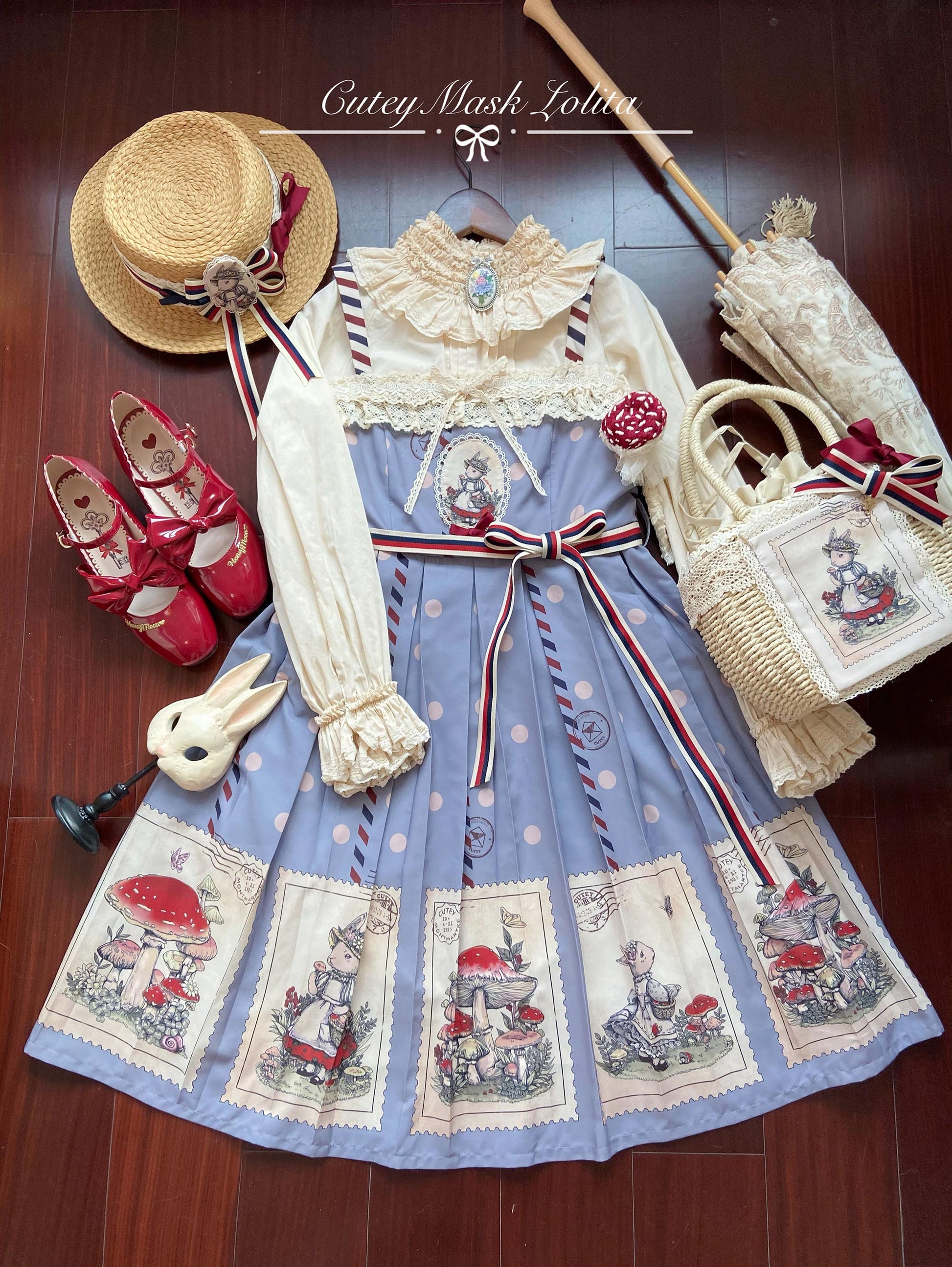 手紙をイメージした、キノコとウサギのアンティークな切手デザインが可愛いジャンパースカート。