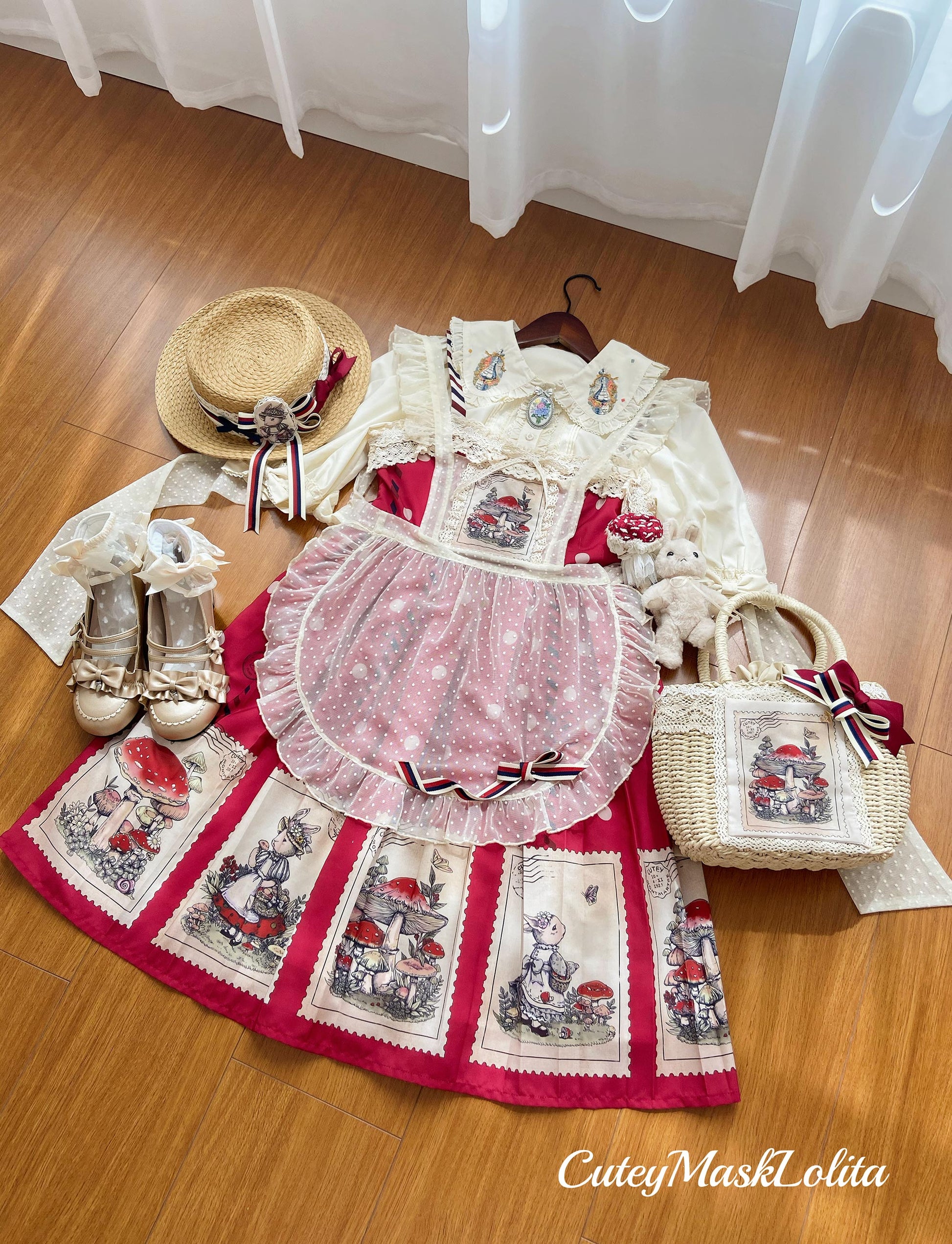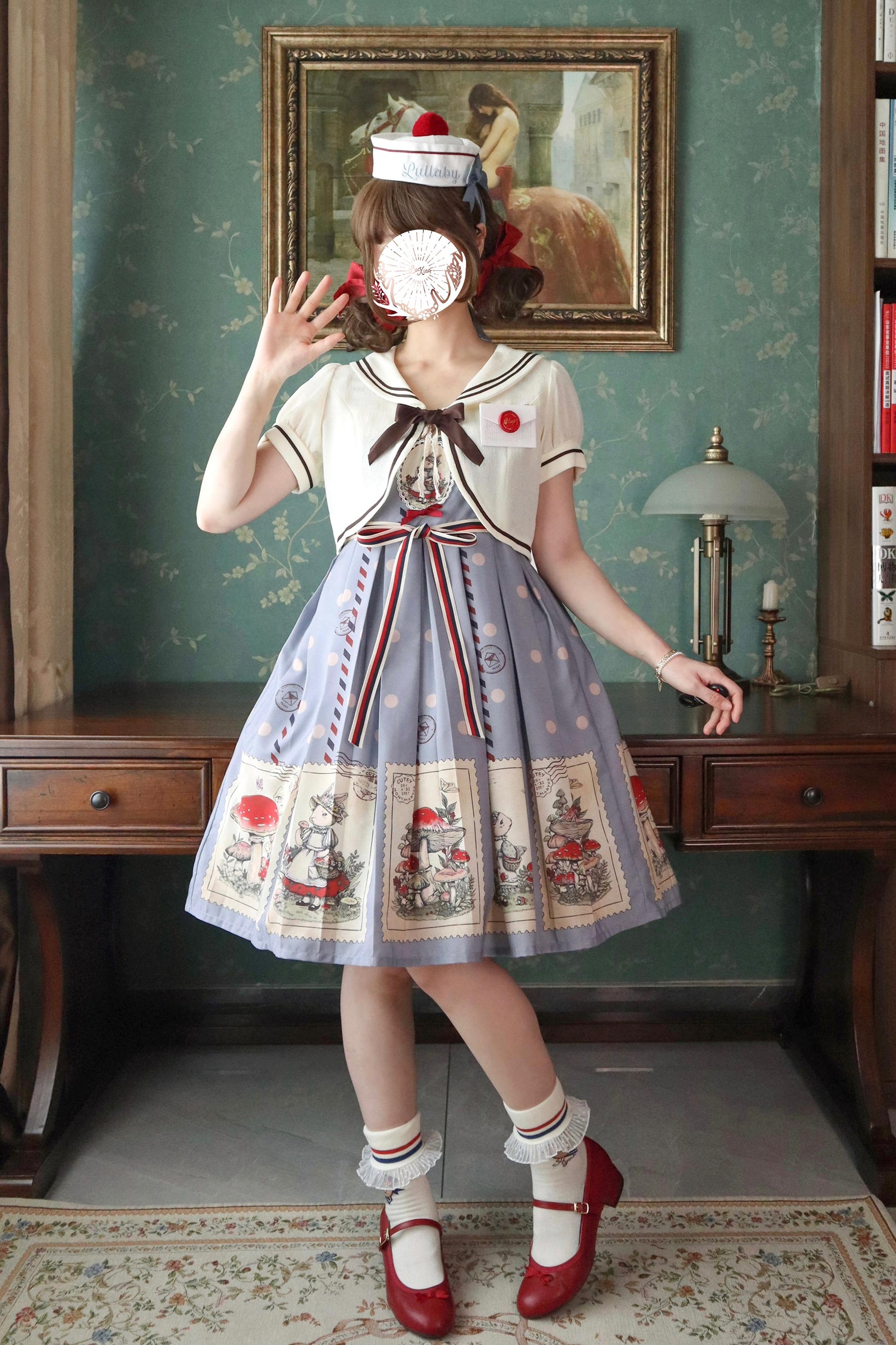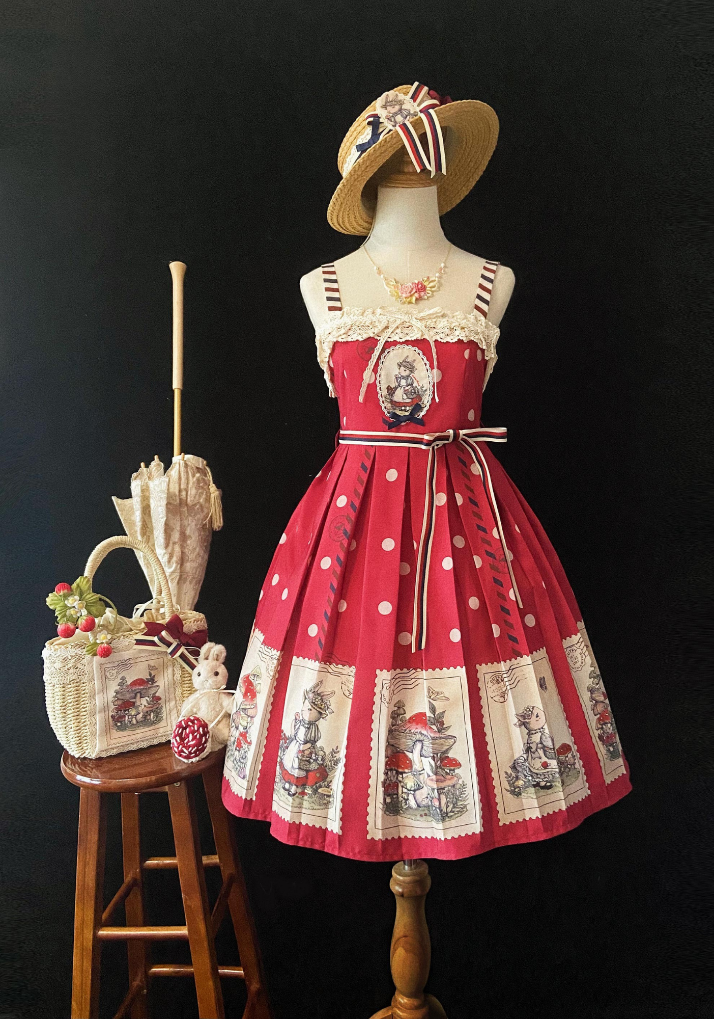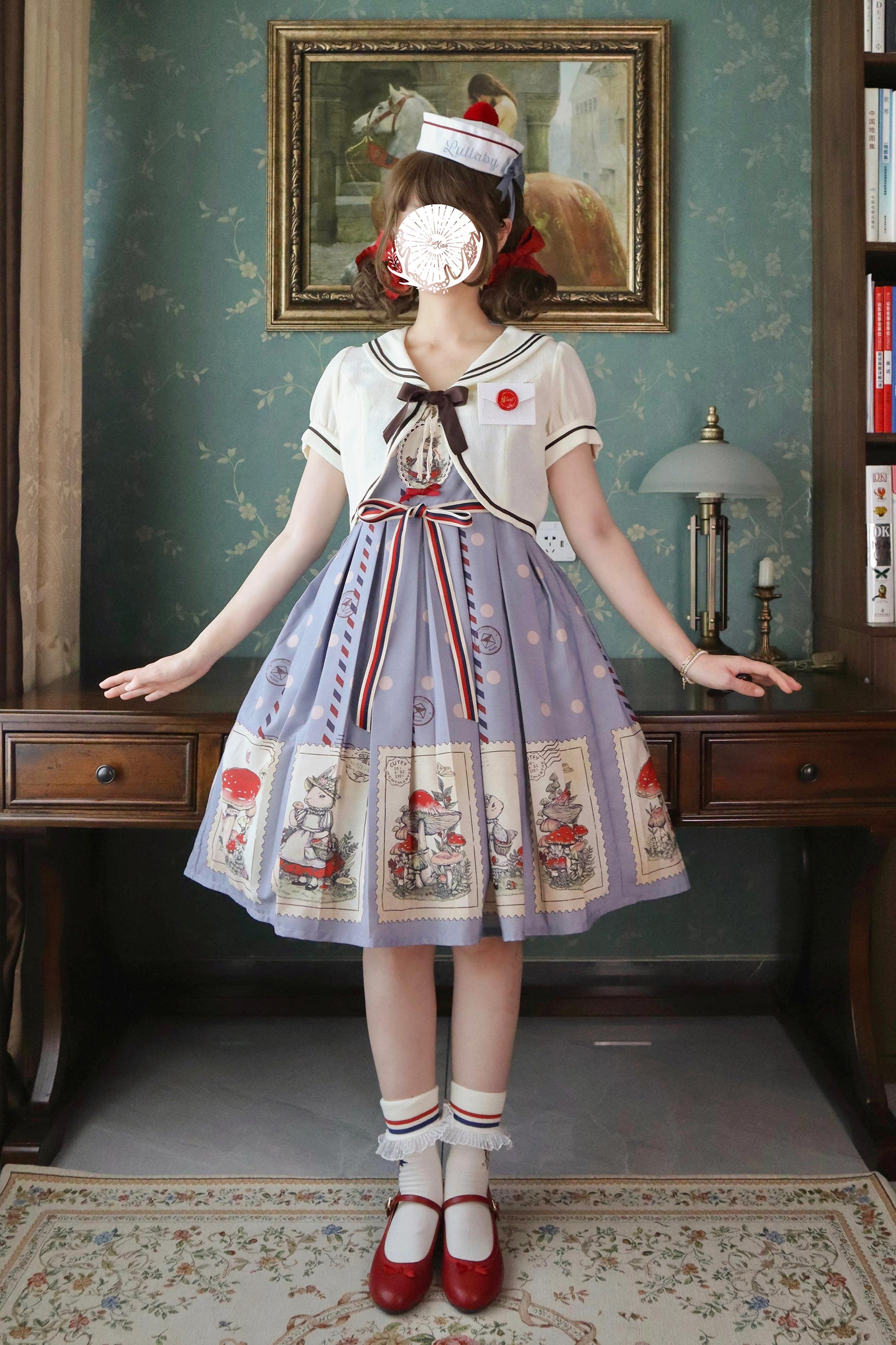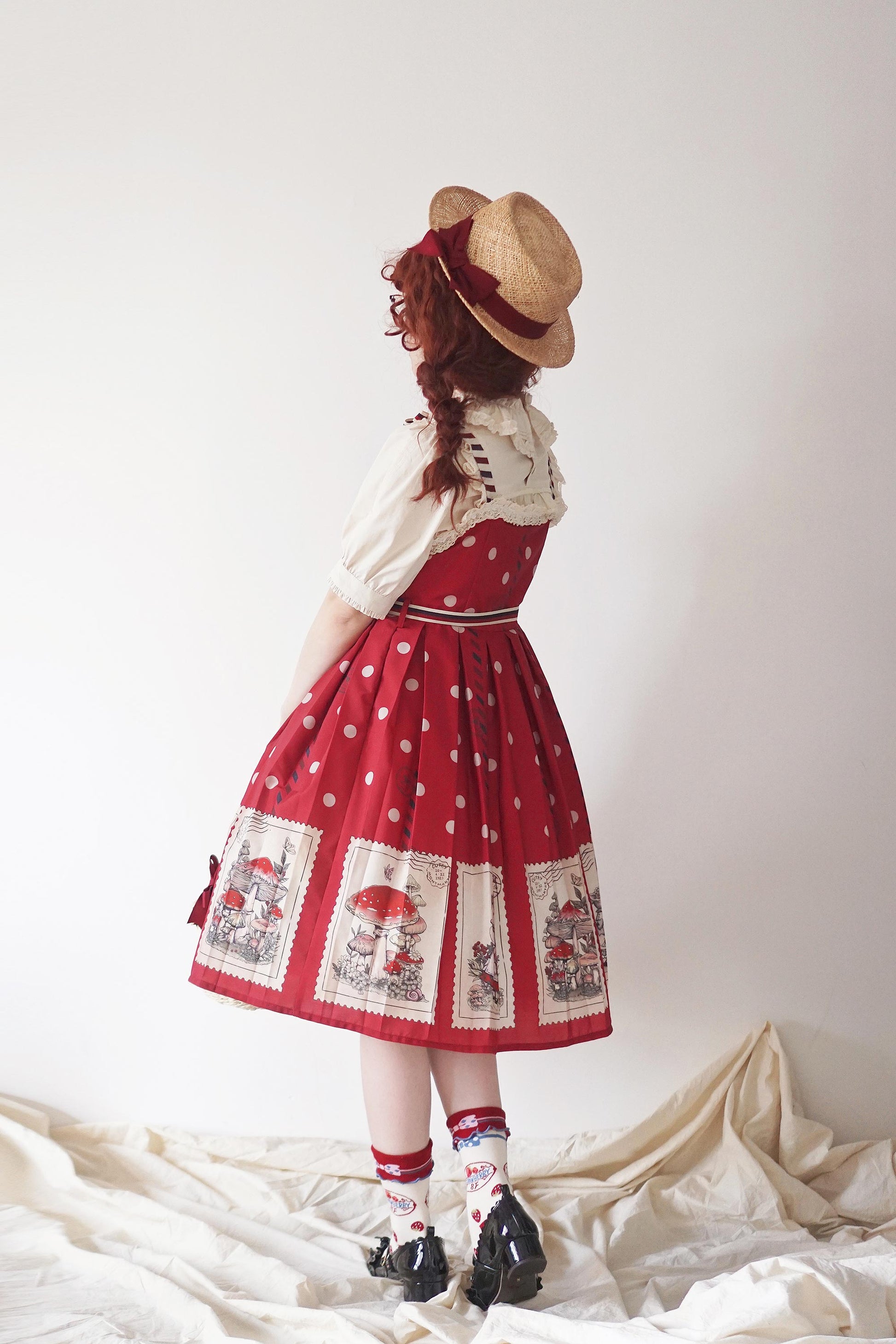 手紙をイメージした、キノコとウサギのアンティークな切手デザインが可愛いジャンパースカート。