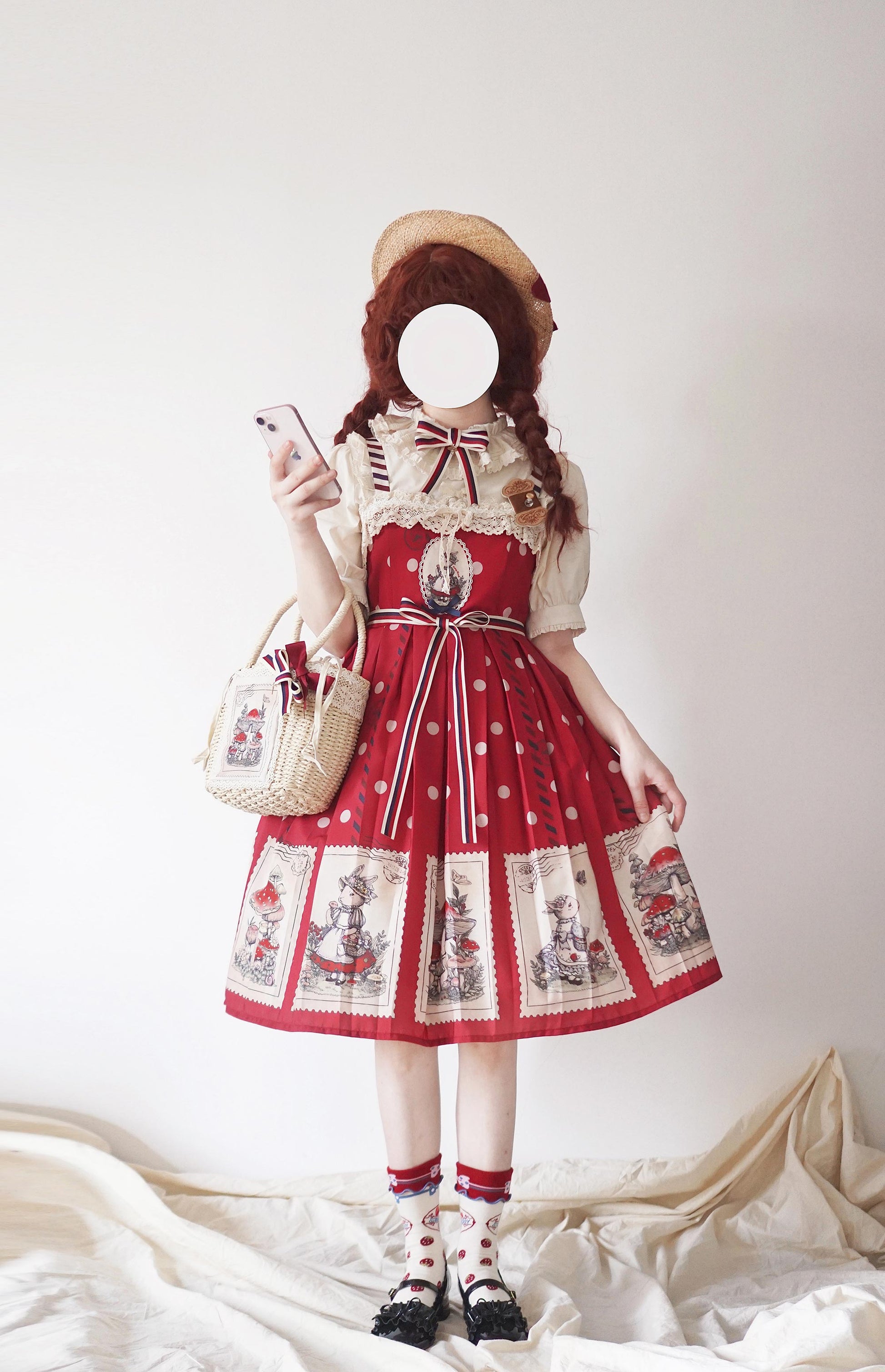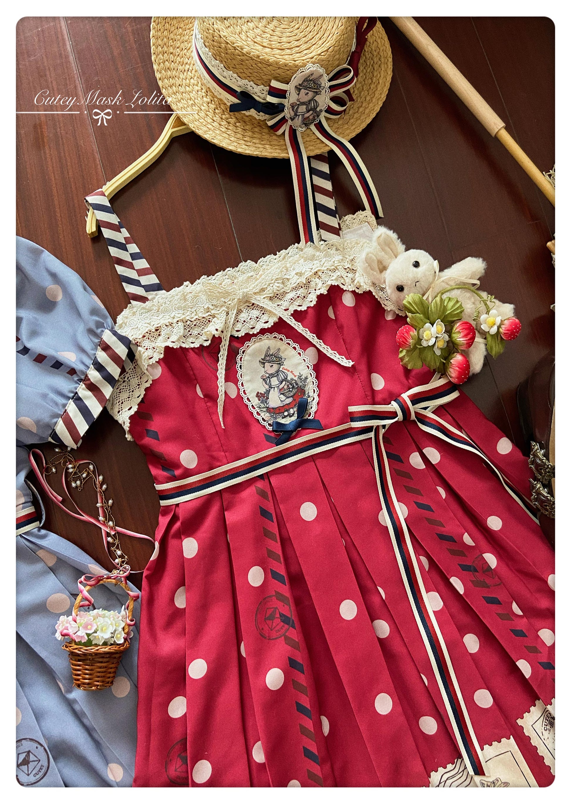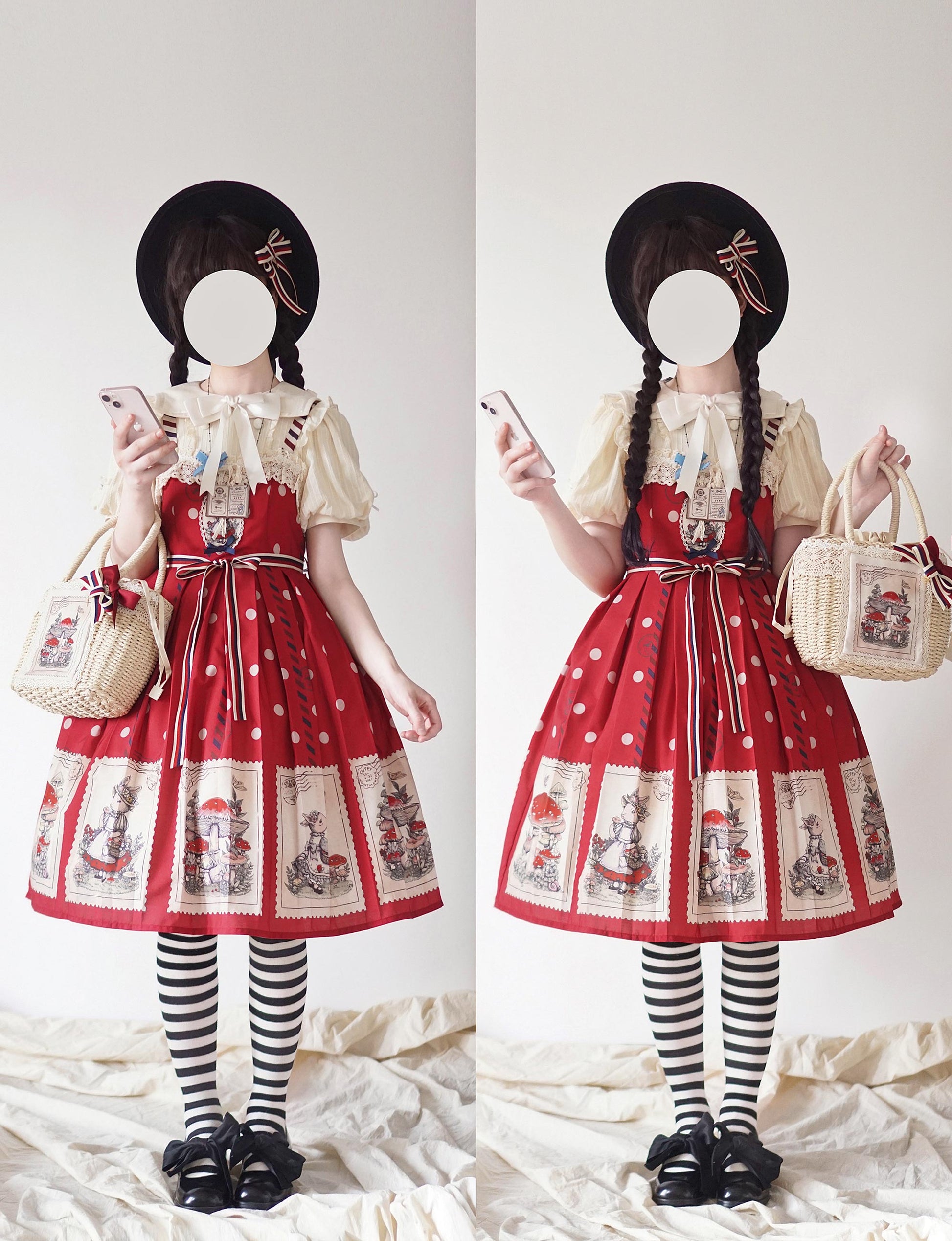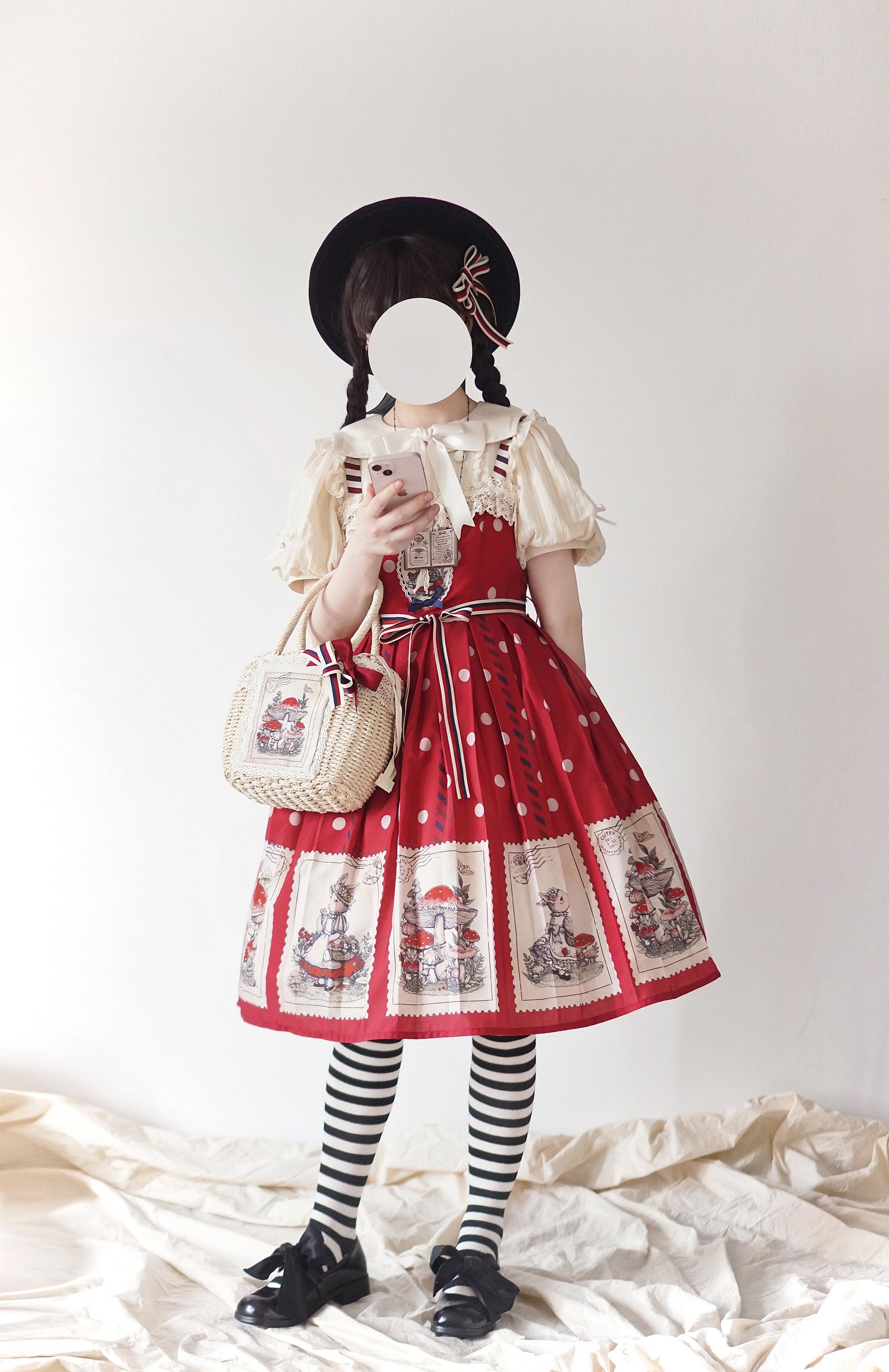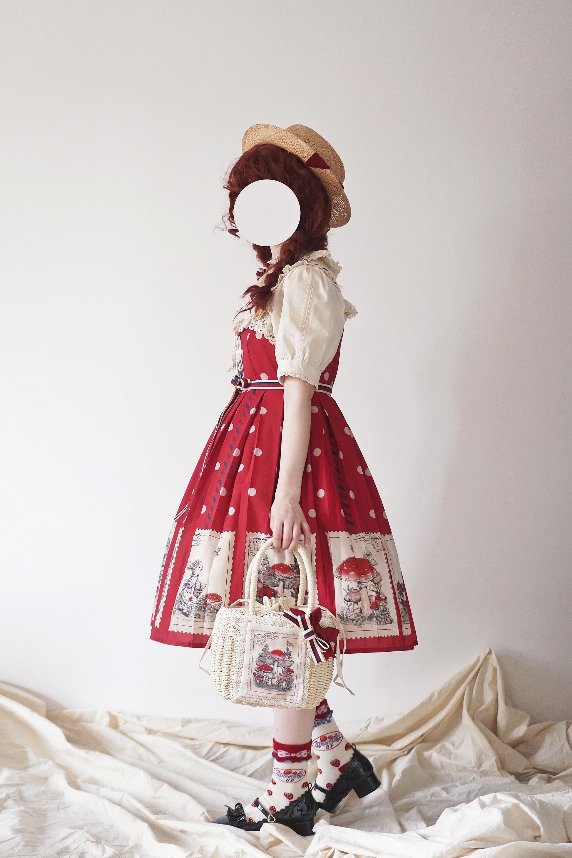 手紙をイメージした、キノコとウサギのアンティークな切手デザインが可愛いジャンパースカート。