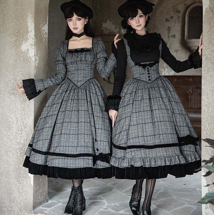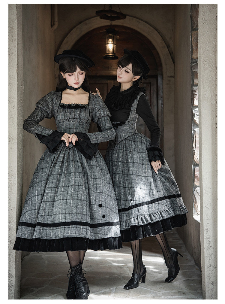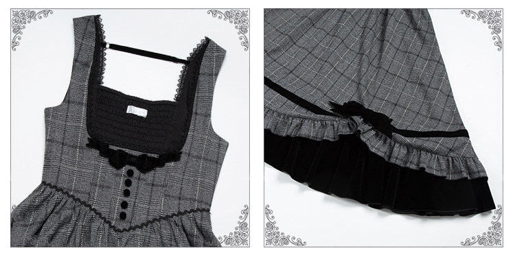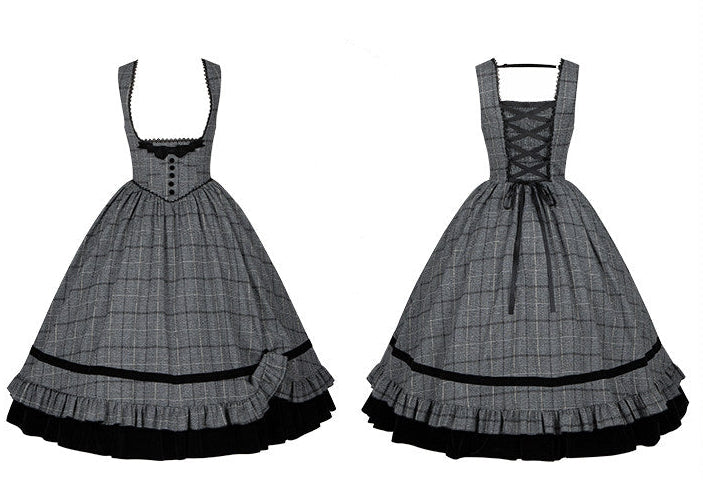 グレーのチェック柄にコルセット風デザインがクラシカルなジャンパースカート。