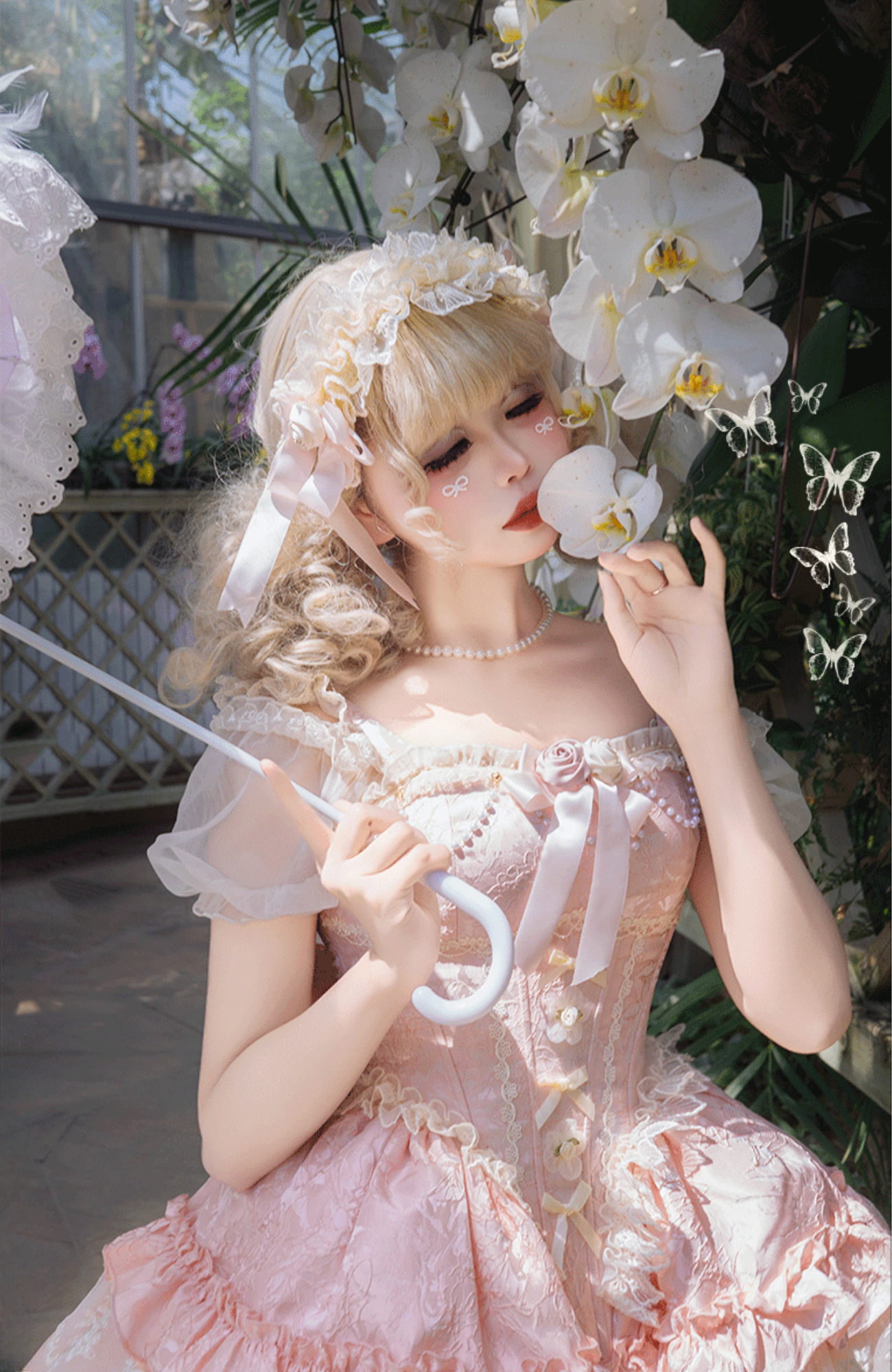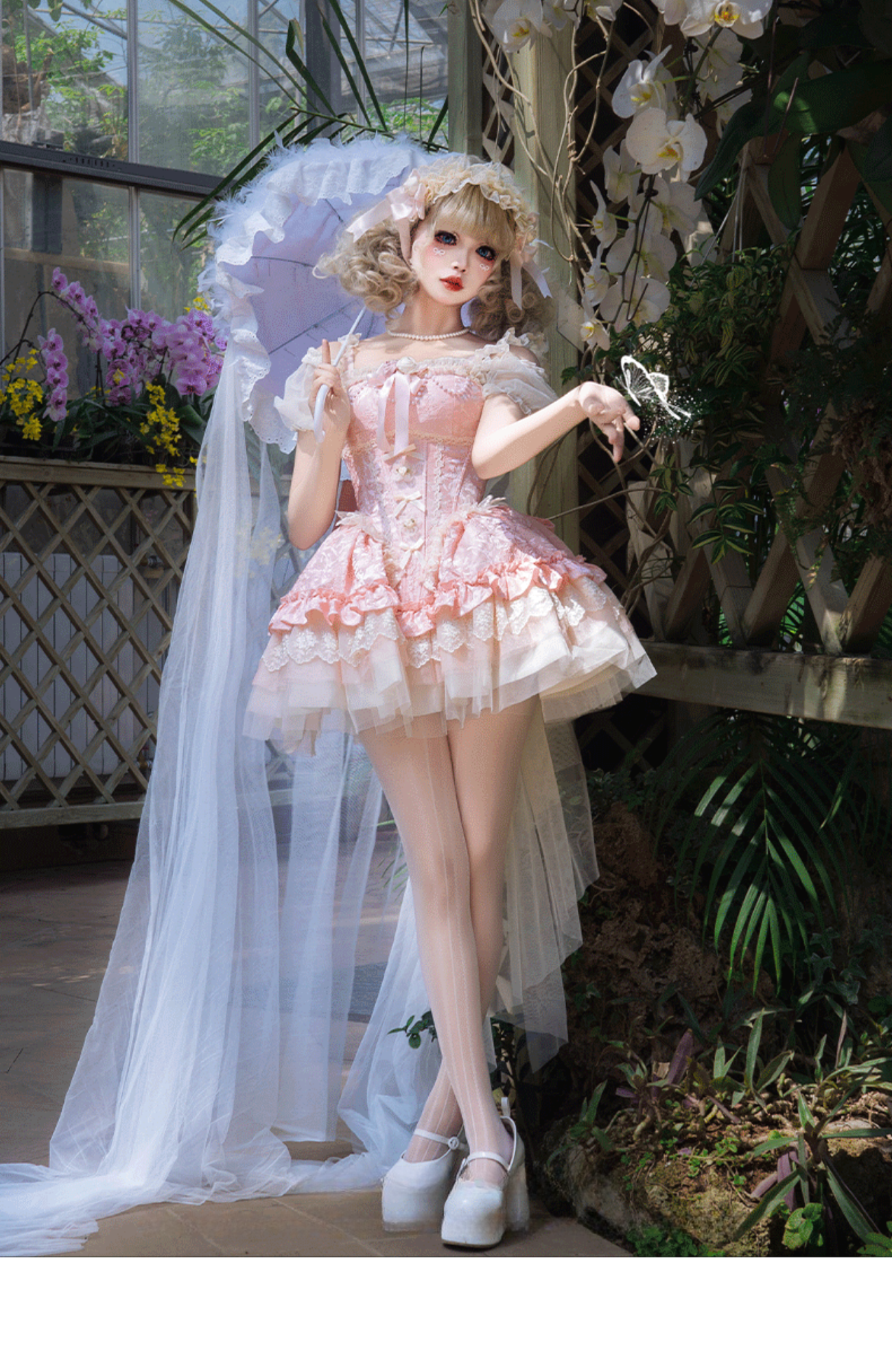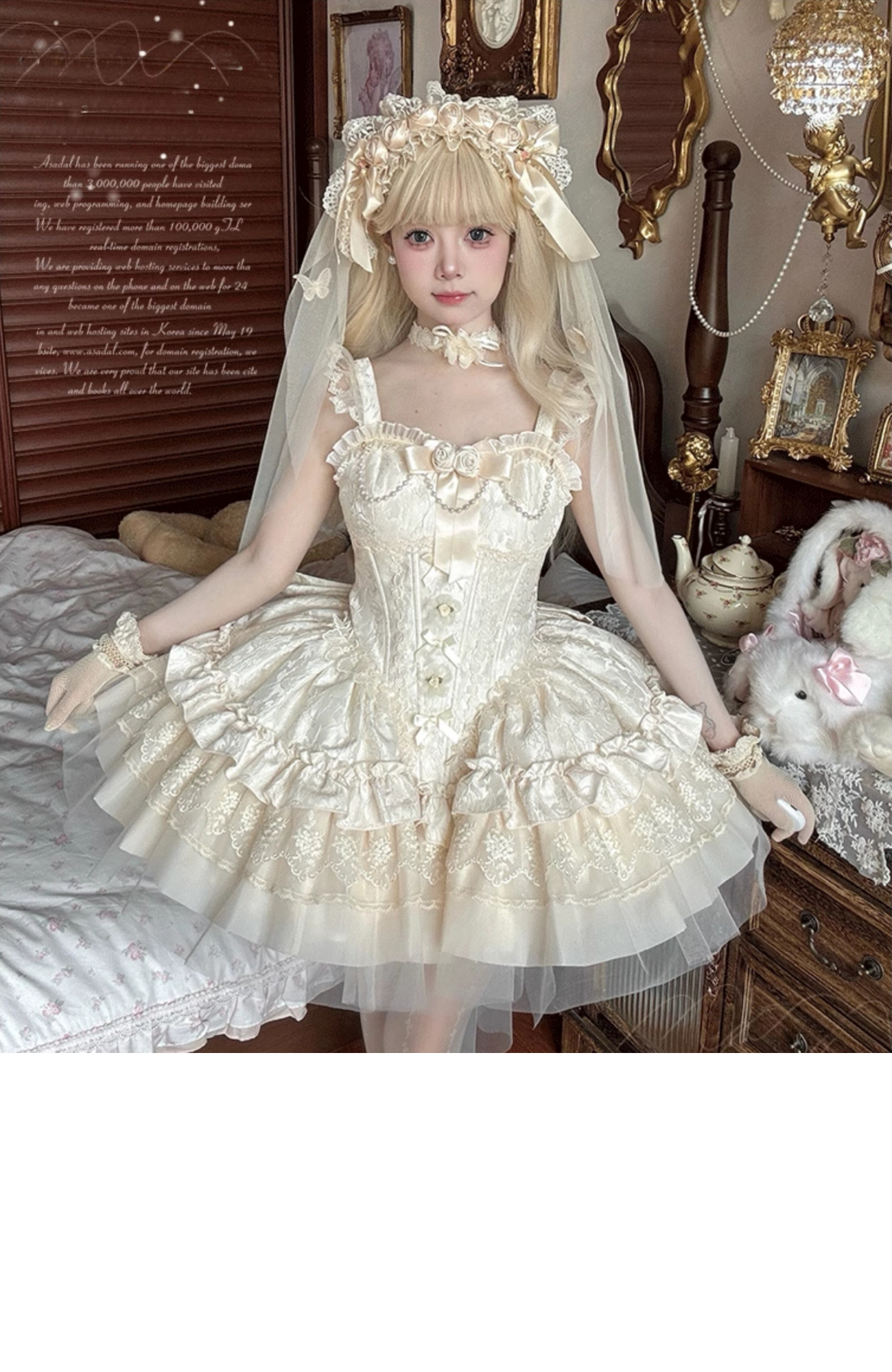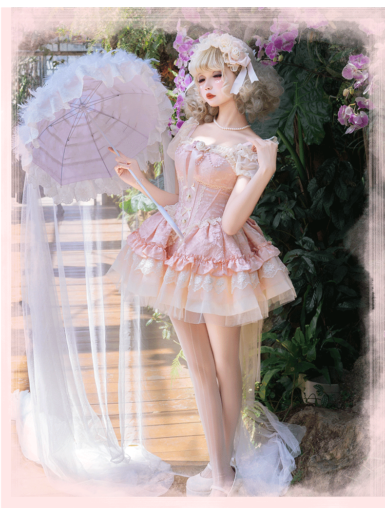 高級感のあるジャガード生地にたっぷりのフリルとレースがあしらわれたジャンパースカート。