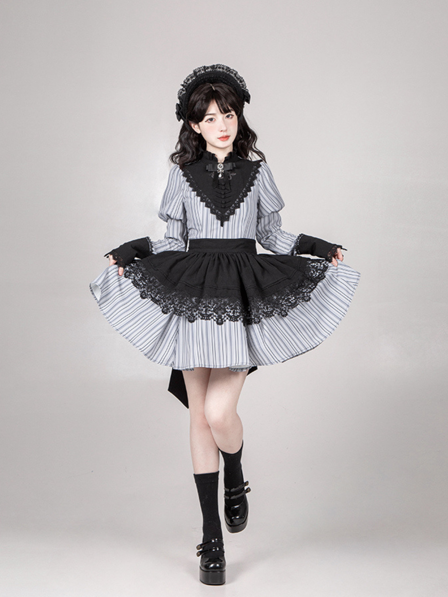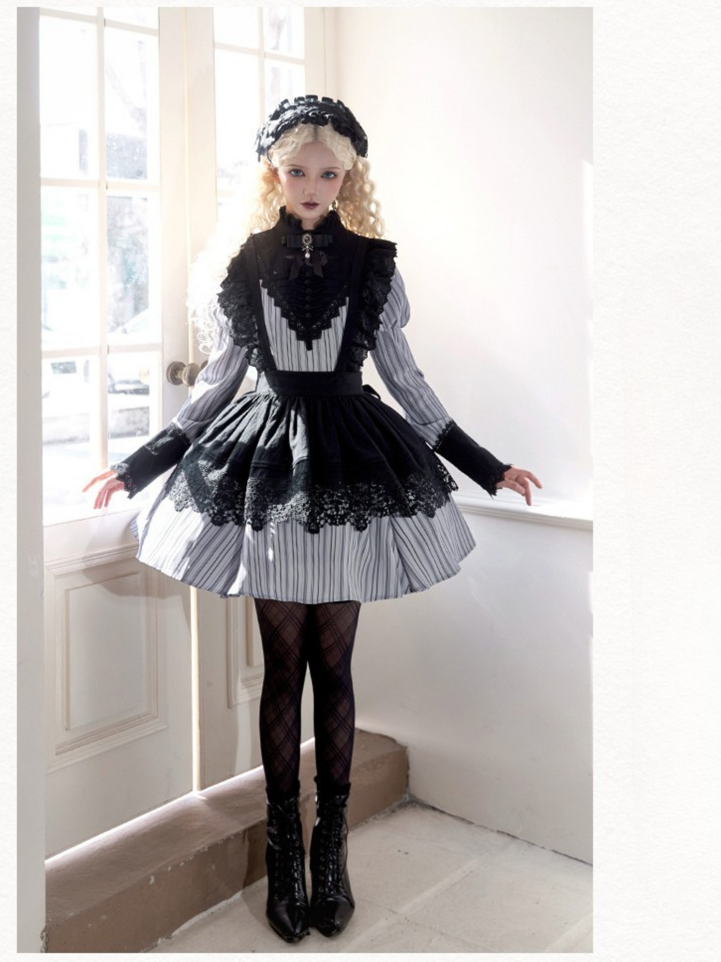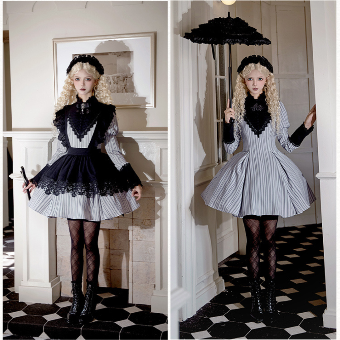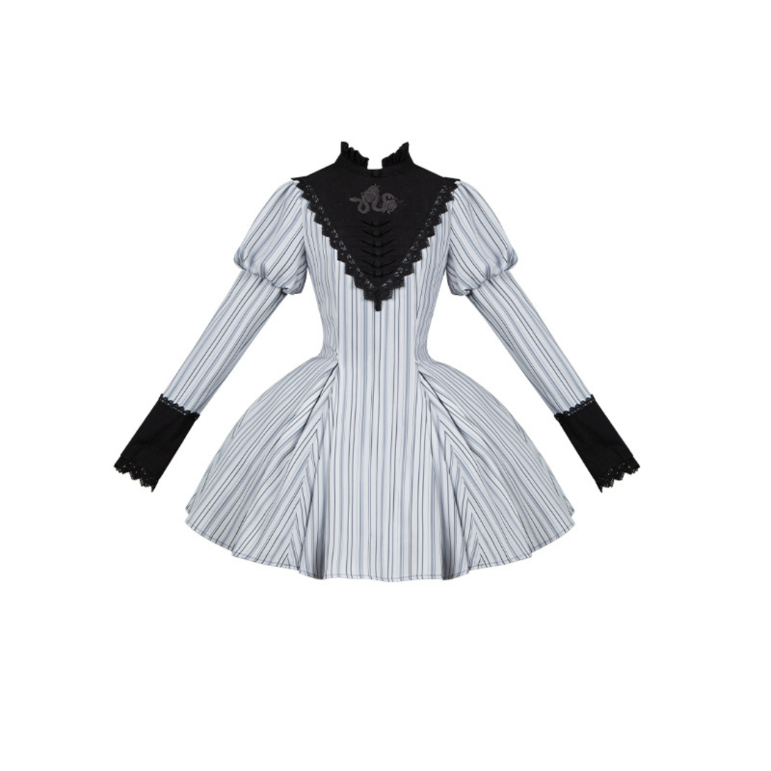 蛇と薔薇刺繍のストライプワンピースとエプロン ショート丈
