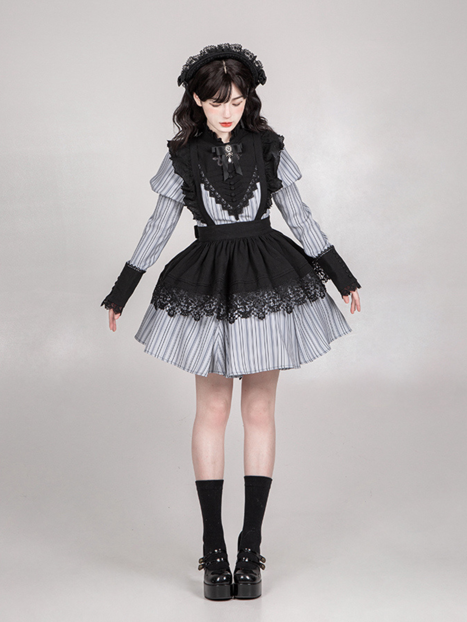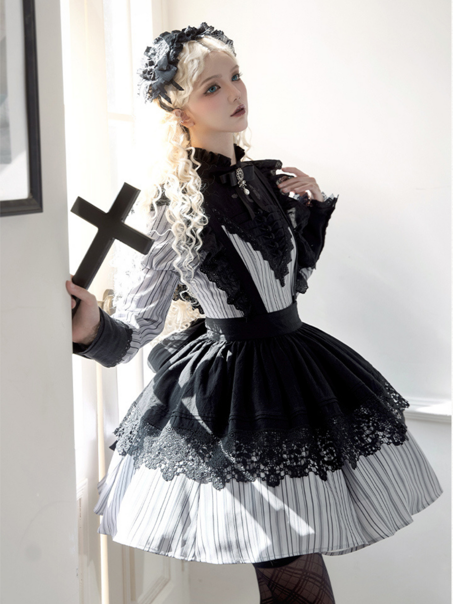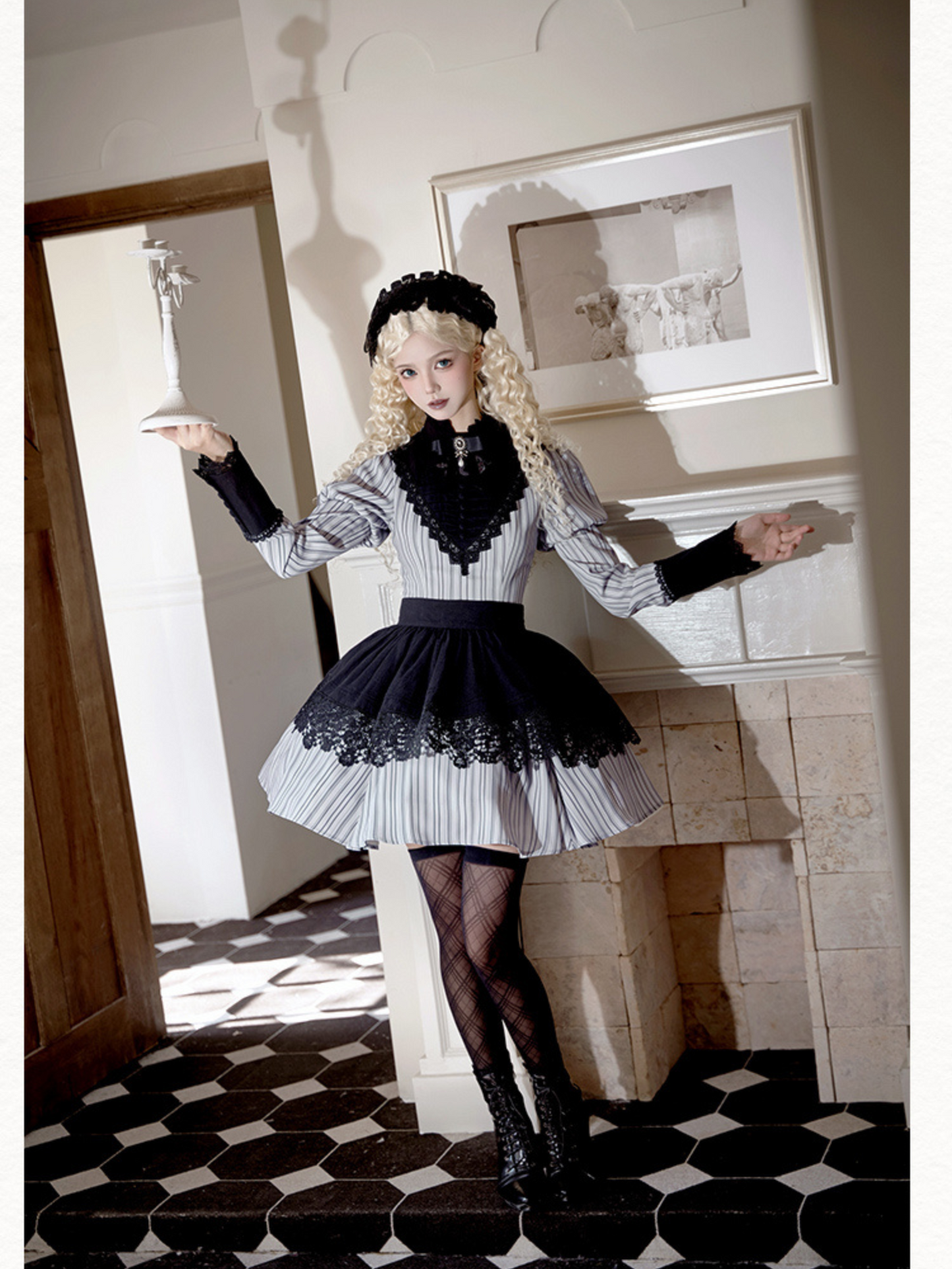 蛇と薔薇刺繍のストライプワンピースとエプロン ショート丈