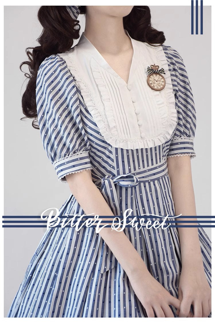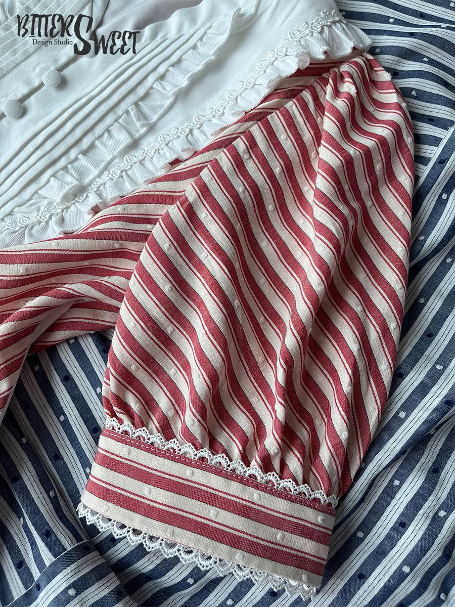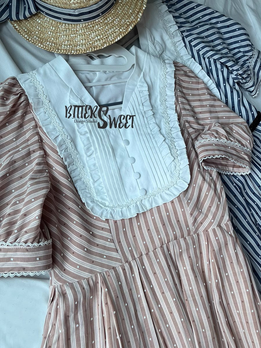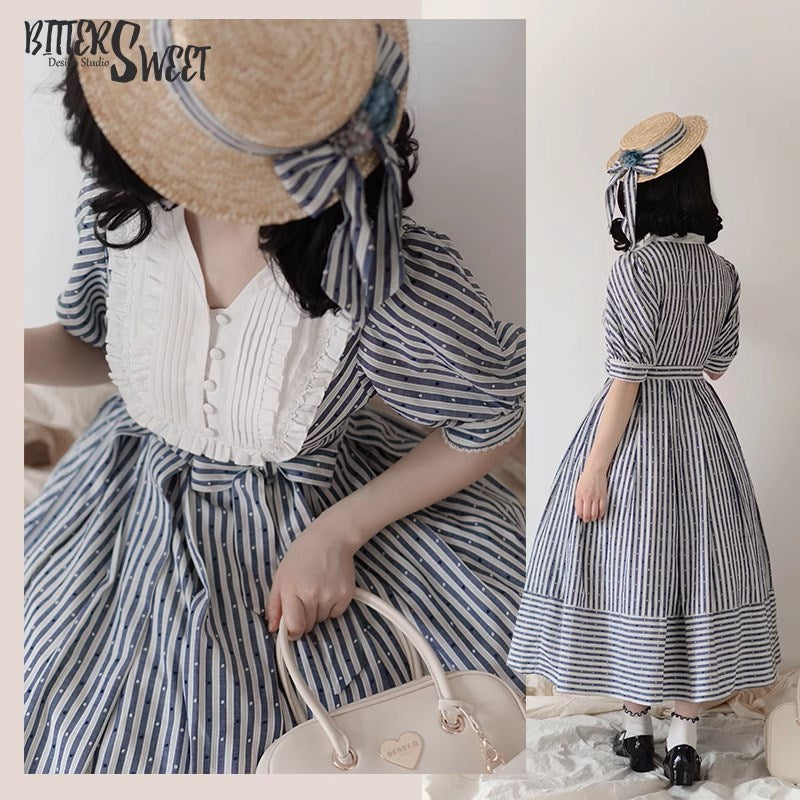 ドットがあしらわれた涼しげなストライプ生地が夏にぴったり。控えめなフリルづかいで甘過ぎないクラシカルコーデに💓